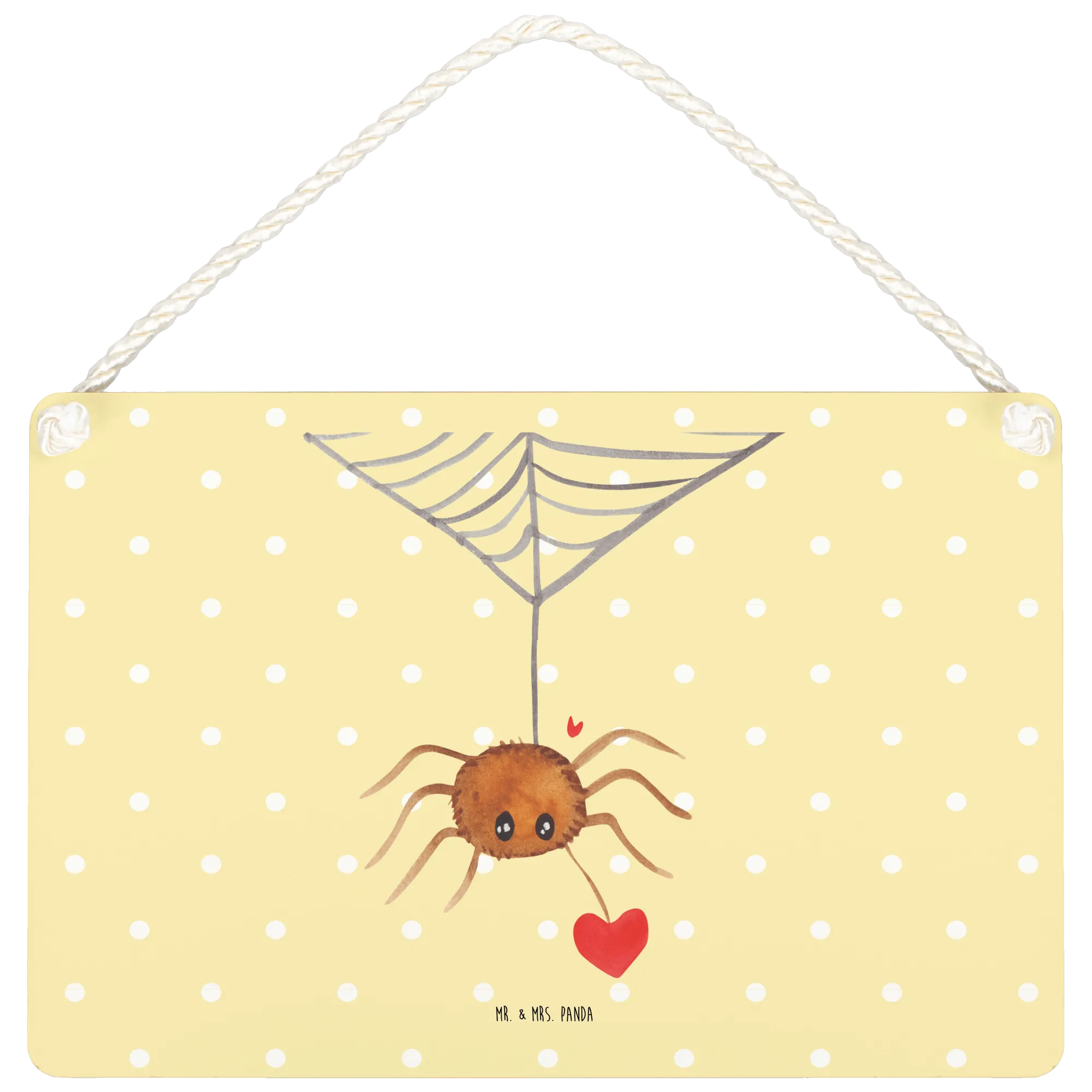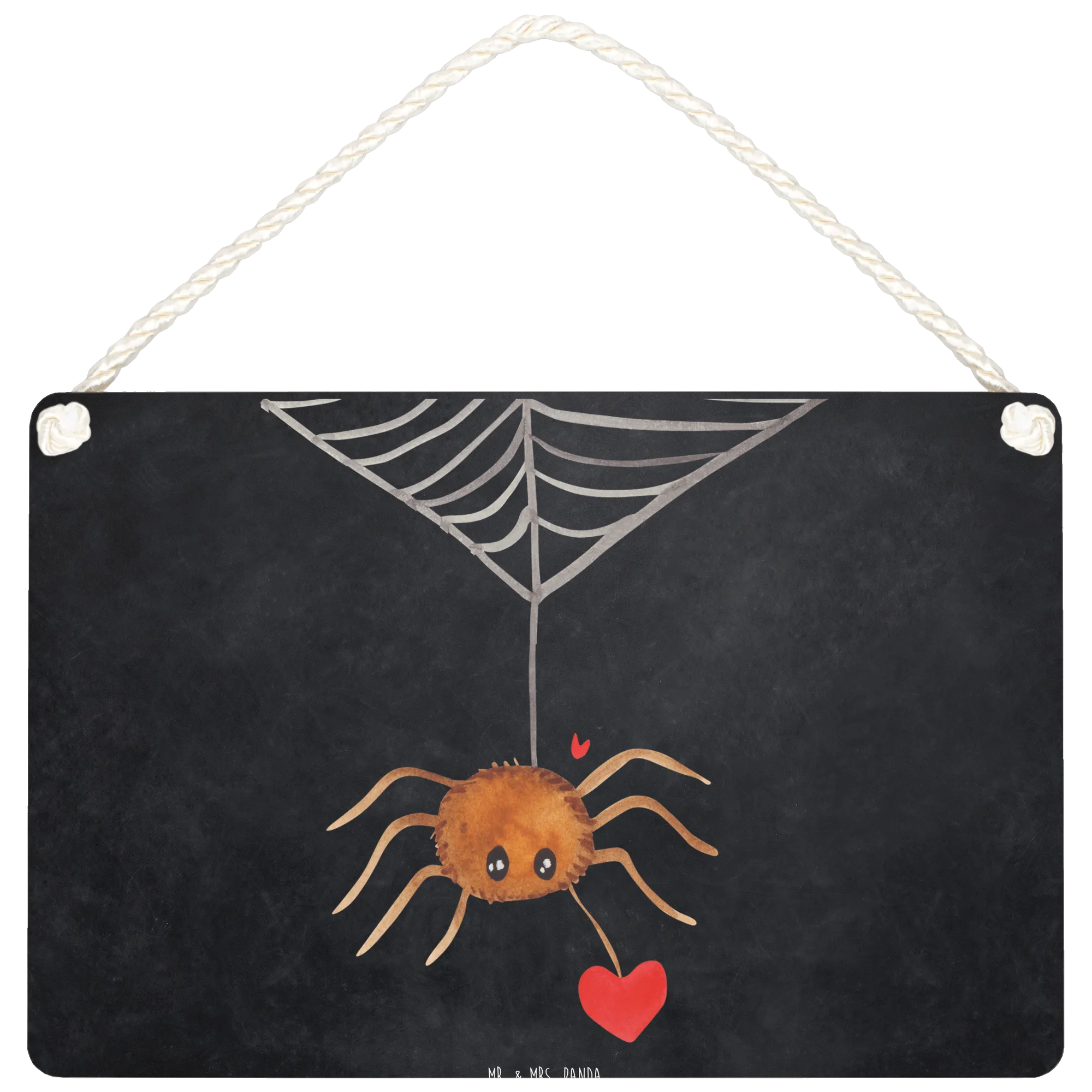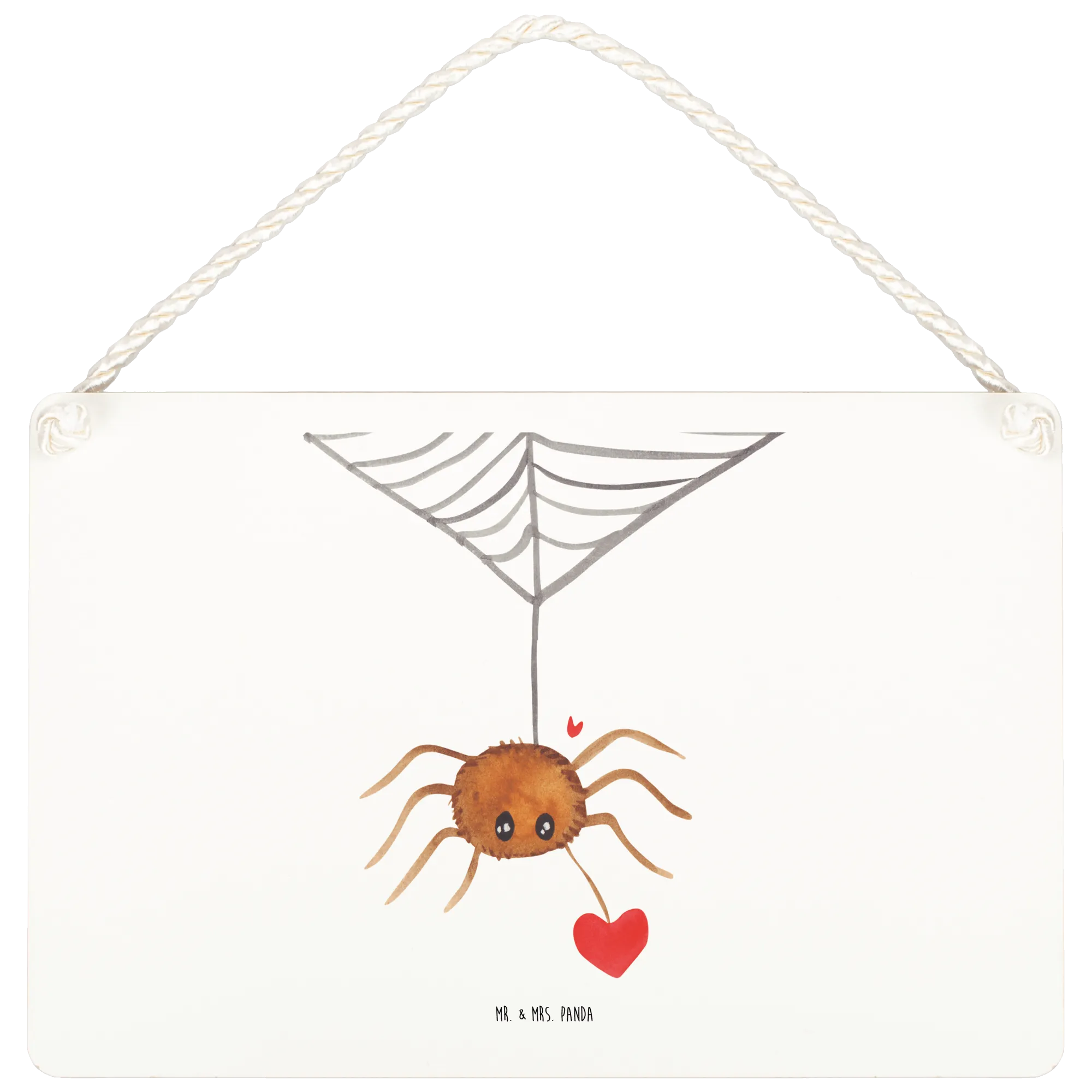 The design features Spider Agathe nestled alongside a heart, encapsulating the sweet essence of love in a charming manner. The phrase 'Du bist mir ins Netz gegangen...' — meaning 'You've caught me in your web...' — beautifully captures that moment of falling in love, while the artistry of Mrs. Panda adds a playful vibe. This makes the sign not just a decoration, but a genuine expression of your feelings.