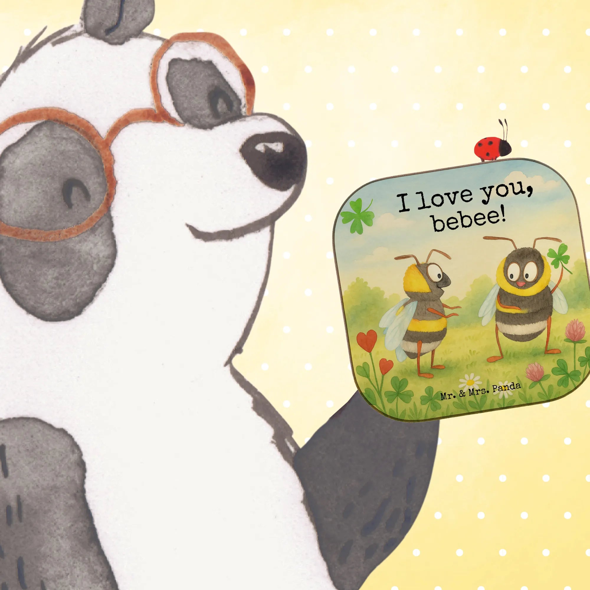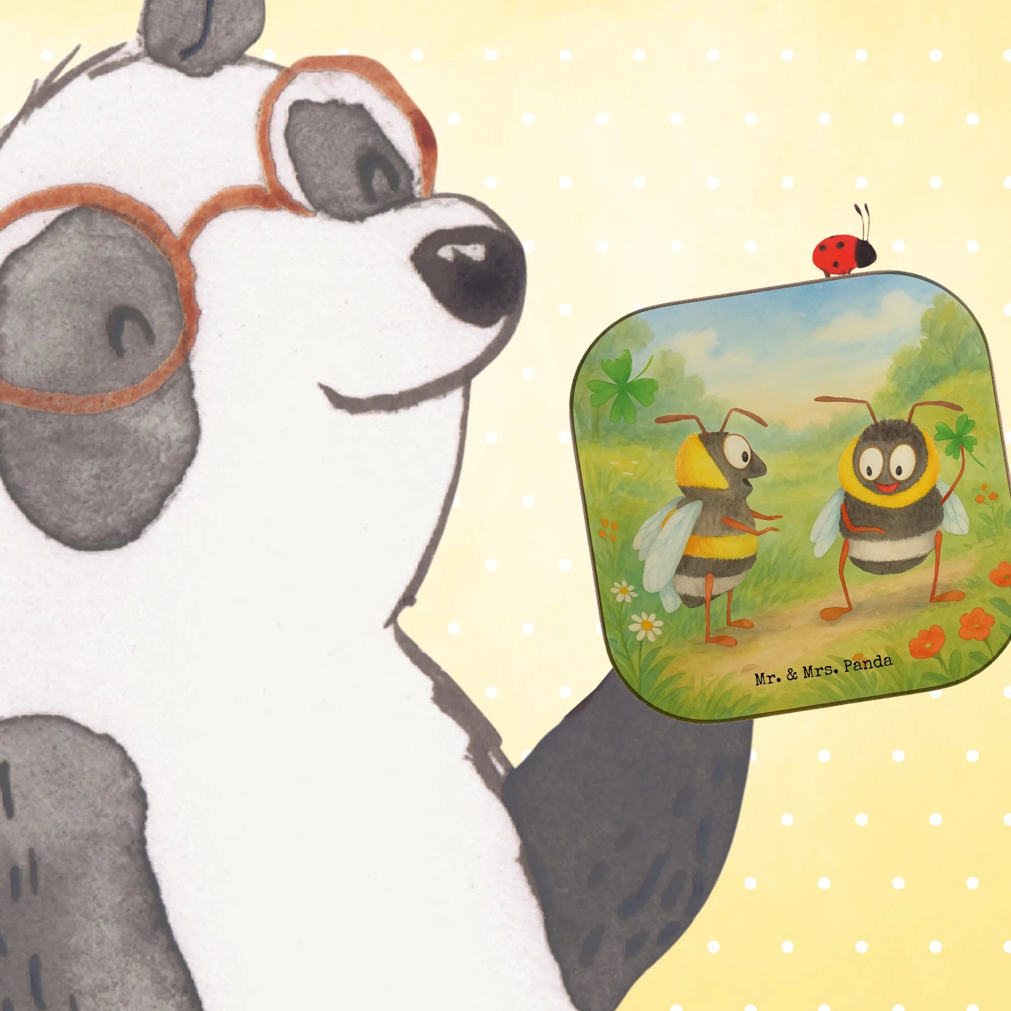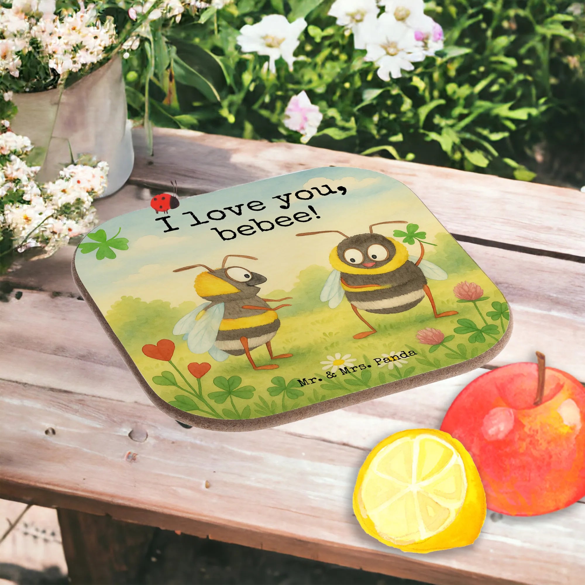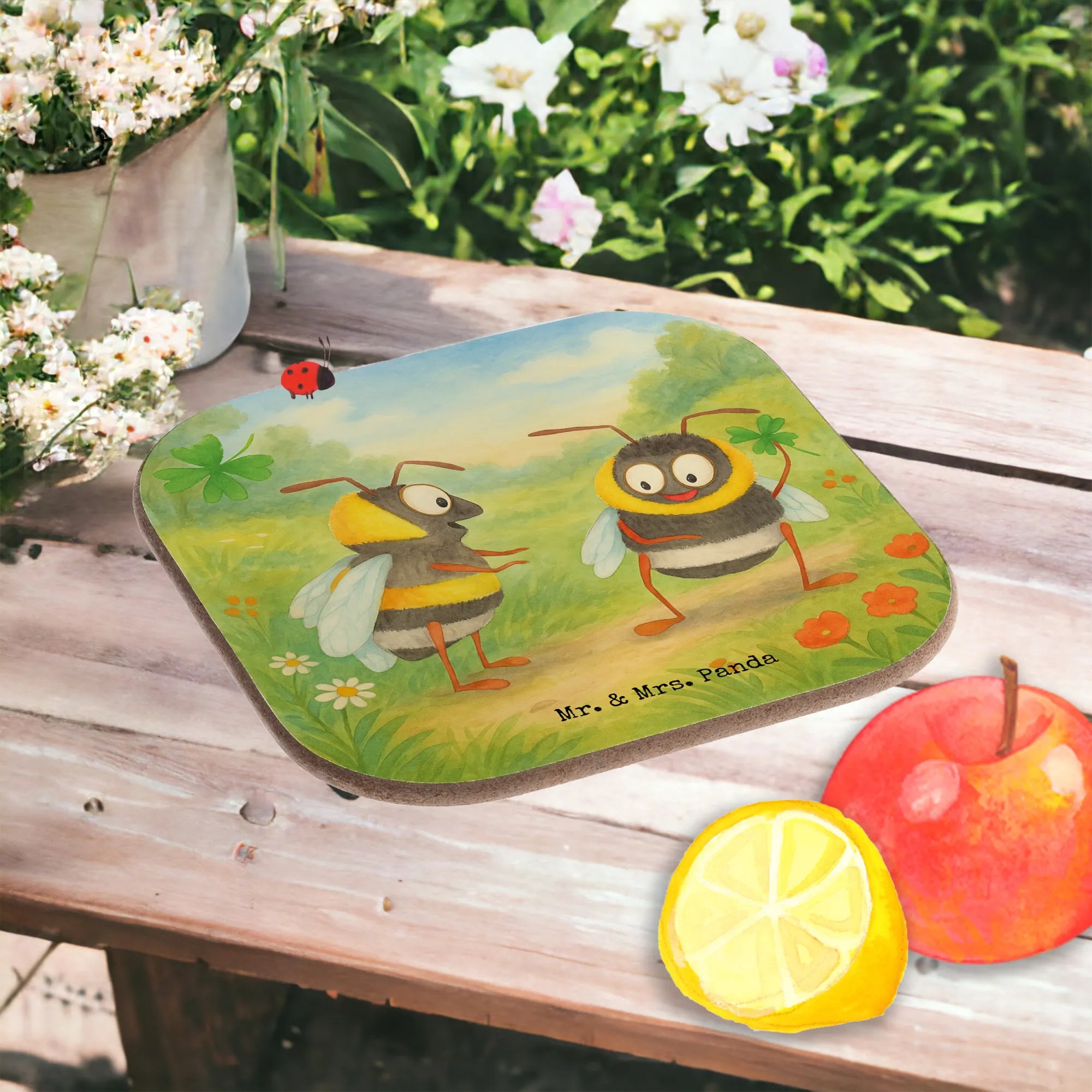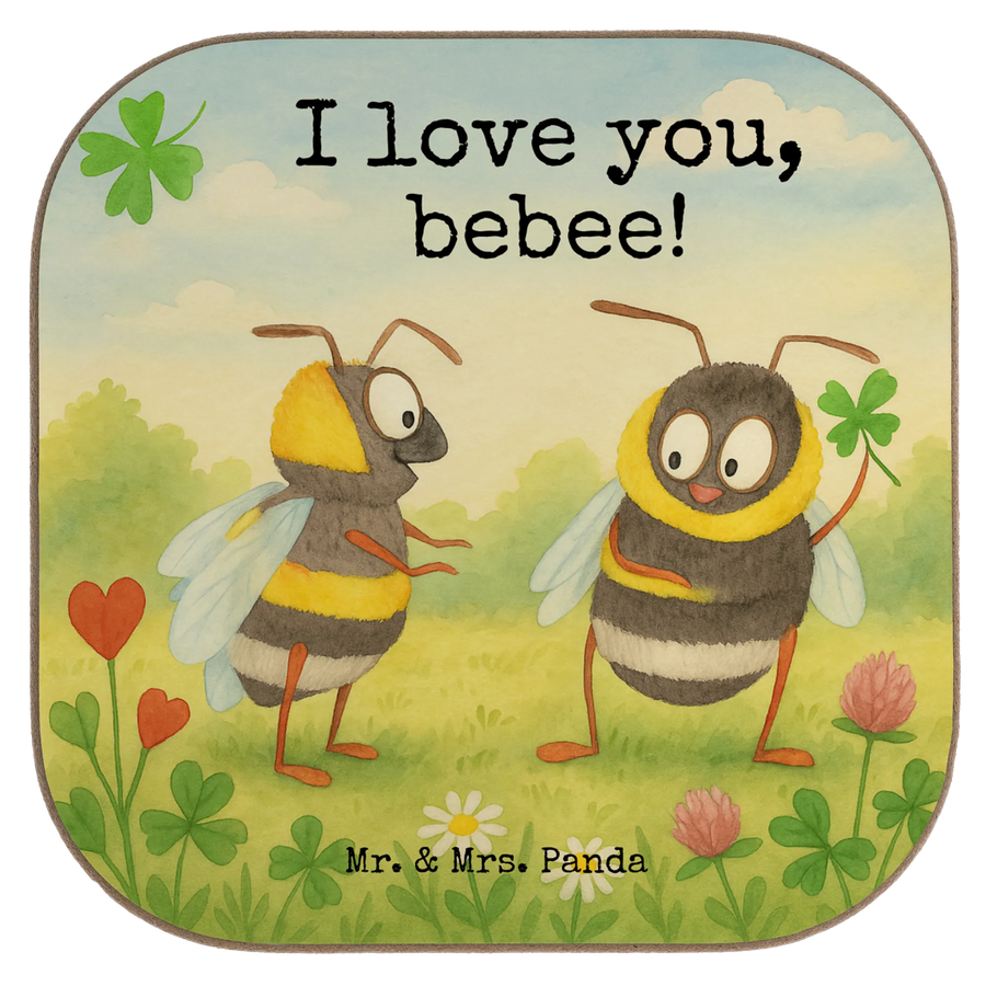 Ein liebevoller Untersetzer von Mr. & Mrs. Panda: Das Motiv „Bienen Paar“ zeigt zwei niedliche Bienen, die Zuneigung, Freude und Verbundenheit ausstrahlen. Die eine Biene hält ein vierblättriges Kleeblatt, die andere schaut mit großen, freundlichen Augen – ein kleines Kunstwerk, das perfekt als Liebesgeschenk geeignet ist.