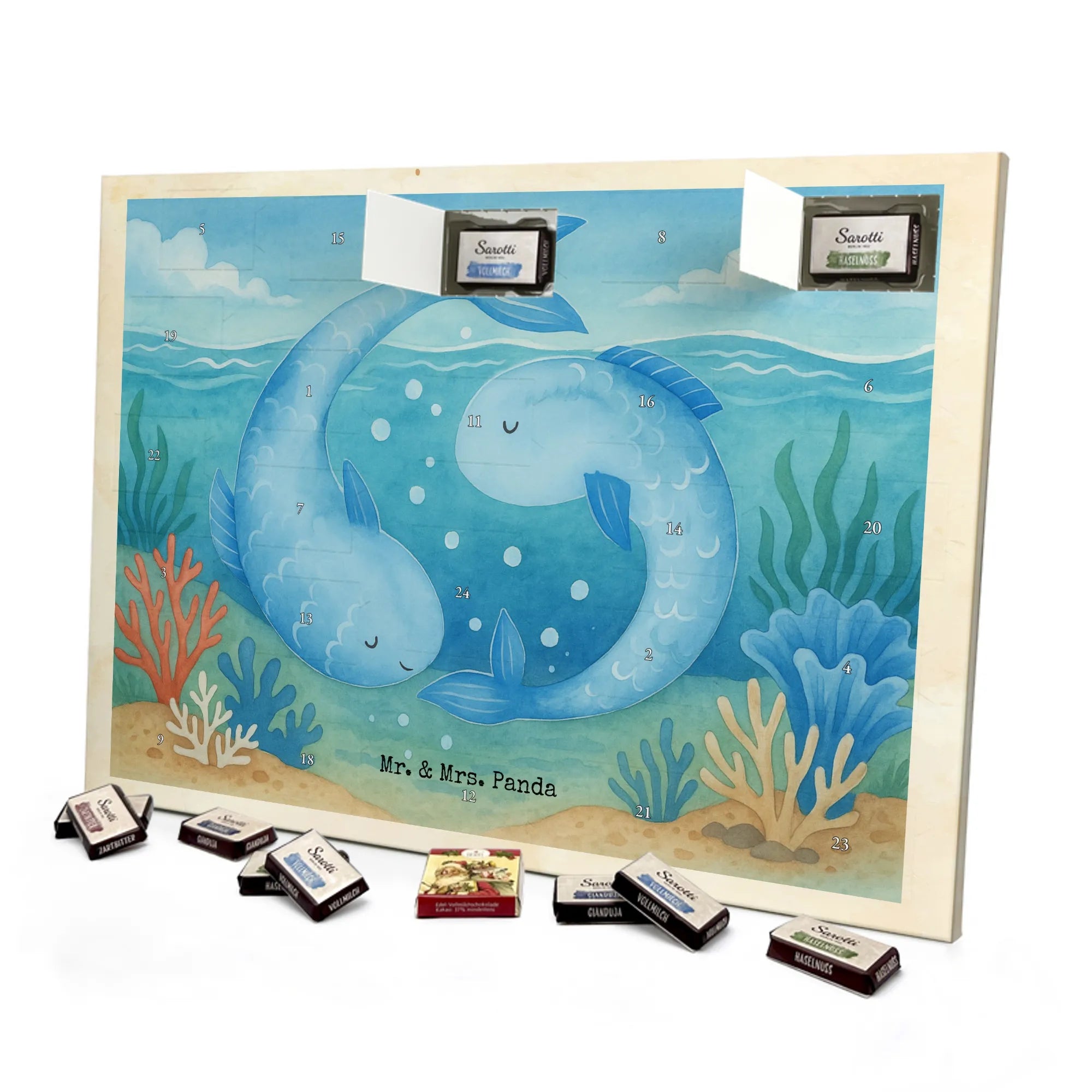 Mr. & Mrs. Panda Schoko Adventskalender Sternzeichen Fische – ein liebevoll gestalteter Schokoladen Adventskalender für alle, die verträumt und empathisch durchs Leben schwimmen. Die zwei handgezeichneten Fische im Aquarellstil bringen Farbe und Charme in die Adventszeit und machen diesen Weihnachtskalender Schokolade zu einem besonderen Geschenk.