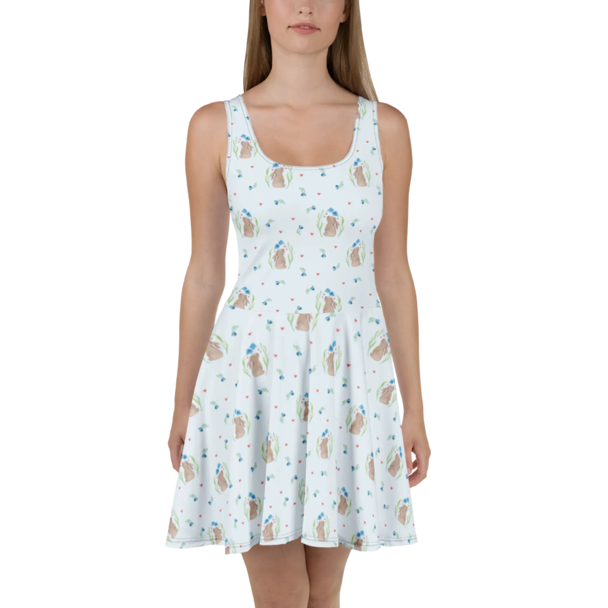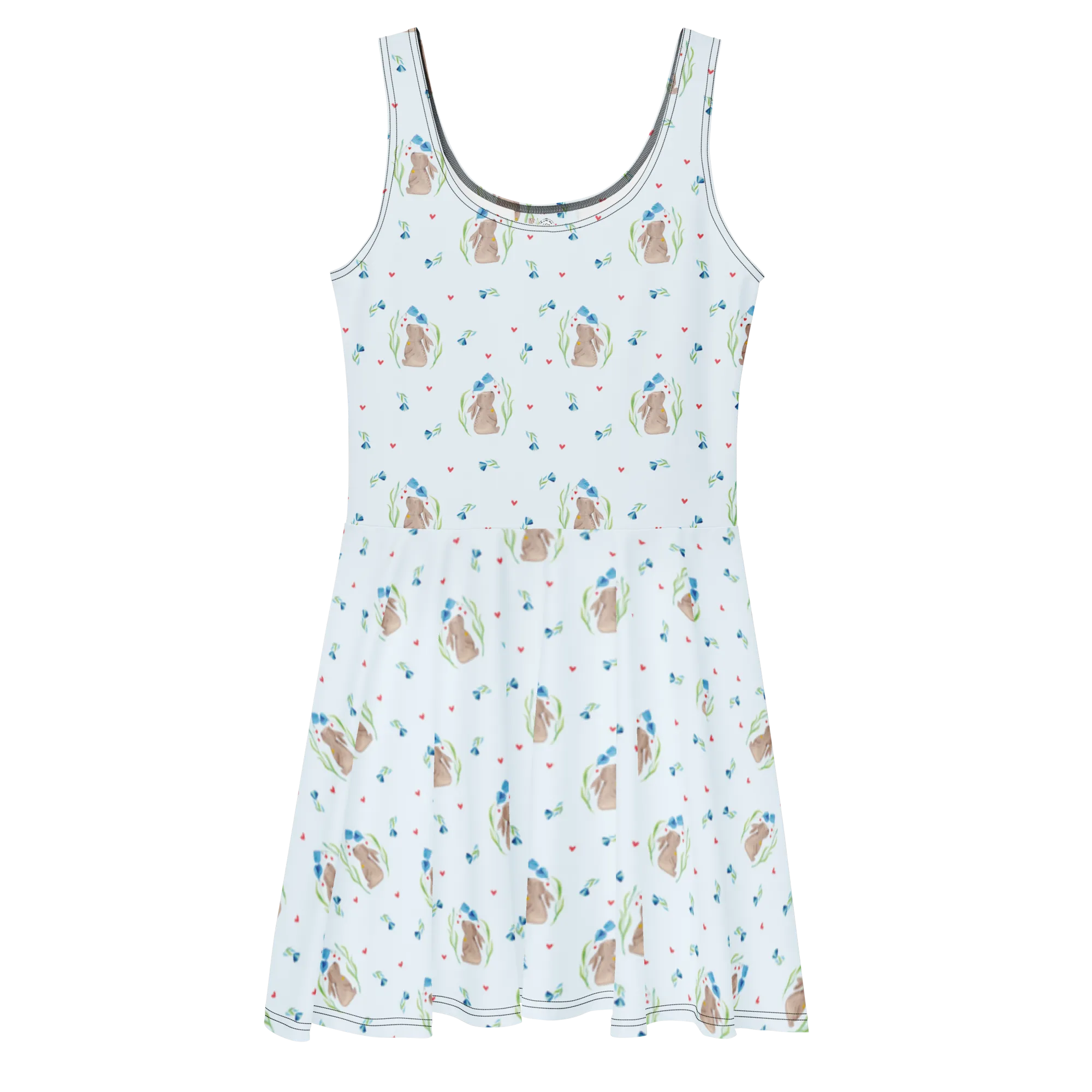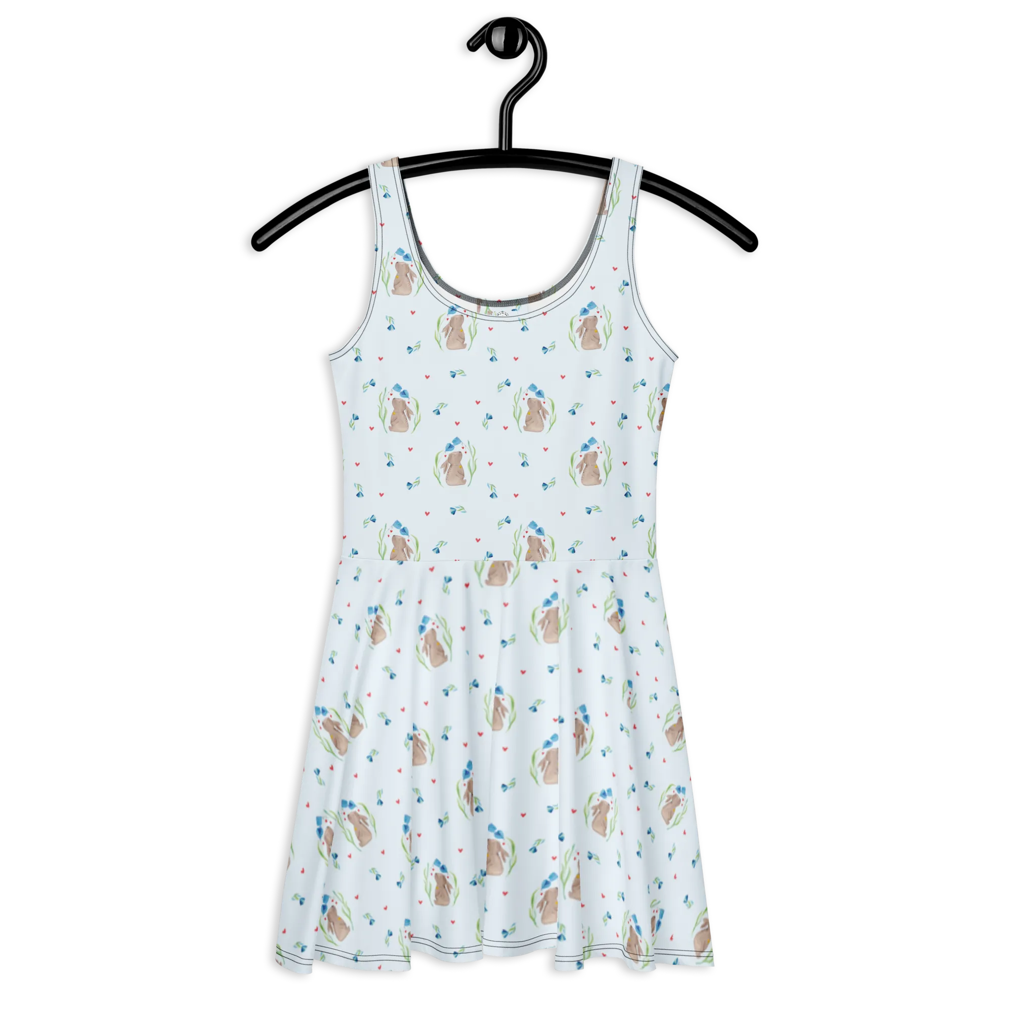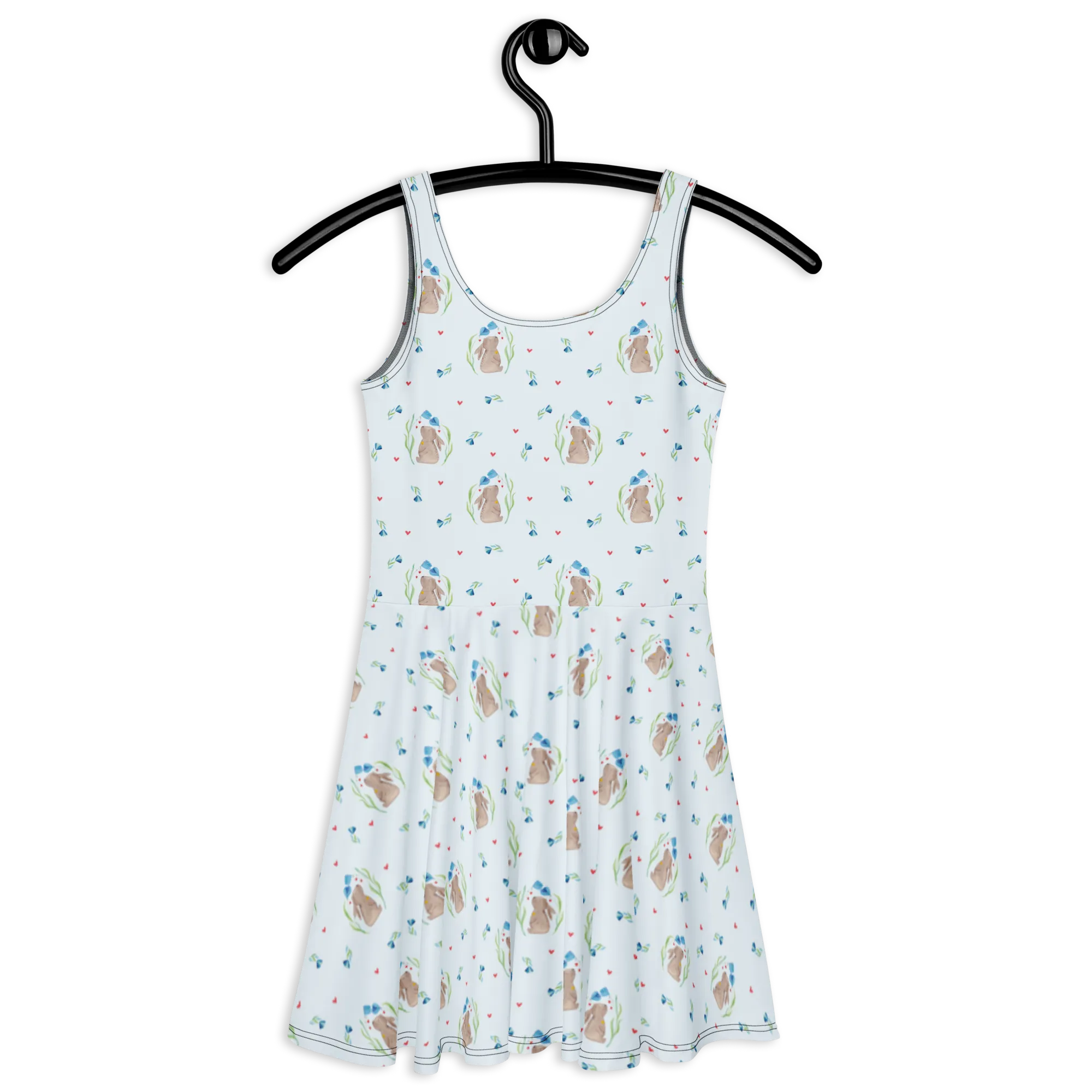 Mr. & Mrs. Panda Sommerkleid „Hase Blume“ – ein verspieltes Skaterkleid aus unserer liebevollen Ostern - Kollektion, das Frühlingsfreude und zarte Träume verbindet. 🐰🌸 Das Motiv zeigt einen süßen Hasen zwischen bunten Blumen, mit einem kleinen Glöckchen um den Hals. Ideal für Ostern, Familienfeiern, Taufen und besondere Anlässe.