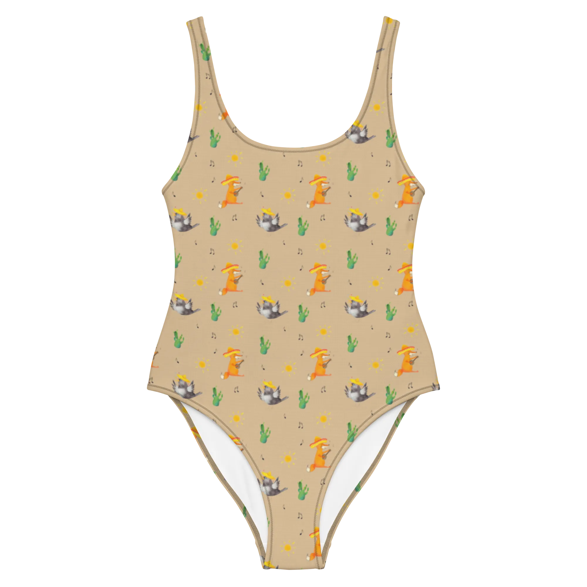 Designed for comfort and style, this swimsuit is made from high-quality polyester and elastane, ensuring a fit that flatters your body while allowing for easy movement during your fun in the sun. The combination of these materials makes it perfect for swimming, lounging, or even indulging in beach games. The appealing beige background makes the vibrant design pop, ensuring you’ll be the center of attention wherever you go.