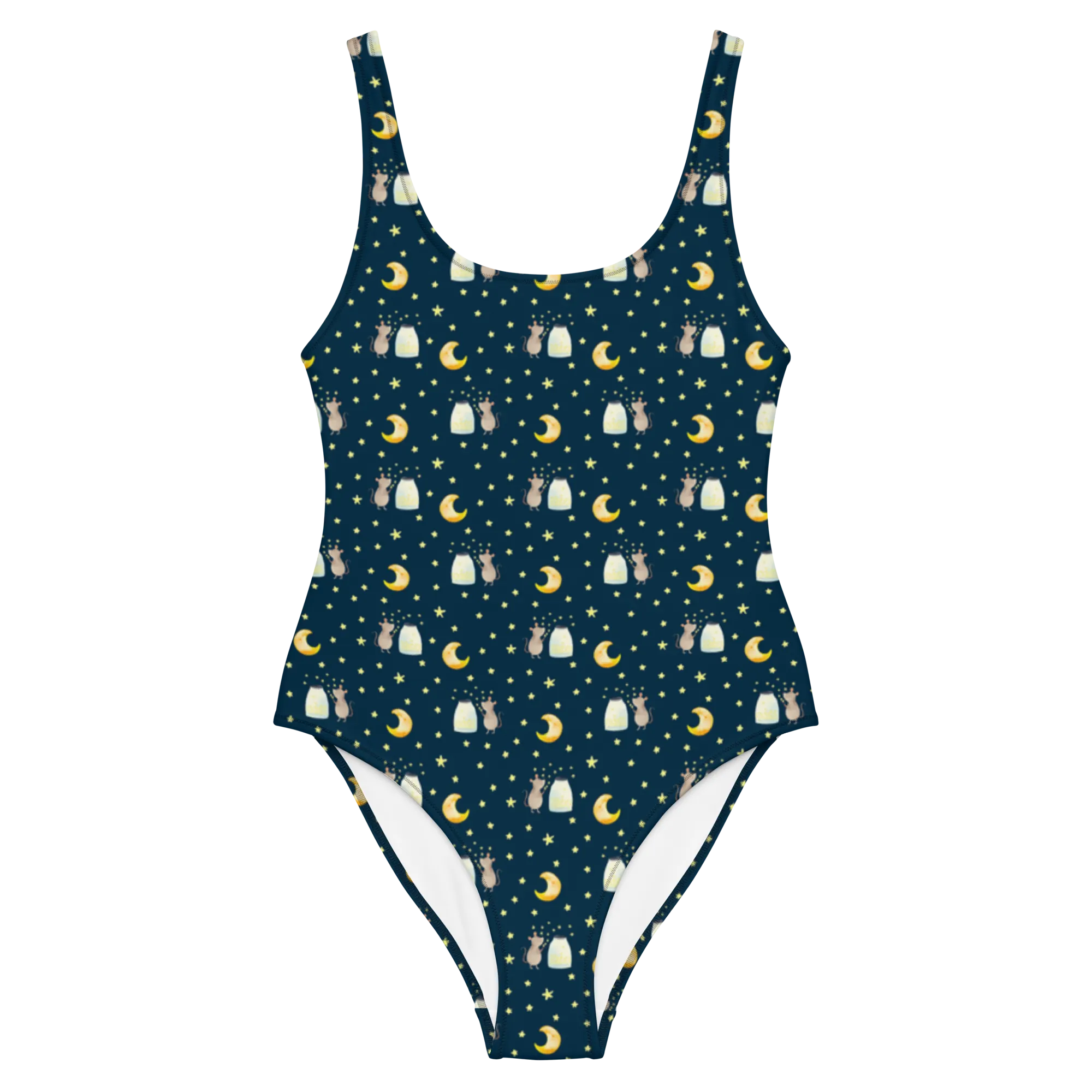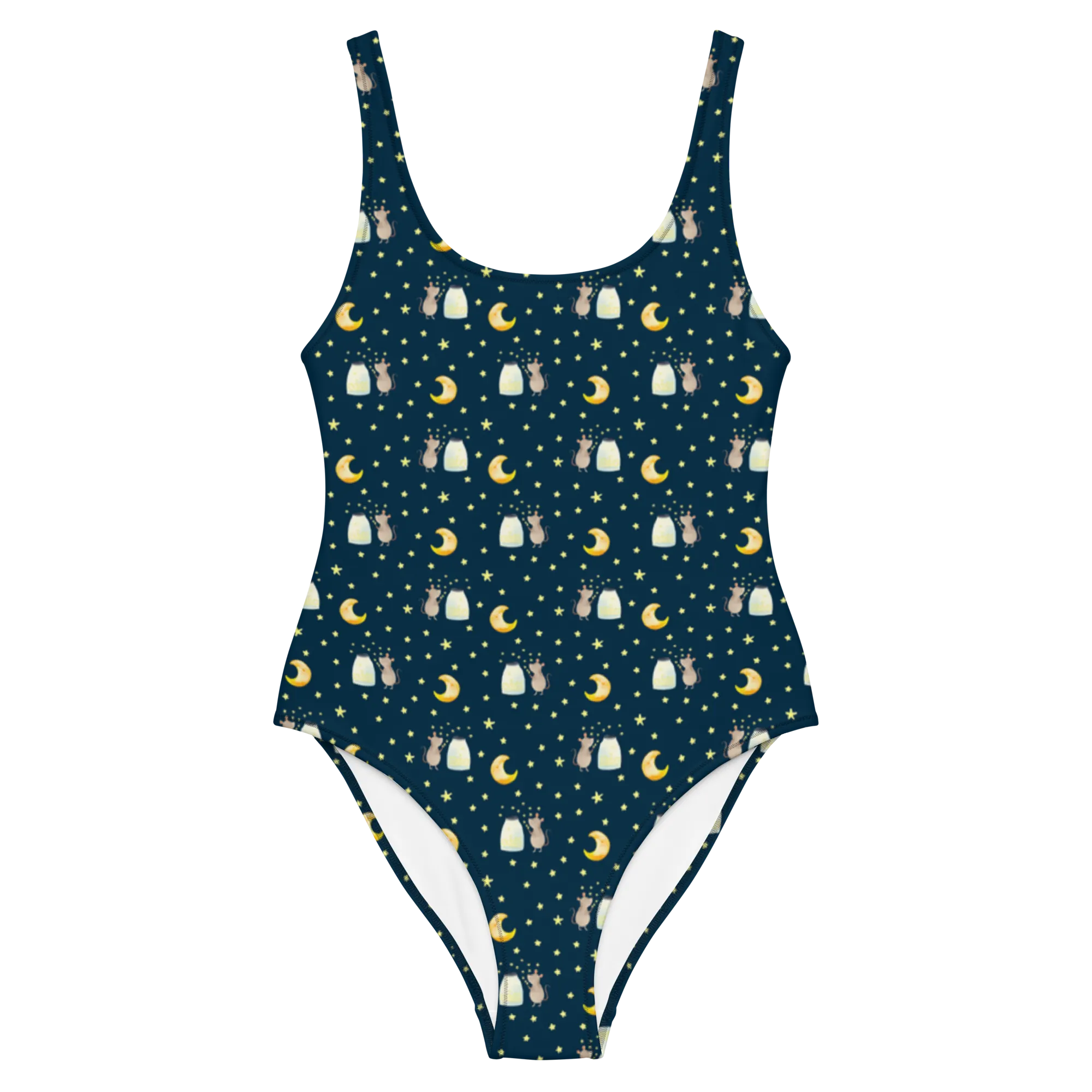 Featuring a whimsical design of a sweet little mouse sitting before a glass of twinkling stars, this swimsuit brings joy to any child as they splash and play in water. Crafted from a blend of high-quality polyester and elastane, this swimsuit promises comfort and durability, making it perfect for swimming lessons, beach days, or cozy family pool parties.