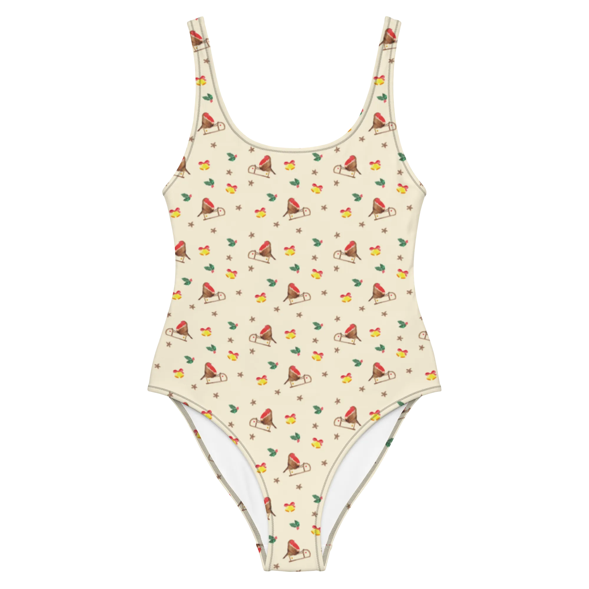This luxurious swimsuit, complete with a hand-drawn motif of a charming robin riding a wooden sleigh, is not just a piece of swimwear; it's a statement of joy and celebration during the wonderful winter and Christmas season. Made from a high-quality blend of polyester and elastane, this swimsuit is soft, stretchy, and perfect for all your holiday adventures, whether it's lounging by the pool or splashing around at a winter resort.