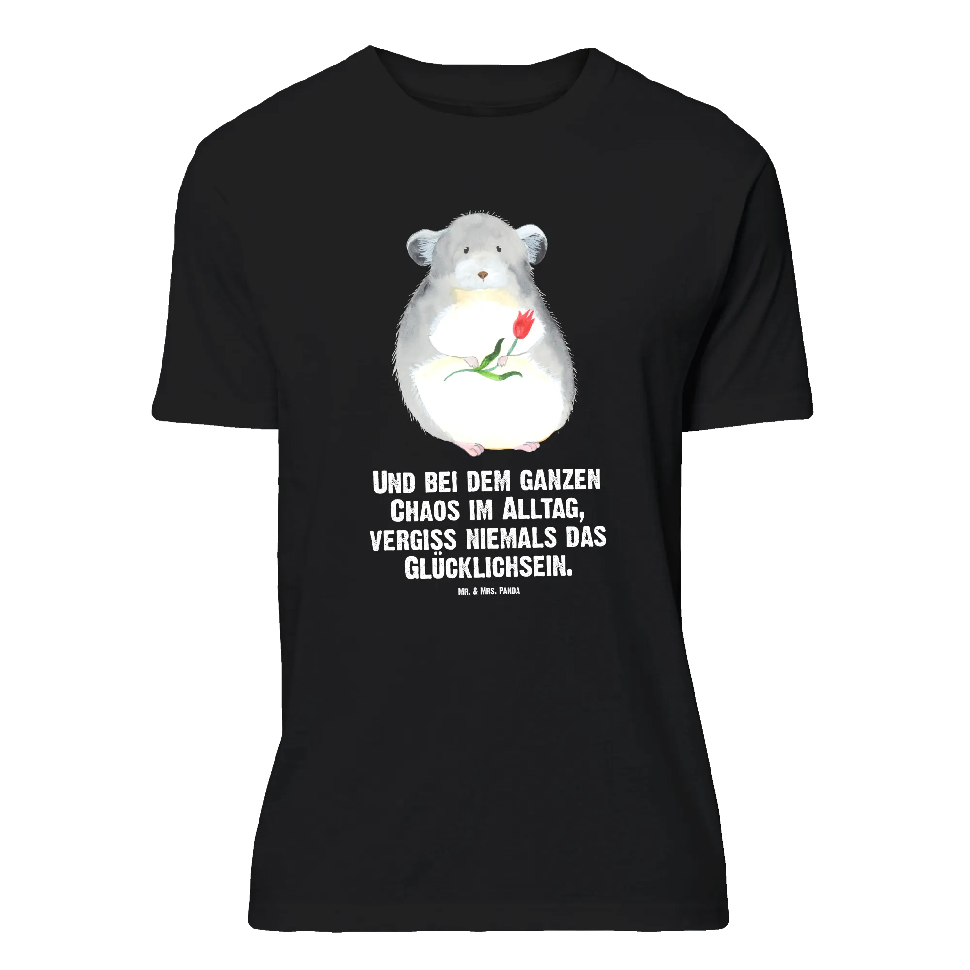 Dieses T-Shirt ist wie eine kleine Umarmung für den Alltag. Das zuckersüße Chinchilla hält eine Blume in den Pfoten und dazu steht der liebevolle Spruch: „Und bei dem ganzen Chaos im Alltag, vergiss niemals das Glücklichsein.“ Ein perfekter Reminder, der dich zum Schmunzeln bringt und Mut macht.