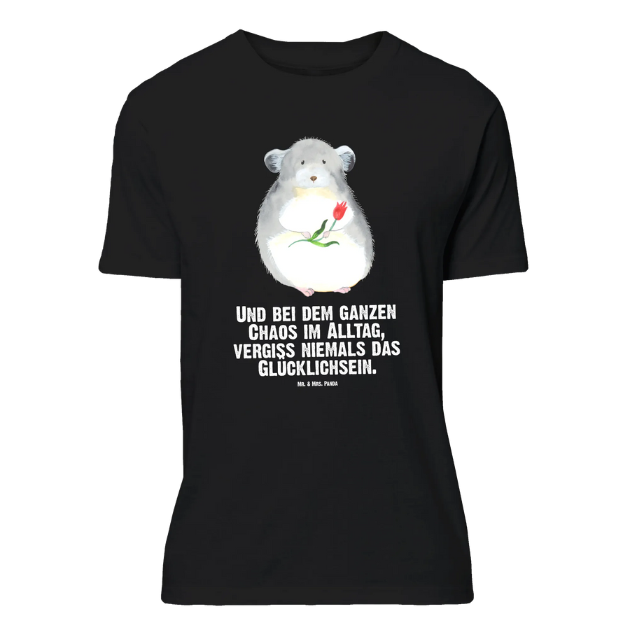 Unser Mr. & Mrs. Panda Damen T-Shirt Größe S „Chinchilla mit Blume“ bringt dir genau das, was dein Kleiderschrank manchmal am meisten braucht: Wärme, Humor und einen kleinen Hoffnungsschimmer. Auf schwarzem Untergrund leuchtet das handgezeichnete Chinchilla mit einer zarten Blume, dazu der liebevolle Spruch: „Und bei dem ganzen Chaos im Alltag, vergiss niemals das Glücklichsein.“