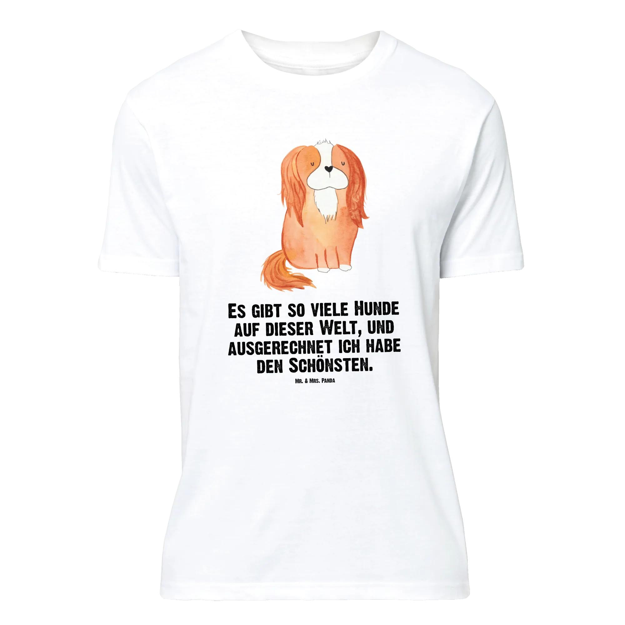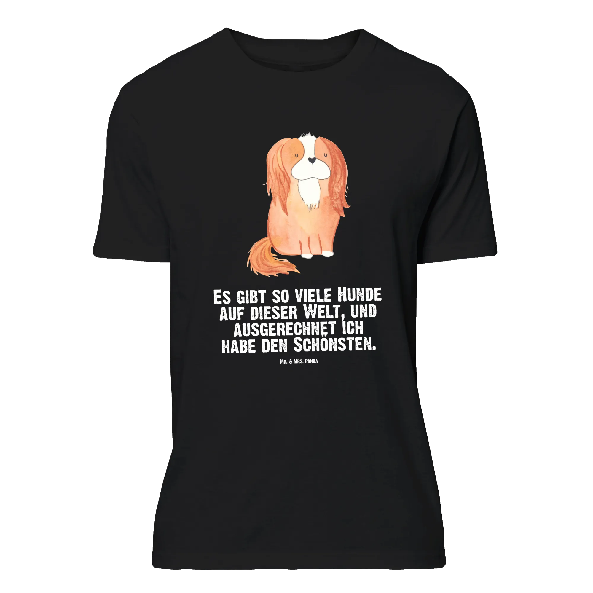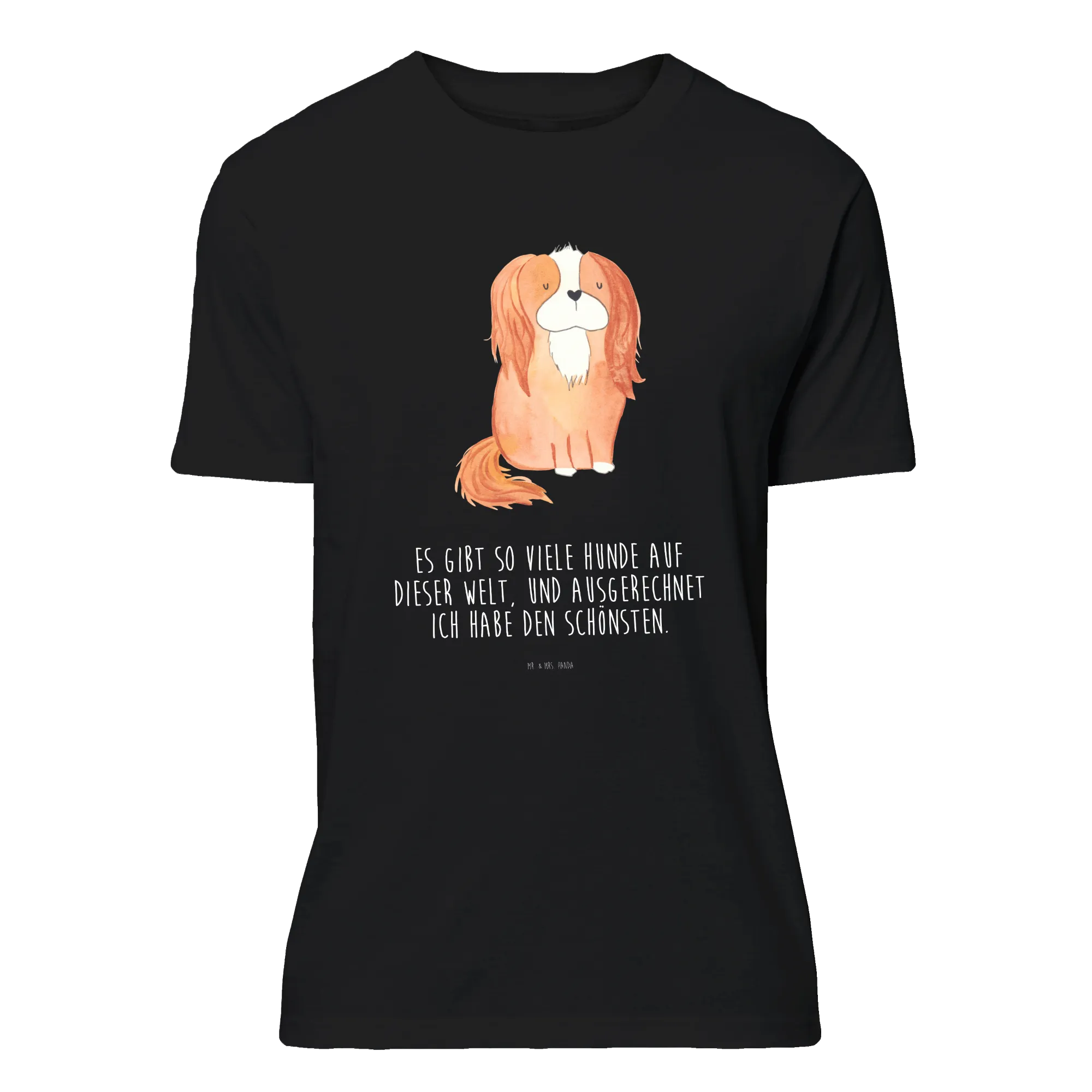 Du suchst ein liebevolles Geschenk für eine Hundemama? Unser Mr. & Mrs. Panda Größe XXL T-Shirt mit Cavalier King Charles Spaniel Motiv ist die ideale Wahl. Das handgezeichnete Aquarell-Motiv aus der Hunde Kollektion kombiniert Zärtlichkeit und Humor mit dem Spruch: „Es gibt so viele Hunde auf dieser Welt, und ausgerechnet ich habe den Schönsten.“ Auf schwarzem Hintergrund wirkt das Motiv besonders edel und sorgt für starke Kontraste.