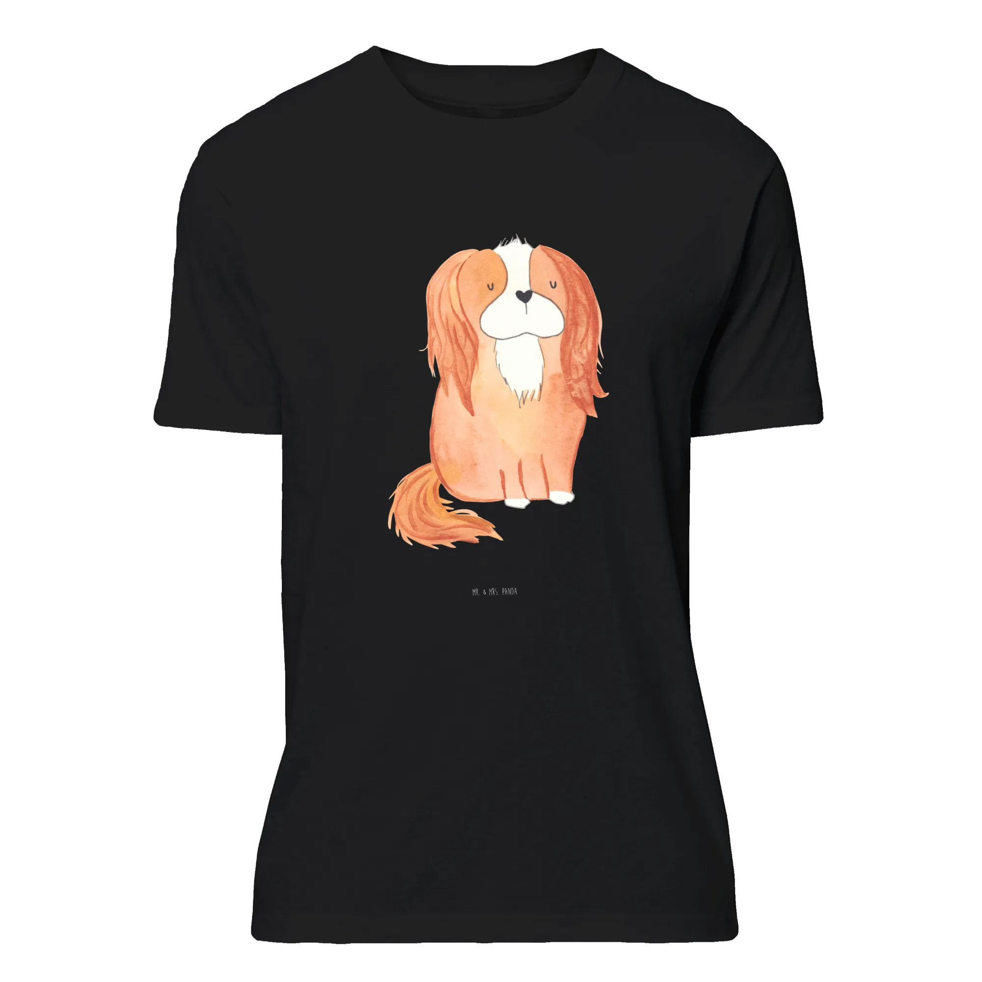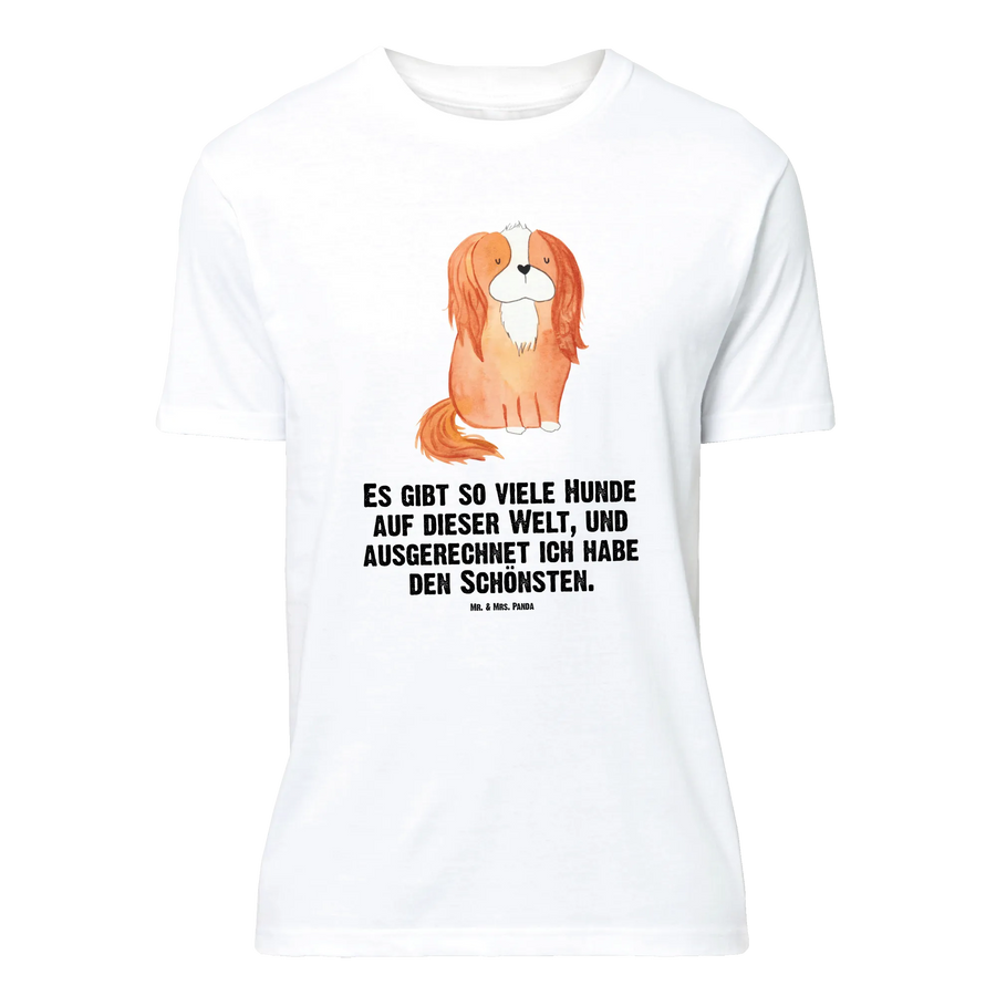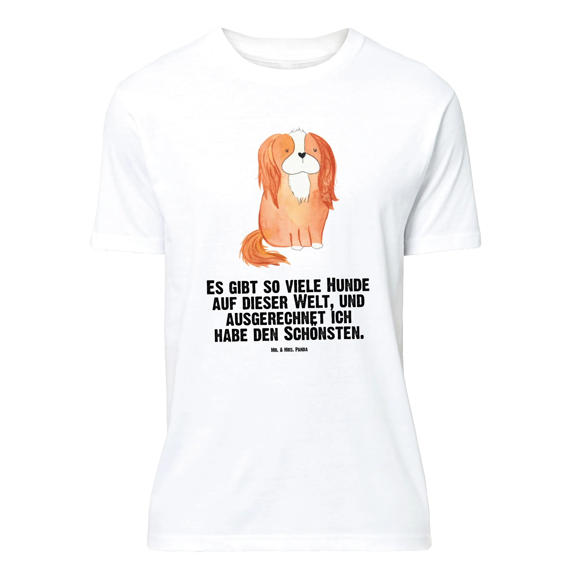 Du suchst ein liebevolles Geschenk für eine Hundemama? Unser Mr. & Mrs. Panda Größe XXL T-Shirt mit Cavalier King Charles Spaniel Motiv ist die ideale Wahl. Das handgezeichnete Aquarell-Motiv aus der Hunde Kollektion kombiniert Zärtlichkeit und Humor mit dem Spruch: „Es gibt so viele Hunde auf dieser Welt, und ausgerechnet ich habe den Schönsten.“ Auf schwarzem Hintergrund wirkt das Motiv besonders edel und sorgt für starke Kontraste.