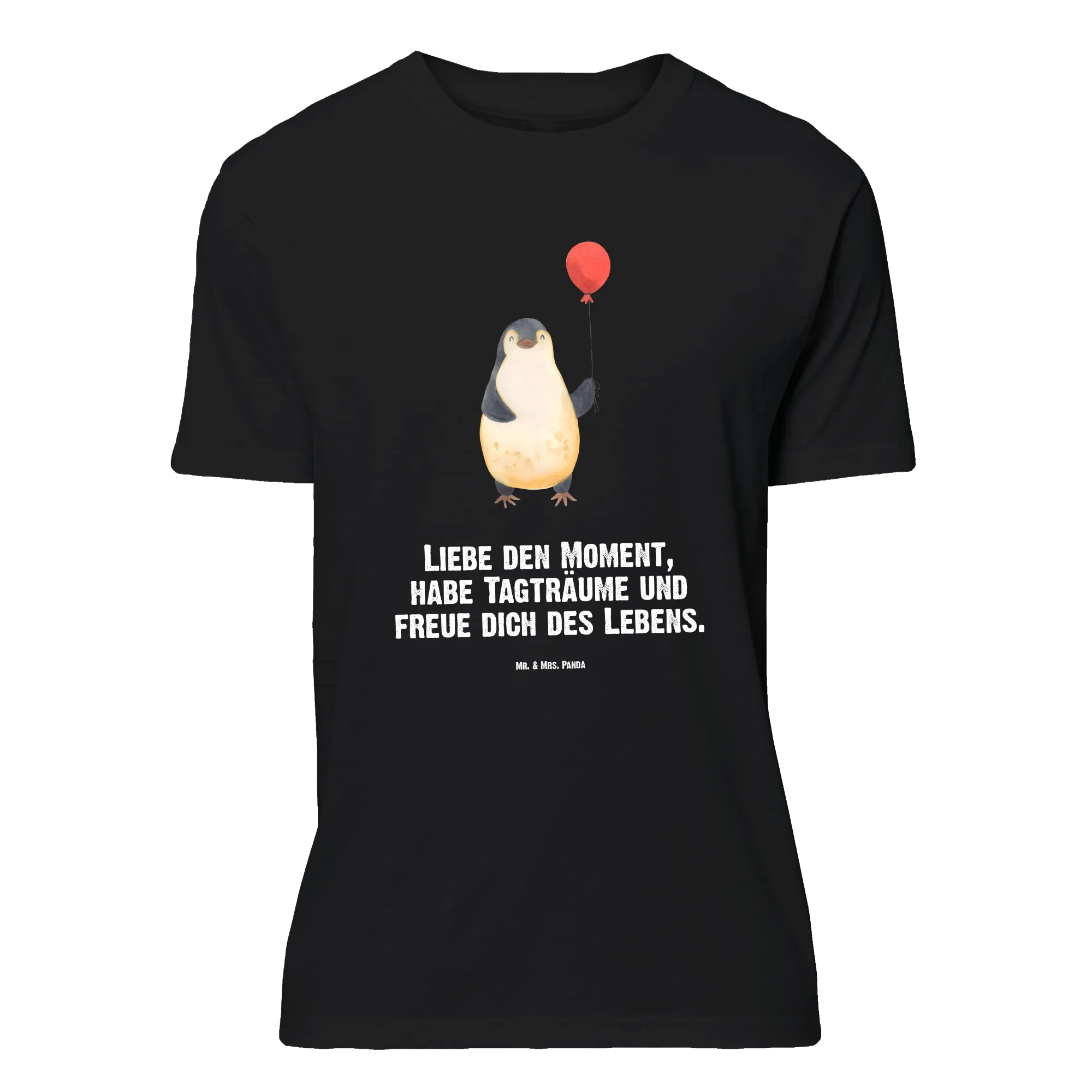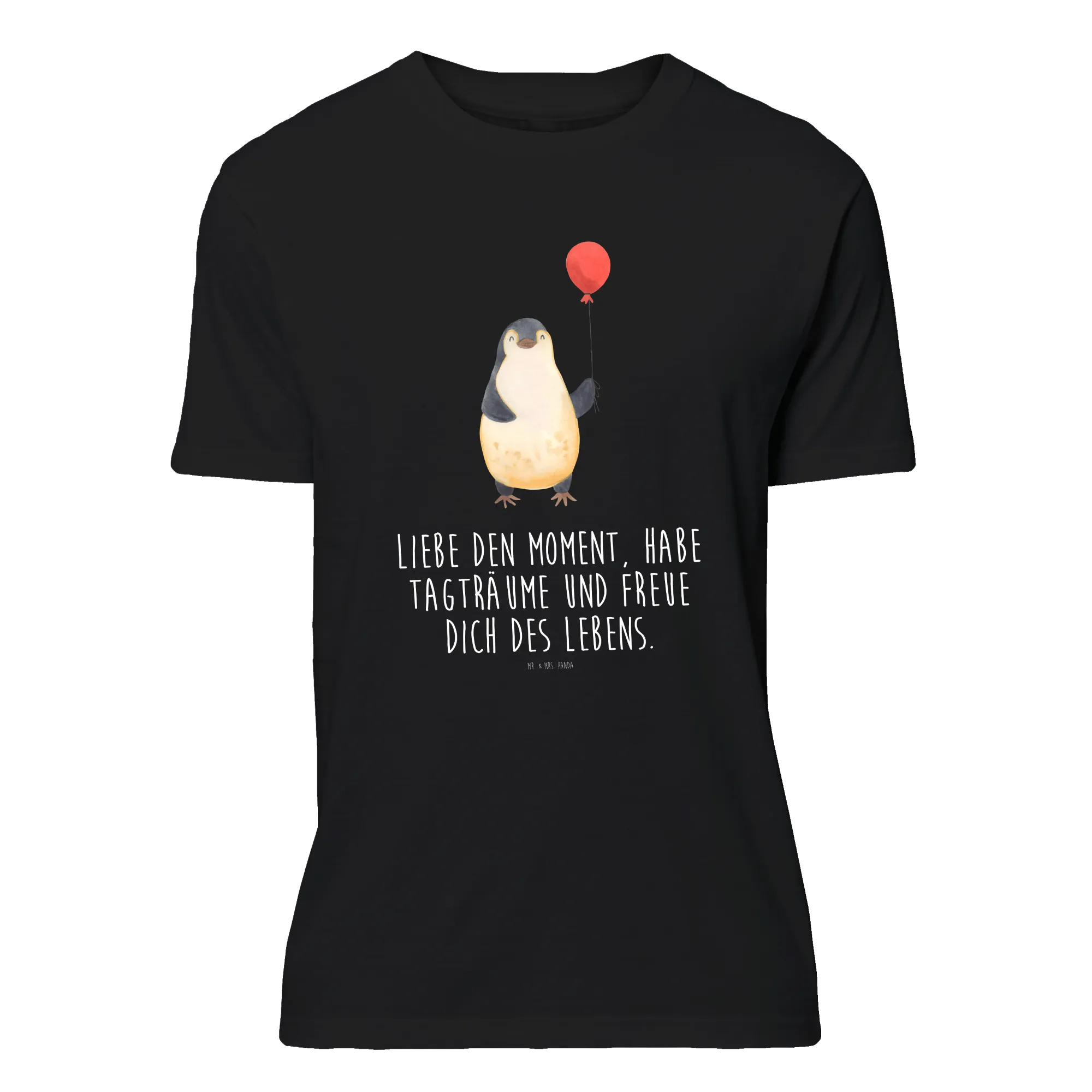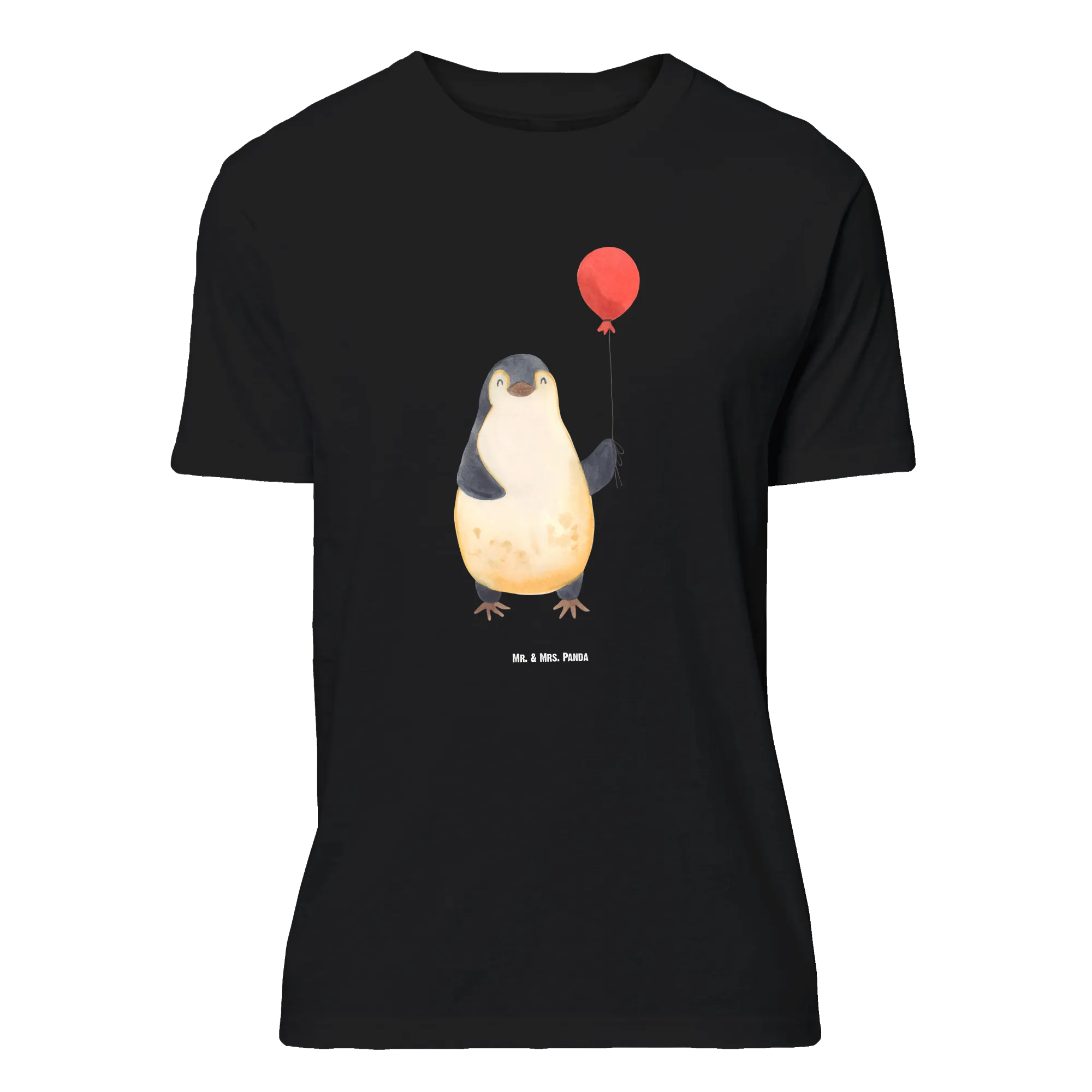 Vom Herzen getragen: Dieses Größe XXL T-Shirt aus der Pinguin - Kollektion zeigt unseren kleinen Pinguin mit Luftballon, liebevoll handgezeichnet von Mr. & Mrs. Panda. Auf dem schwarzen Stoff kommt das Aquarell-Motiv wunderbar zur Geltung und verbreitet sofort Wärme, Lebenslust und gute Laune.