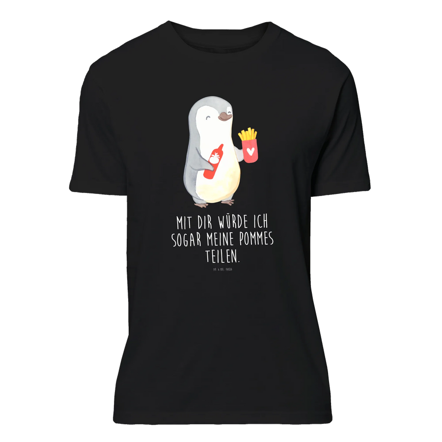 Dieses charmante T-Shirt aus der Kollektion Liebe zeigt einen fröhlichen Pinguin, der eine Portion Pommes und eine rote Ketchup-Flasche mit Herz hält. Der liebevolle Spruch „Mit dir würde ich sogar meine Pommes teilen.“ macht das Motiv zu einem kleinen, aber großen Liebesbeweis – frech, ehrlich und unglaublich niedlich.