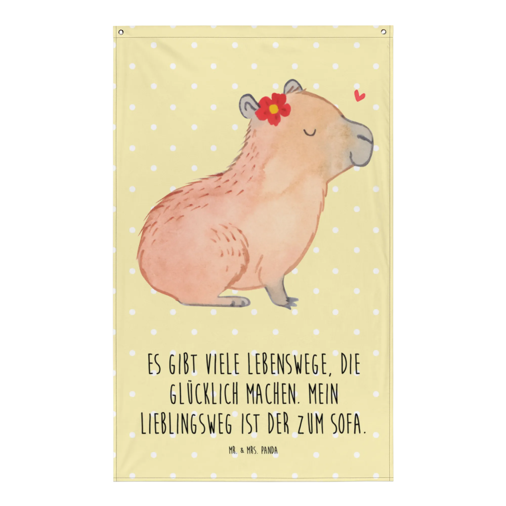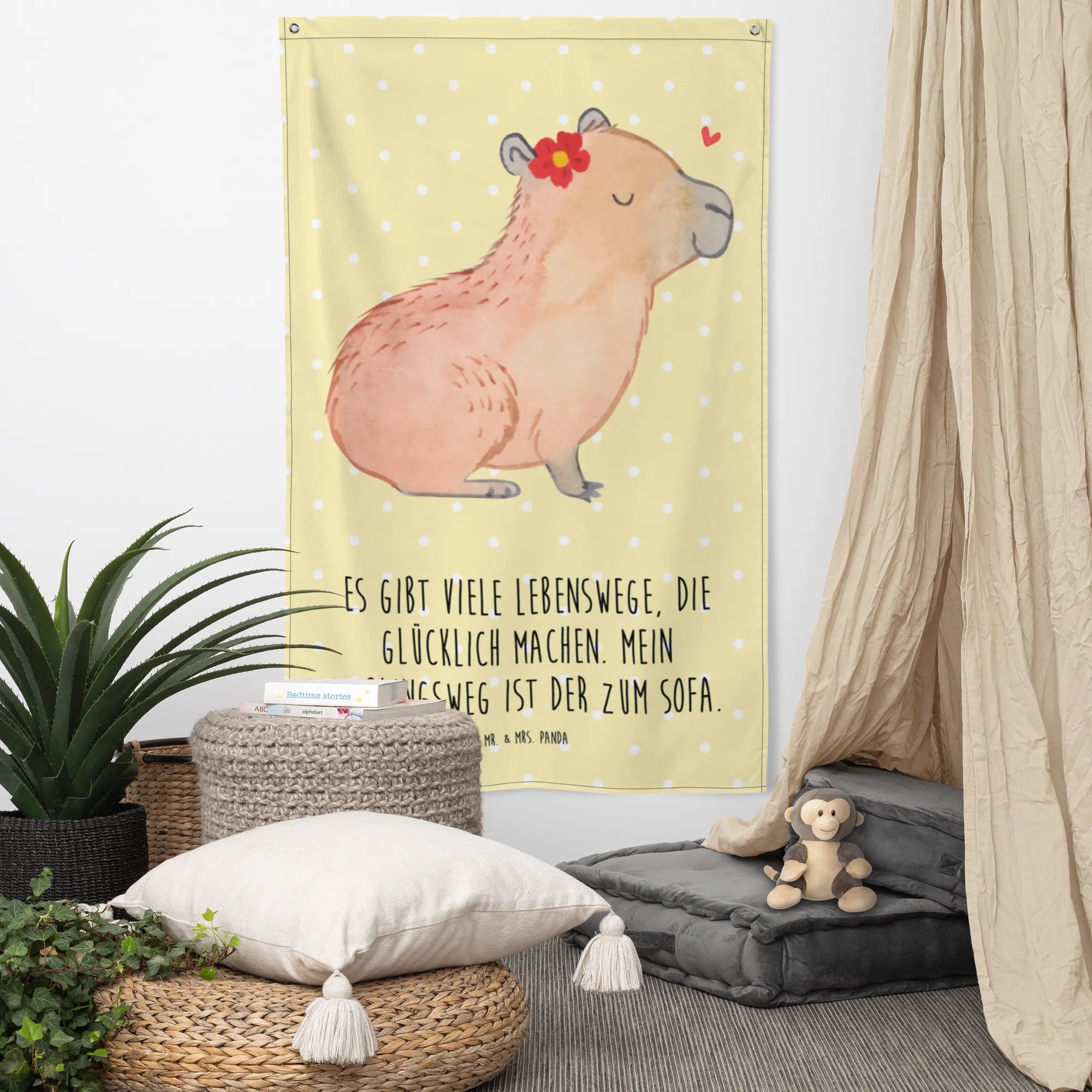 Meet our adorable Capybara Flower! This charming motif showcases a blissful capybara, eyes gently closed, radiating tranquility. Perched atop its head is a vibrant red flower, its yellow center bringing a playful pop to the design. The heart floating above captures the essence of love and relaxation, making this piece a sweet reminder that happiness can be found in the simplest moments. Embrace the joy of taking life at your own pace, because remember: Es gibt viele Lebenswege, die glücklich machen. Mein Lieblingsweg ist der zum Sofa.
