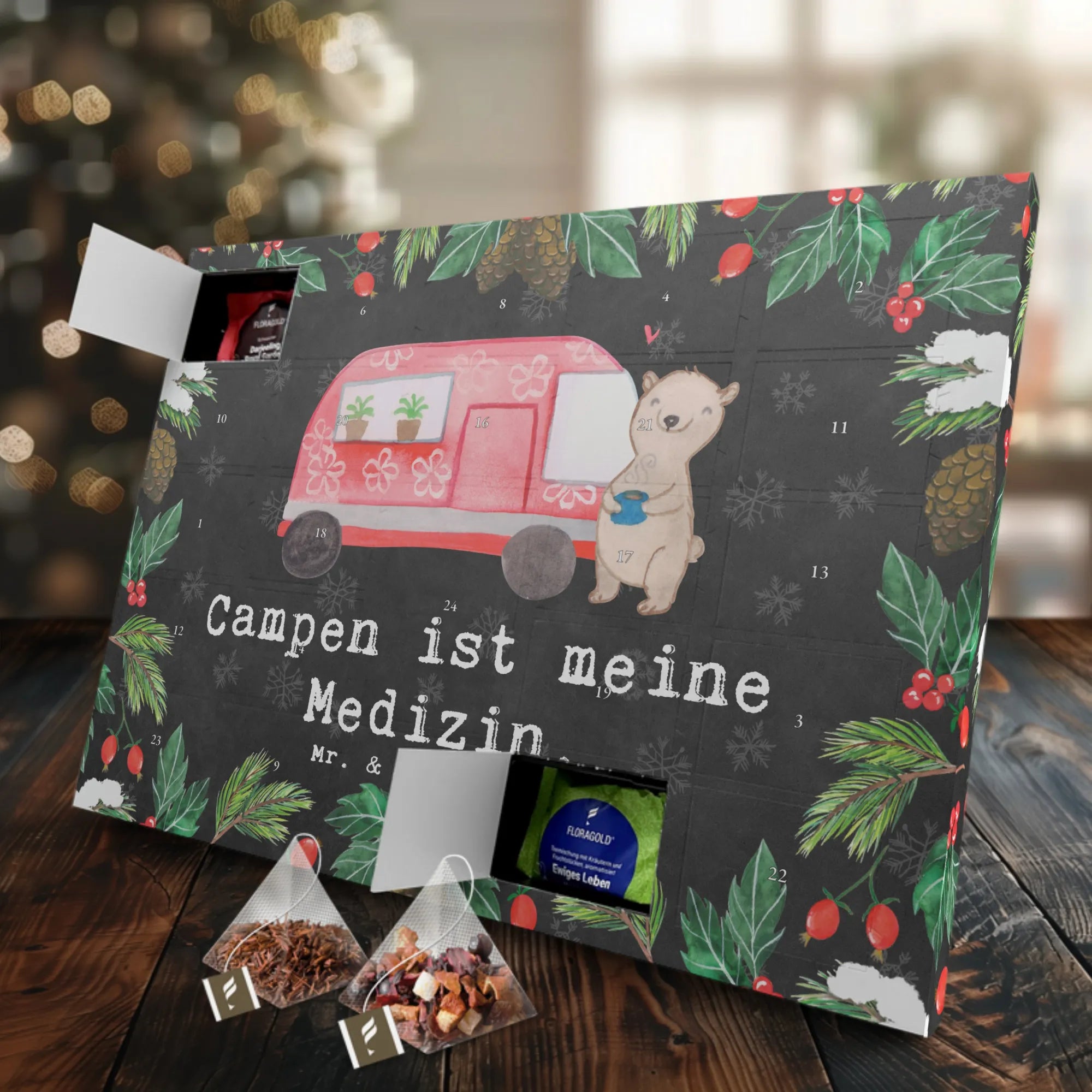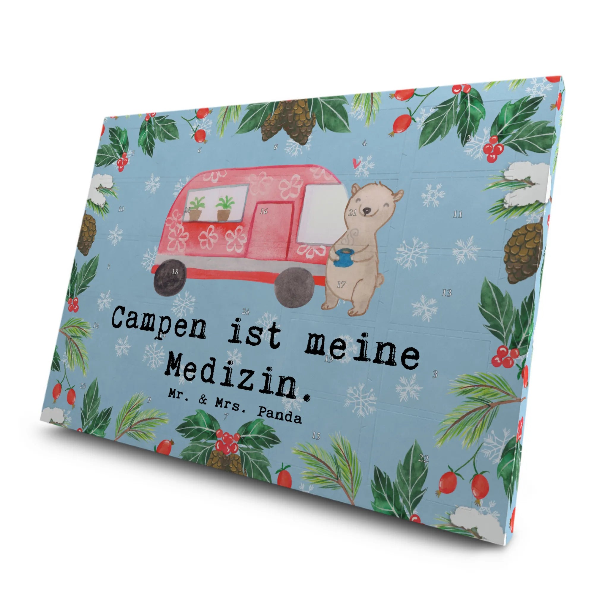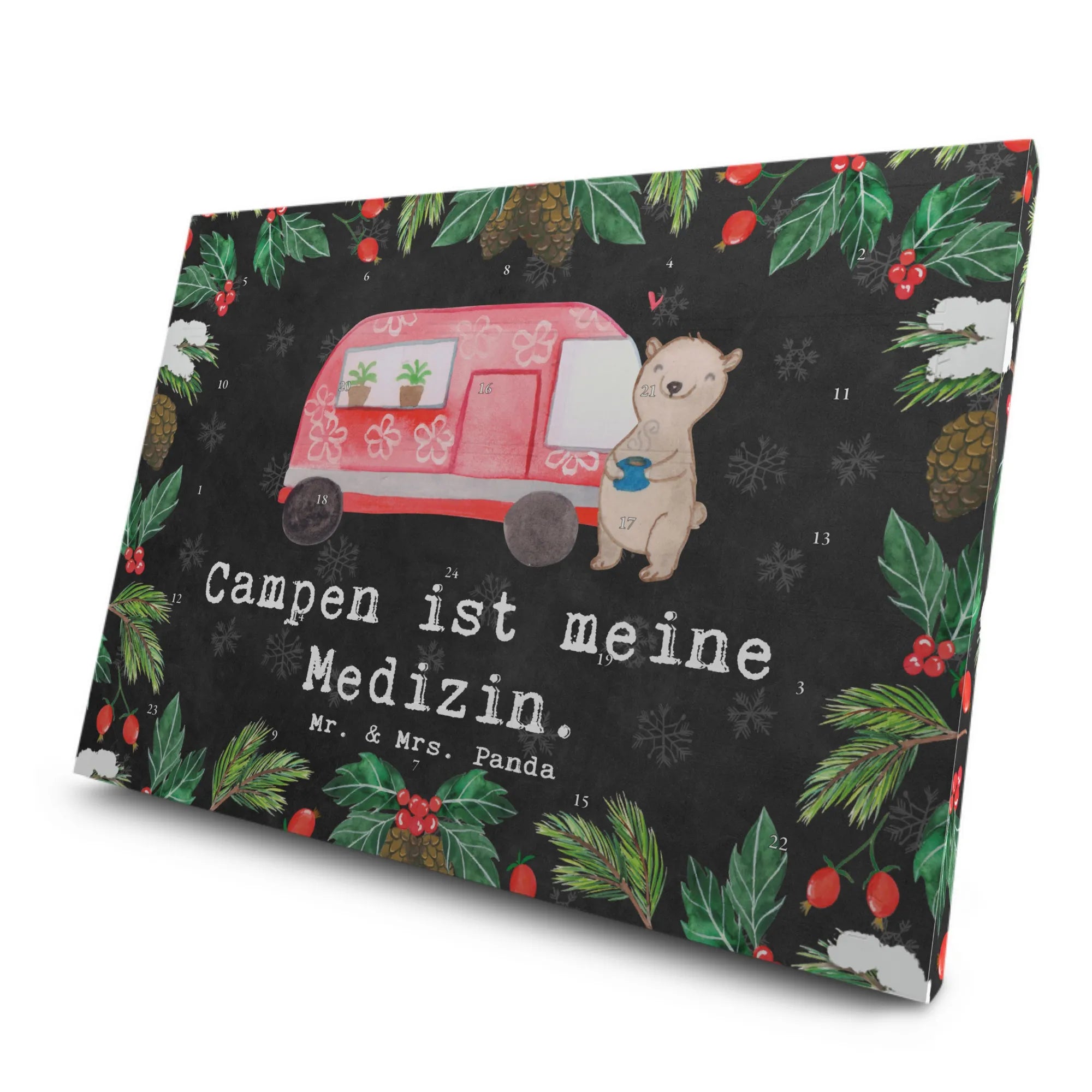 Das niedliche Motiv zeigt einen entspannen Bären, der zufrieden mit einer Tasse Heiltee vor seinem Camper Mobil steht. Diese liebevolle Illustration wurde von Mrs. Panda in Aquarell gestaltet und verleiht deinem Zuhause einen Hauch von Abenteuerlust. Der Adventskalender ist nicht nur ein toller Blickfang, sondern auch ein wunderbares Geschenk, um Danke zu sagen oder einfach mal einer besonderen Person eine Freude zu machen.