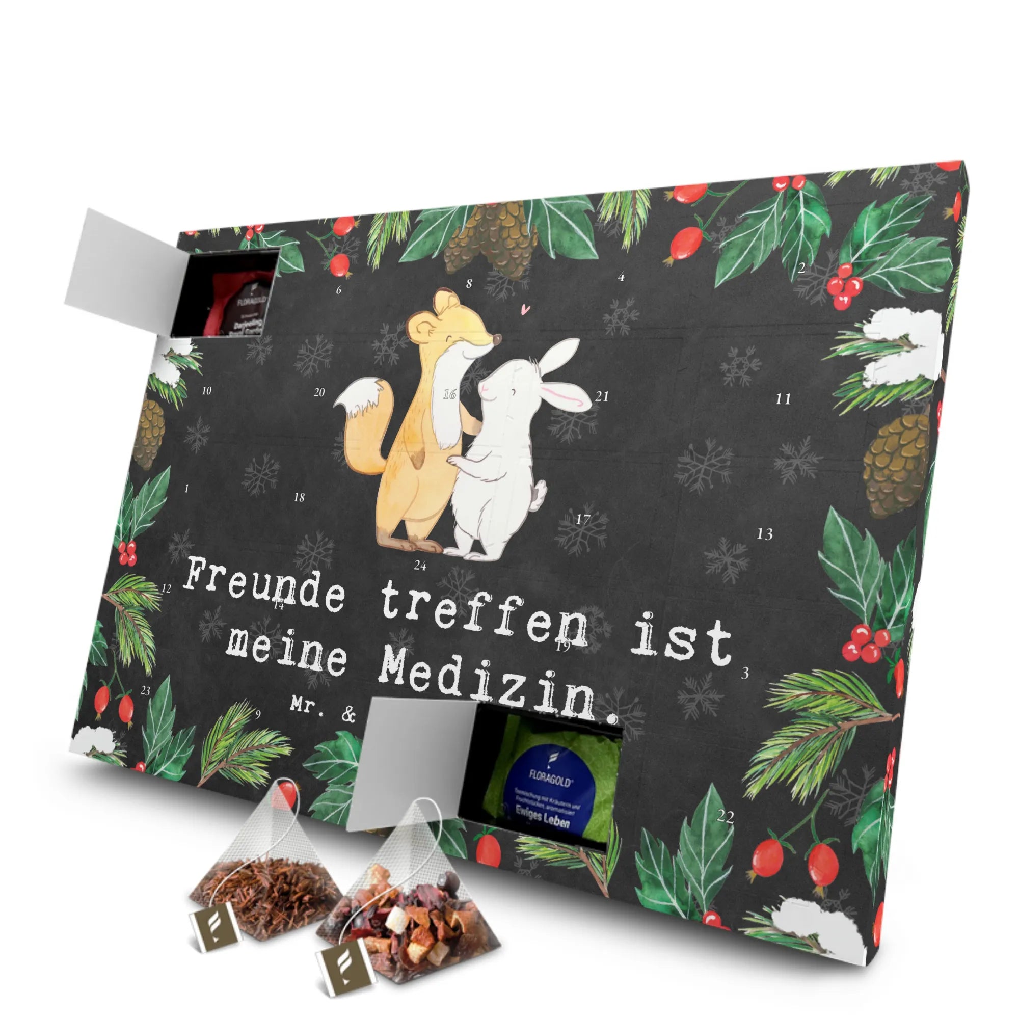 Der Tee Adventskalender mit dem süßen Motiv Fuchs Hase Freunde treffen Medizin von Mr. & Mrs. Panda ist das perfekte Geschenk für alle, die sich eine besinnliche Vorweihnachtszeit wünschen! Mit diesem wundervollen Adventskalender, der 24 einzeln verpackte Teesorten im Pyramidenbeutel enthält, erlebst du täglich eine neue Teeüberraschung. Jede Tasse Tee bringt Gemütlichkeit und Freude in den Alltag.