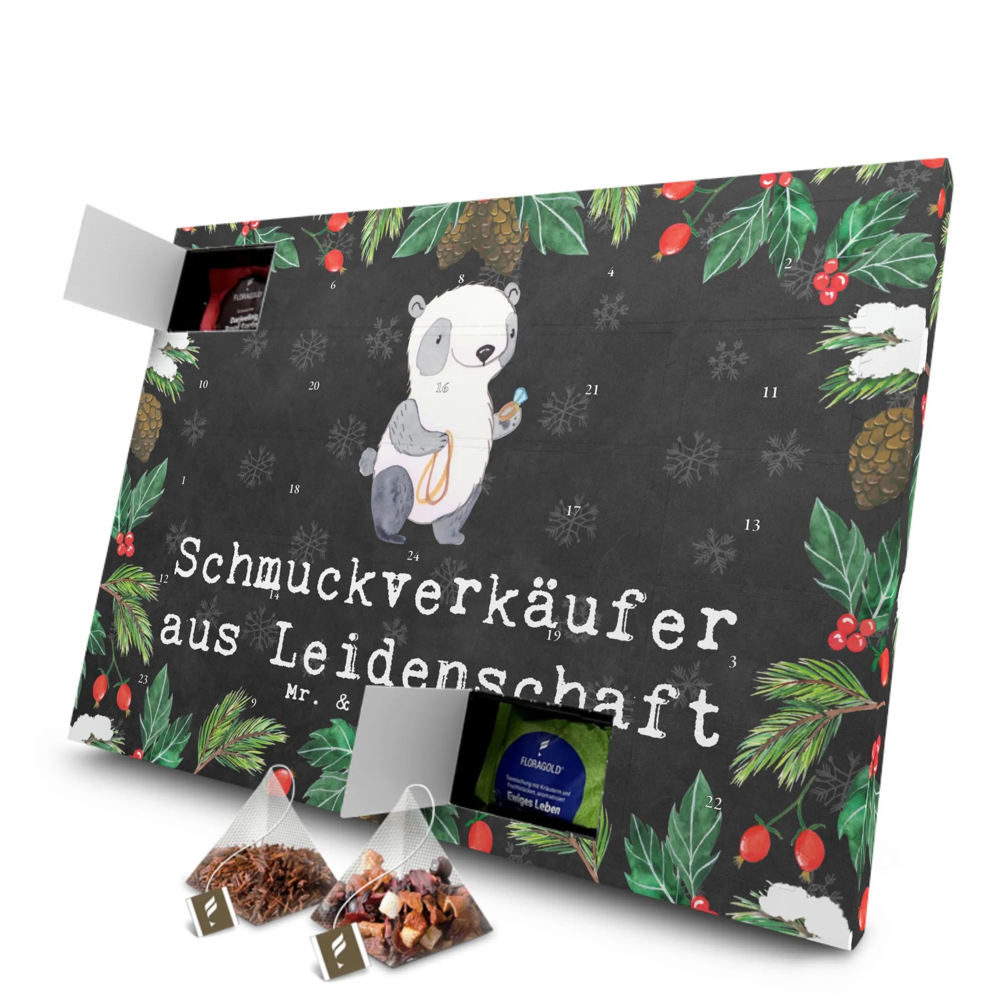 Suchst Du nach dem perfekten Geschenk für einen Schmuckverkäufer? Dann ist unser Tee Adventskalender "Schmuckverkäufer aus Leidenschaft" genau das Richtige! Dieser liebevoll gestaltete Adventskalender aus der kreativen Berufe Kollektion von Mr. & Mrs. Panda ist nicht nur ein absoluter Hingucker, sondern bietet auch eine wunderbare Möglichkeit, die Vorfreude auf Weihnachten zu vergrößern. Mit 24 einzeln verpackten hochwertigen Teesorten im Pyramidenbeutel erwartet Dich eine besondere Teereise. Ob Früchtetee, Schwarztee oder Kräutertee – hier ist für jeden Geschmack etwas dabei!