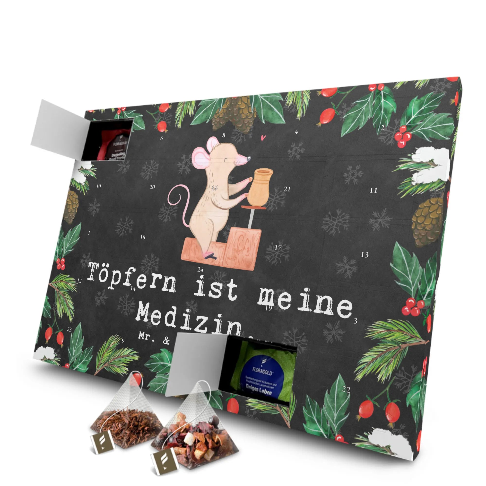 Der Tee Adventskalender Maus Töpfern Medizin von Mr. & Mrs. Panda ist ein perfektes Geschenk für alle, die leidenschaftlich gern töpfern und gleichzeitig die besinnliche Adventszeit genießen möchten. Hinter jeder Tür des Kalenders verbirgt sich ein köstlicher Tee, der mit viel Liebe ausgewählt wurde. Es sind insgesamt 24 hochwertige Teesorten im Pyramidenbeutel enthalten, die von fruchtigen Aromen bis hin zu beruhigenden Kräutertees reichen.