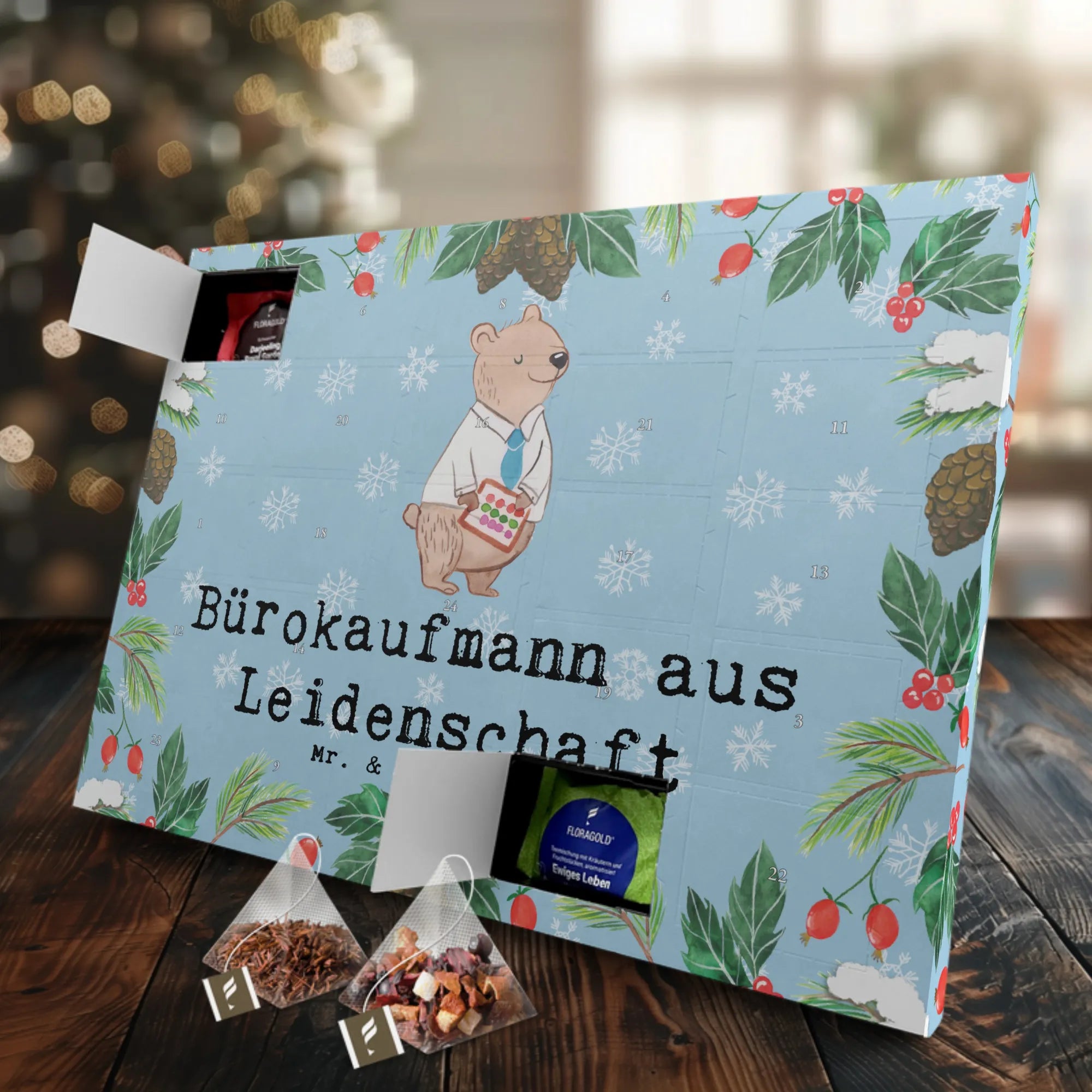 Die liebevolle Gestaltung mit dem süßen, fein angezogenen Bären, der als Bürokaufmann arbeitet, bringt das Lächeln ins Büro. Ihr Kollege oder deine Kollegin wird nicht nur den Tee genießen, sondern sich auch über die besondere Botschaft freuen: "Bürokaufmann aus Leidenschaft". Dieser Adventskalender eignet sich hervorragend als Dankeschön für Mitarbeiter, als Geschenk zum Berufsjubiläum, zur Pensionierung oder einfach nur, um jemandem eine Freude zu machen.