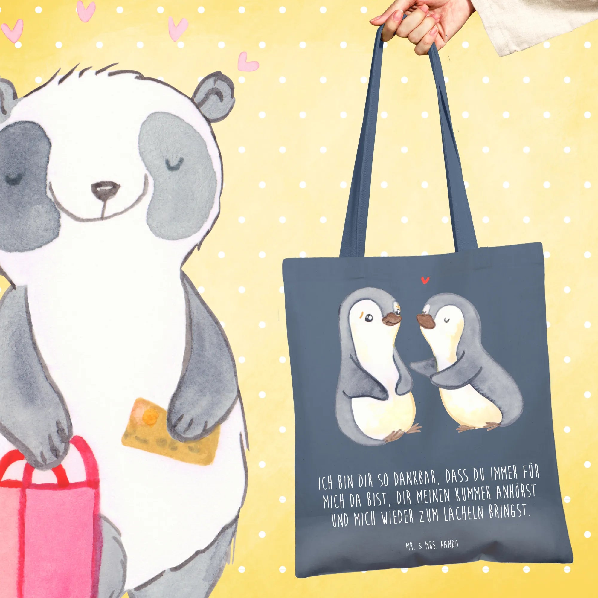 Say hello to the most stylish companion for your outings – the Mr. & Mrs. Panda Tote Bag! With a robust design that features 420 mm (17 inches) in width and 380 mm (15 inches) in height, it's the ideal tote for carrying your essentials. Crafted with 100% cotton and a thickness of 140g/m², this shopper is built to last. The high-quality prints with Mr. & Mrs. Panda's cute motifs will surely turn heads, making this bag not just practical but also a delightful statement piece. Its 70 cm long straps offer comfortable wear over the shoulder. Whether you’re heading to the grocery store or hitting the beach, this tote bag merges elegance with utility effortlessly.