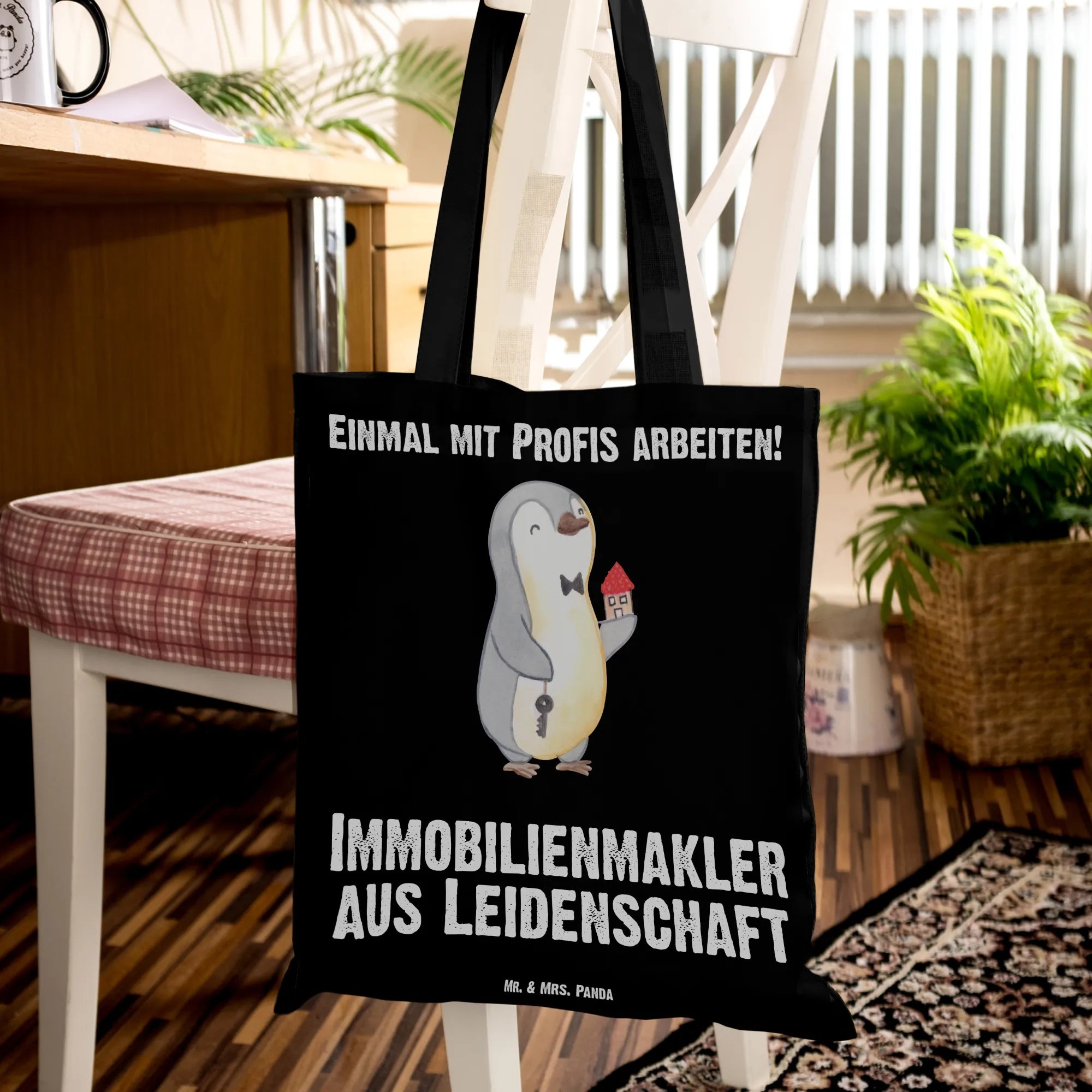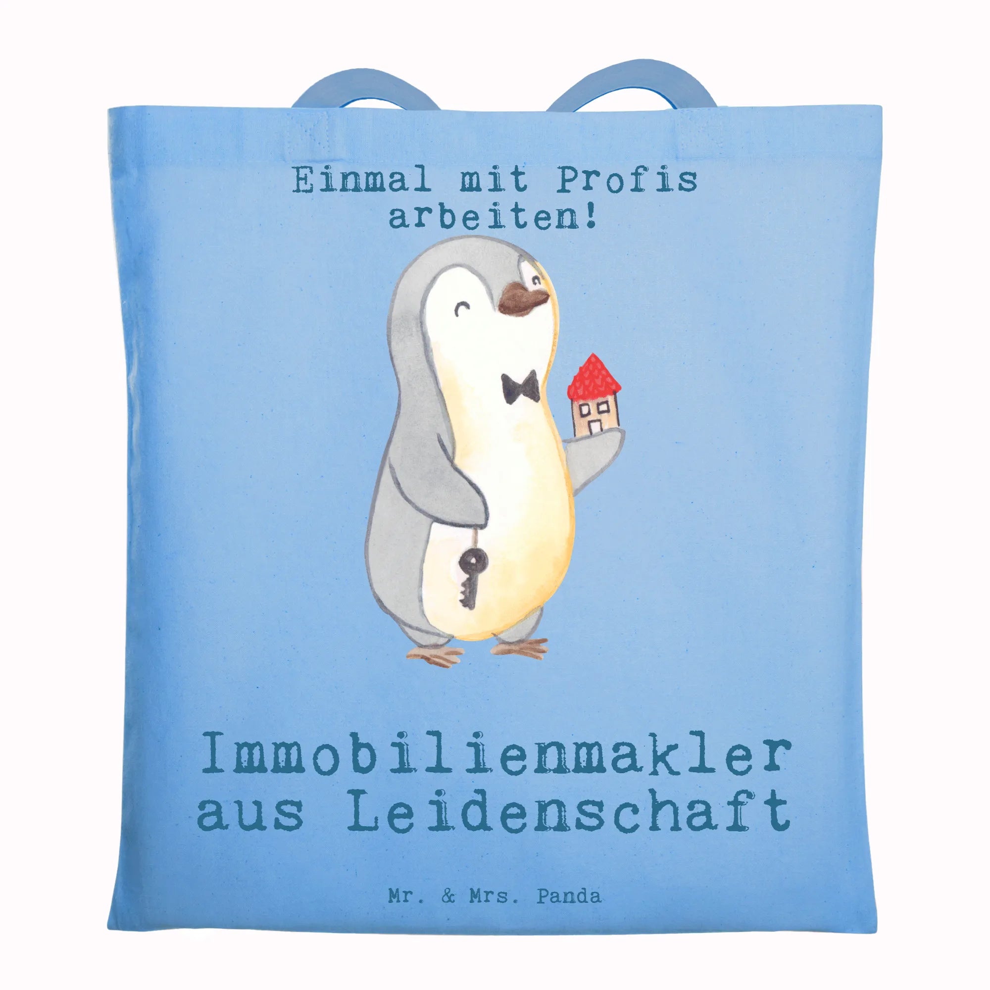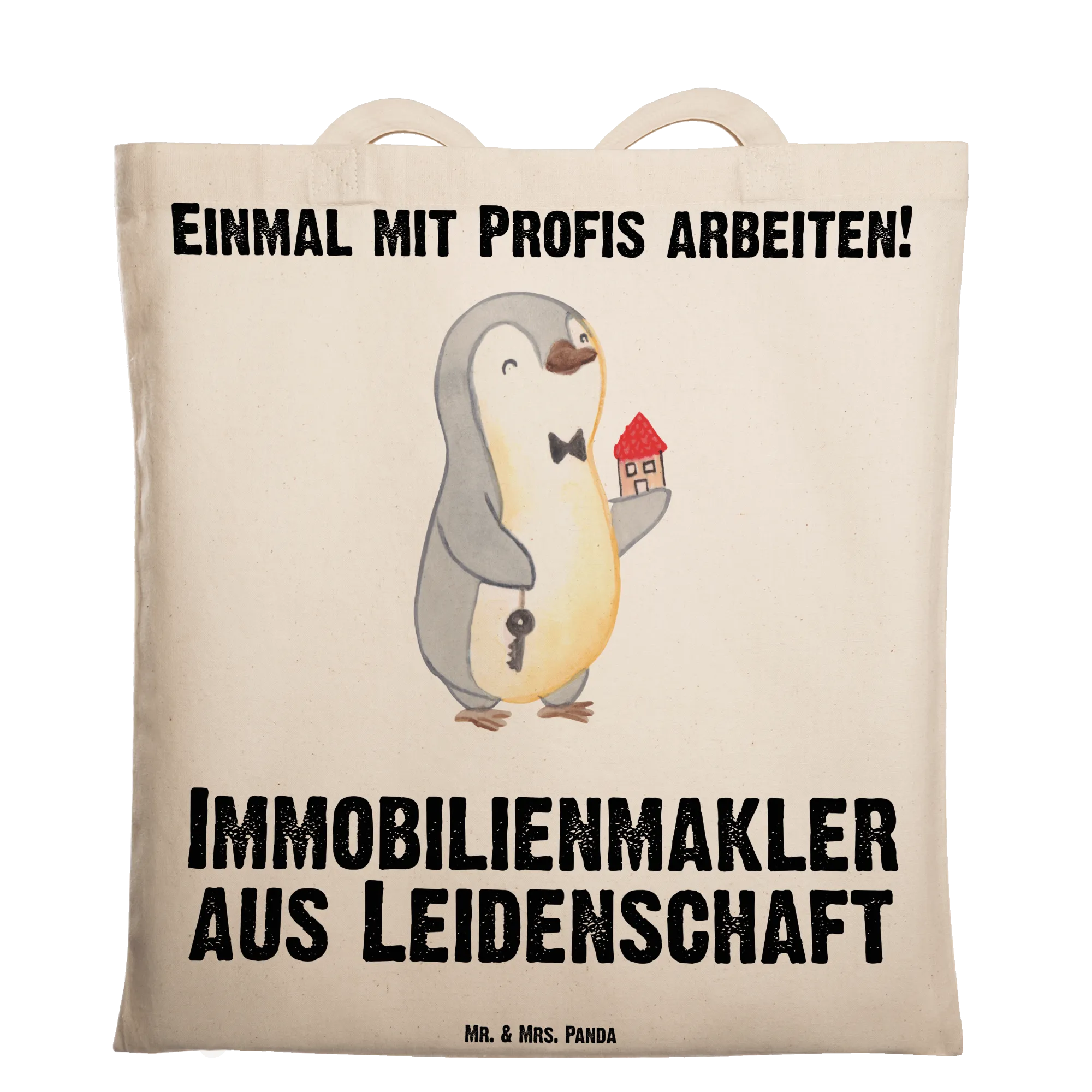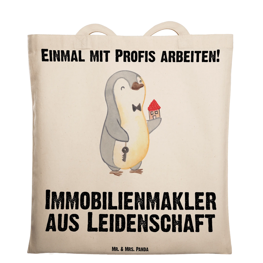 Unsere Tragetasche „Immobilienmakler aus Leidenschaft“ von Mr. & Mrs. Panda ist das perfekte Geschenk für alle, die Immobilien lieben und mit Leidenschaft arbeiten. Das liebevoll gezeichnete Motiv zeigt unseren kleinen Pinguin mit Schlüssel und Haus, begleitet vom Schriftzug „Immobilienmakler aus Leidenschaft“ – ein fröhlicher und persönlicher Blickfang für jeden Tag.