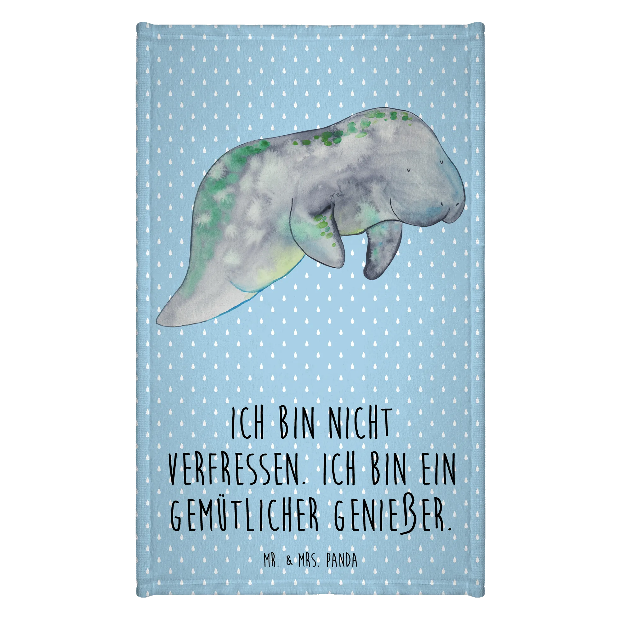 The enchanting design features a hand-drawn illustration of a relaxed manatee, gently floating in serene blue and green watercolour hues. Accented with subtle grey tones and vibrant green dots, this charming sea creature brings an atmosphere of tranquillity and coziness that will elevate the decor in any bathroom. Plus, it proudly displays the light-hearted slogan, "Ich bin nicht Verfressen. Ich bin ein gemütlicher Genießer," encouraging all to embrace a comfortable and enjoyable lifestyle.
