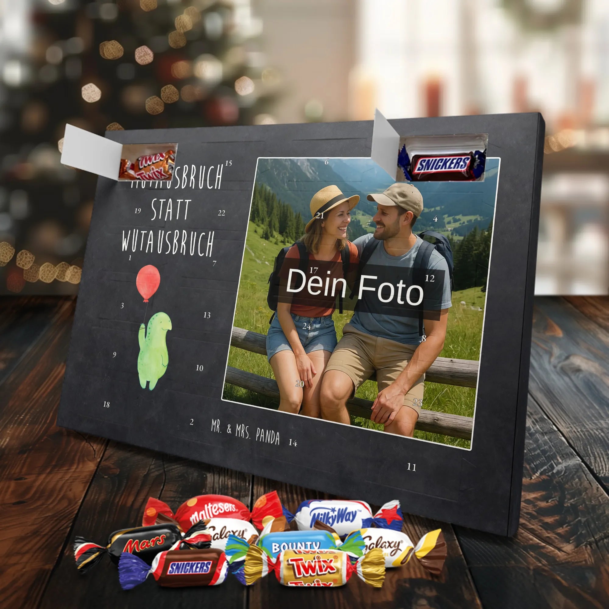 Lustiger Personalisierter Schoko Foto-Adventskalender – das Must-have für eine persönliche Adventszeit von Mr. & Mrs. Panda. Jeder Kalender wird mit unseren charmanten Illustrationen und liebevollen Sprüchen bedruckt, während dein Foto die Vorderseite einzigartig macht. Achte bitte darauf, ein Foto mit guter Qualität und ausreichend hoher Auflösung hochzuladen, damit der Druck gestochen scharf wirkt. Überprüfe den Bildausschnitt, damit wichtige Bereiche nicht verloren gehen. Denk daran, nur Bilder zu verwenden, bei denen du die nötigen Rechte besitzt. Die Verarbeitung ist hochwertig: brillante Druckqualität mit seidenmatter Oberflächenveredelung und bedruckten Seitenflächen. Maße: 325 mm x 225 mm x 27 mm. Du kannst den Kalender aufhängen oder aufstellen – sehr praktisch. Hinweis: Die hochgeladenen Fotos werden nicht nachbearbeitet oder zugeschnitten; Rücknahme bei personalisierten Foto-Artikeln ist ausgeschlossen. Gefüllt ist der Kalender mit Celebrations Schokolade – 24 Stück in 8 verschiedenen Sorten (Maltesers, Mars, Snickers, Twix, Milky Way, Bounty, Galaxy, Galaxy Caramel). Verschenke ein Stück persönlich gestaltete Vorfreude und mache jeden Dezembertag zu etwas Besonderem.
