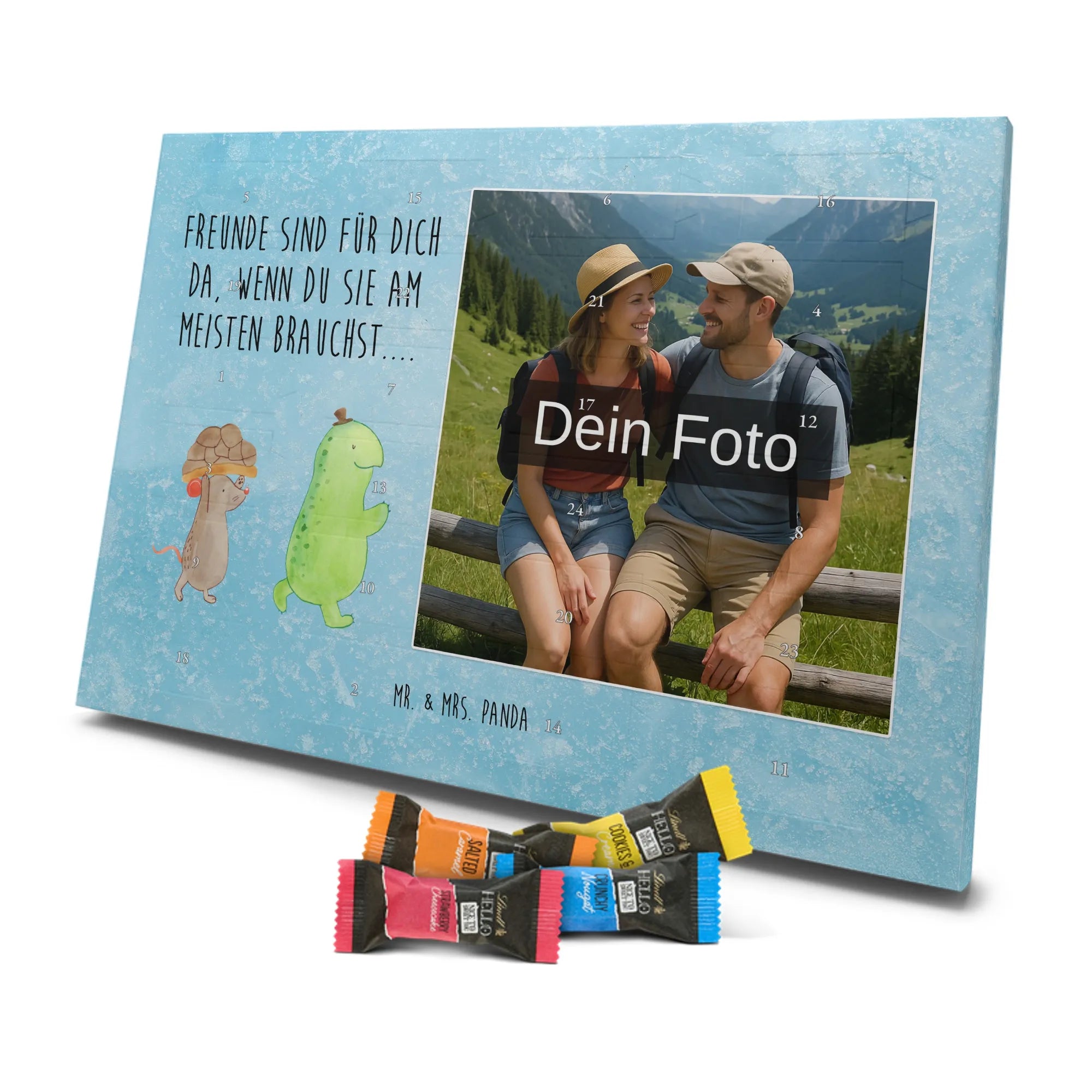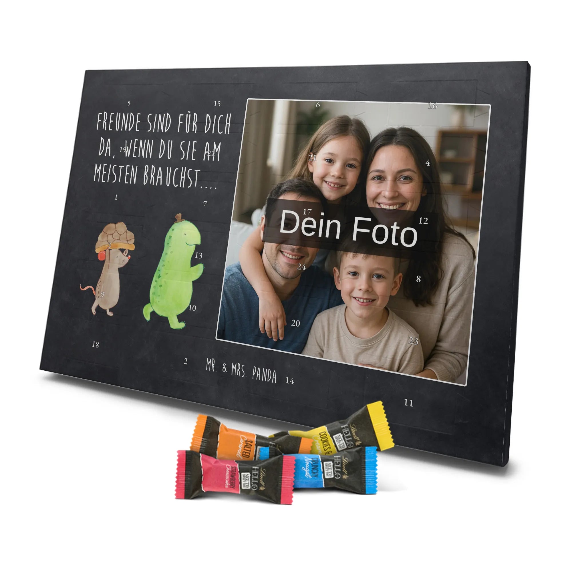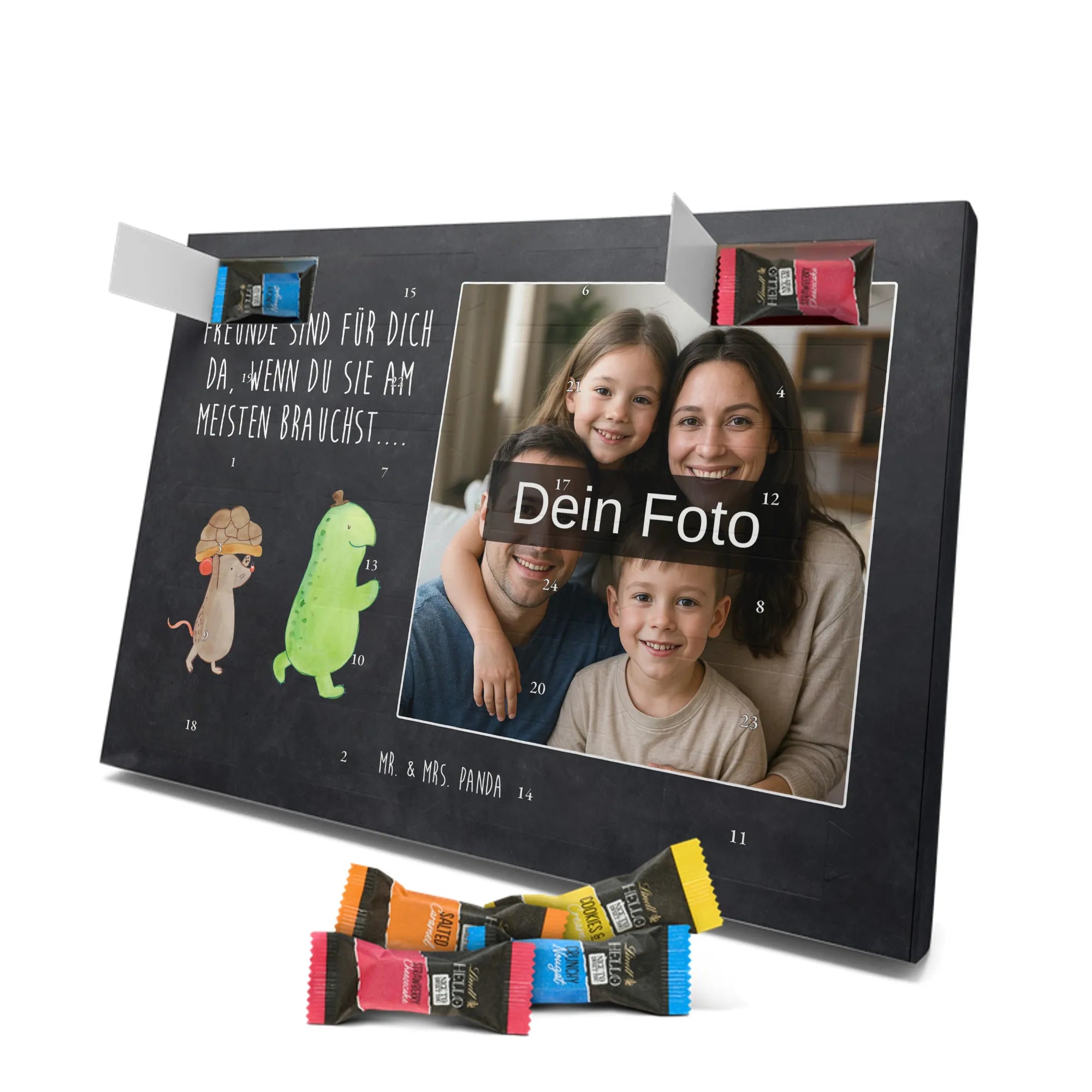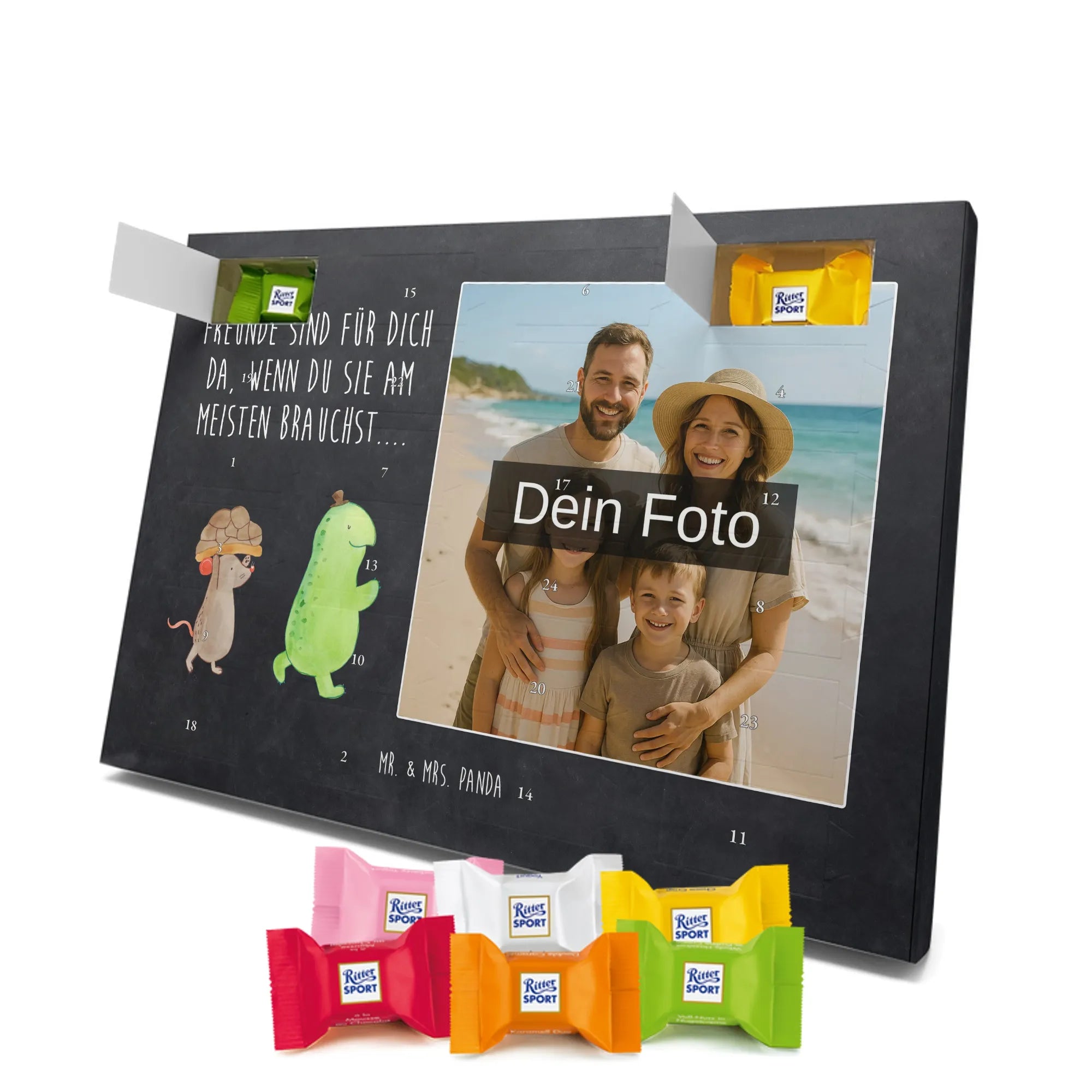 Schoko Foto Adventskalender personalisiert – ein fröhlicher Hingucker von Mr. & Mrs. Panda, der Adventszeit und Erinnerungen verbindet. Der Kalender ist bedruckt mit zauberhaften Motiven & Sprüchen von Mr. & Mrs. Panda und lässt sich ganz leicht mit einem Foto deiner Wahl personalisieren. Achtung Bildqualität: Für ein scharfes Druckbild solltest du ein Foto in hoher Auflösung verwenden. Kontrolliere den Bildausschnitt, damit wichtige Gesichter oder Details nicht verloren gehen. Verwende nur Fotos, für die du die Rechte besitzt oder die frei nutzbar sind. Bitte beachte: Die Fotos werden weder nachbearbeitet noch zugeschnitten und personalisierte Foto Artikel sind vom Umtausch ausgeschlossen. Die Verarbeitung überzeugt mit seidenmatter Oberflächenveredelung und bedruckten Seitenflächen für ein edles Finish. Maße: 325 mm x 225 mm x 27 mm. Besonderheit: Du kannst den Kalender aufhängen oder aufstellen – ganz flexibel. Gefüllt ist der Kalender mit Ritter Sport Schokowürfeln in leckeren Geschmacksrichtungen wie Mousse au Chocolat, Schoko Crisp, Voll-Nuss in Nougatcreme, Karamell Duo, Joghurt und Erdbeer-Joghurt. Ein liebevolles Geschenk, das jeden Tag im Advent versüßt.