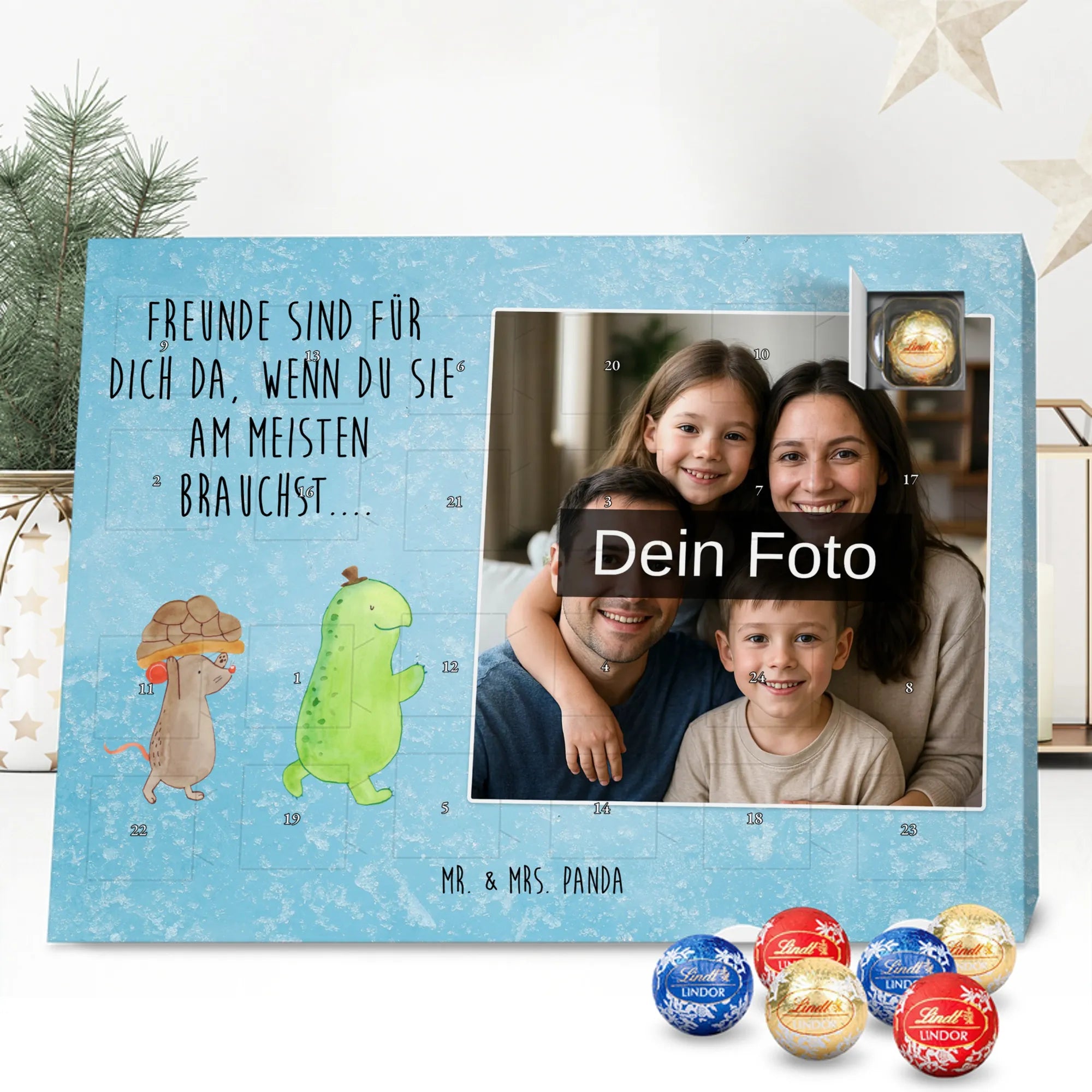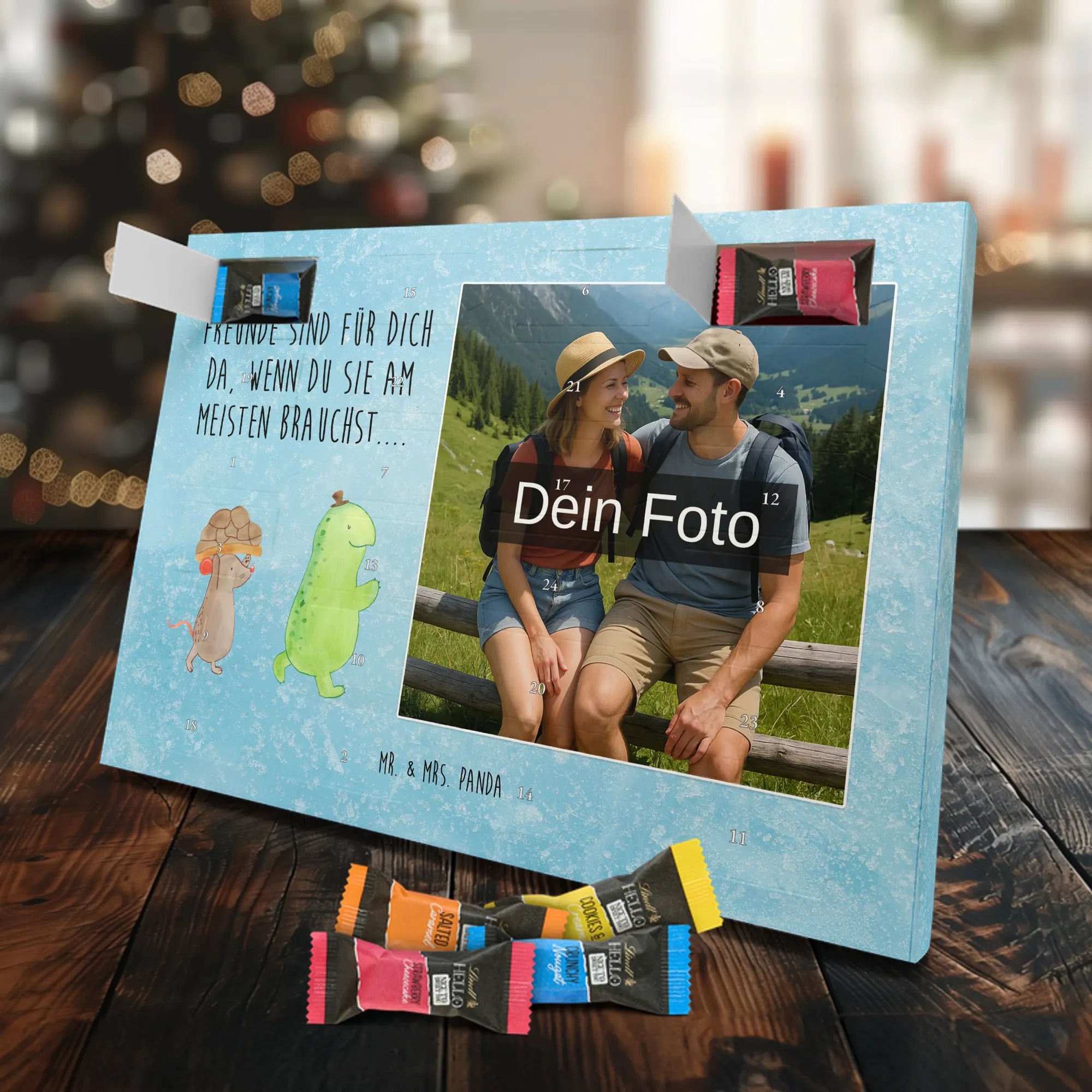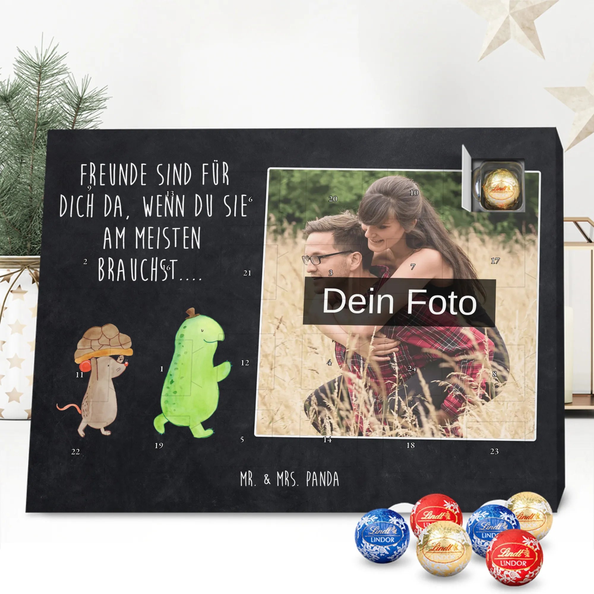 Schoko Foto Adventskalender personalisiert – ein fröhlicher Hingucker von Mr. & Mrs. Panda, der Adventszeit und Erinnerungen verbindet. Der Kalender ist bedruckt mit zauberhaften Motiven & Sprüchen von Mr. & Mrs. Panda und lässt sich ganz leicht mit einem Foto deiner Wahl personalisieren. Achtung Bildqualität: Für ein scharfes Druckbild solltest du ein Foto in hoher Auflösung verwenden. Kontrolliere den Bildausschnitt, damit wichtige Gesichter oder Details nicht verloren gehen. Verwende nur Fotos, für die du die Rechte besitzt oder die frei nutzbar sind. Bitte beachte: Die Fotos werden weder nachbearbeitet noch zugeschnitten und personalisierte Foto Artikel sind vom Umtausch ausgeschlossen. Die Verarbeitung überzeugt mit seidenmatter Oberflächenveredelung und bedruckten Seitenflächen für ein edles Finish. Maße: 325 mm x 225 mm x 27 mm. Besonderheit: Du kannst den Kalender aufhängen oder aufstellen – ganz flexibel. Gefüllt ist der Kalender mit Ritter Sport Schokowürfeln in leckeren Geschmacksrichtungen wie Mousse au Chocolat, Schoko Crisp, Voll-Nuss in Nougatcreme, Karamell Duo, Joghurt und Erdbeer-Joghurt. Ein liebevolles Geschenk, das jeden Tag im Advent versüßt.
