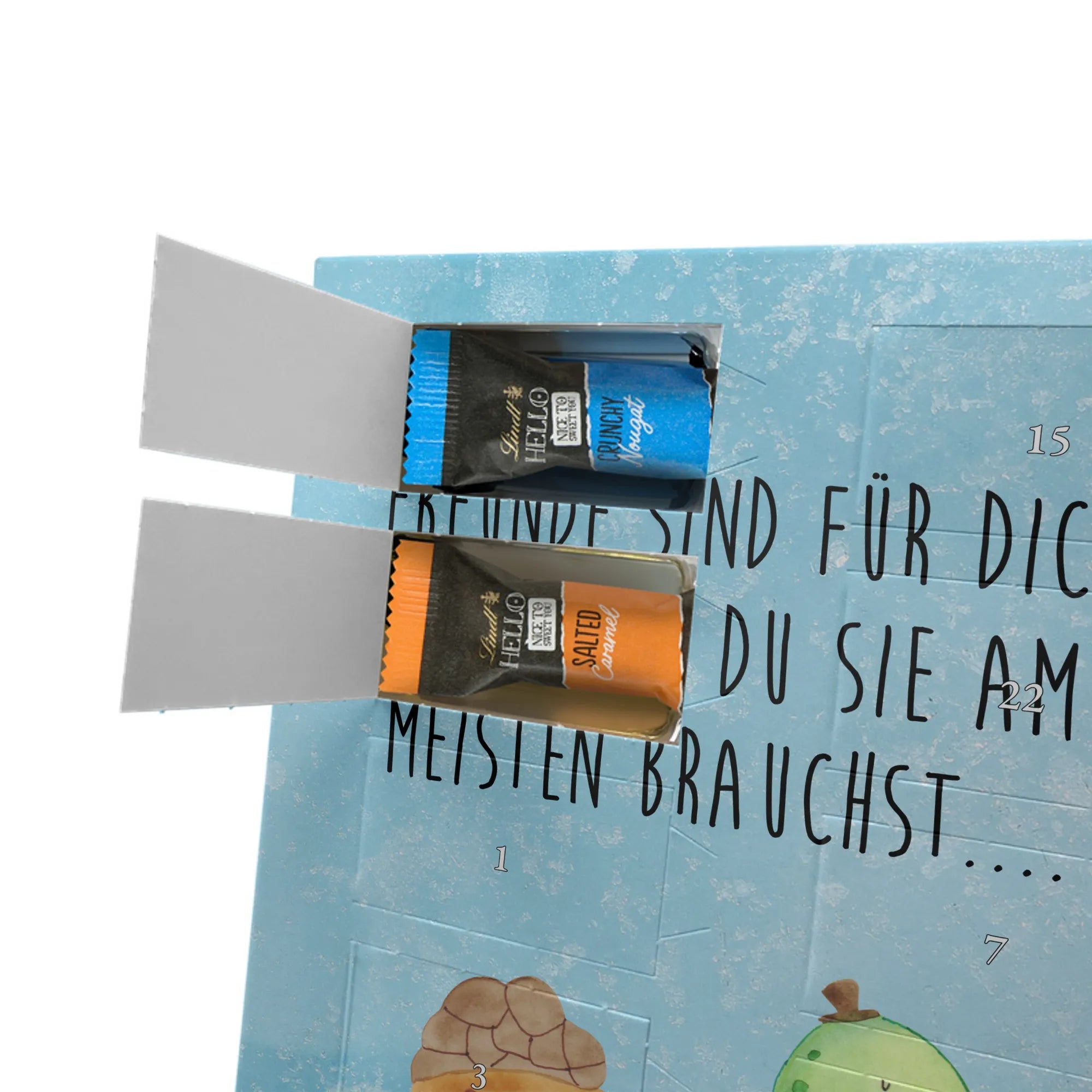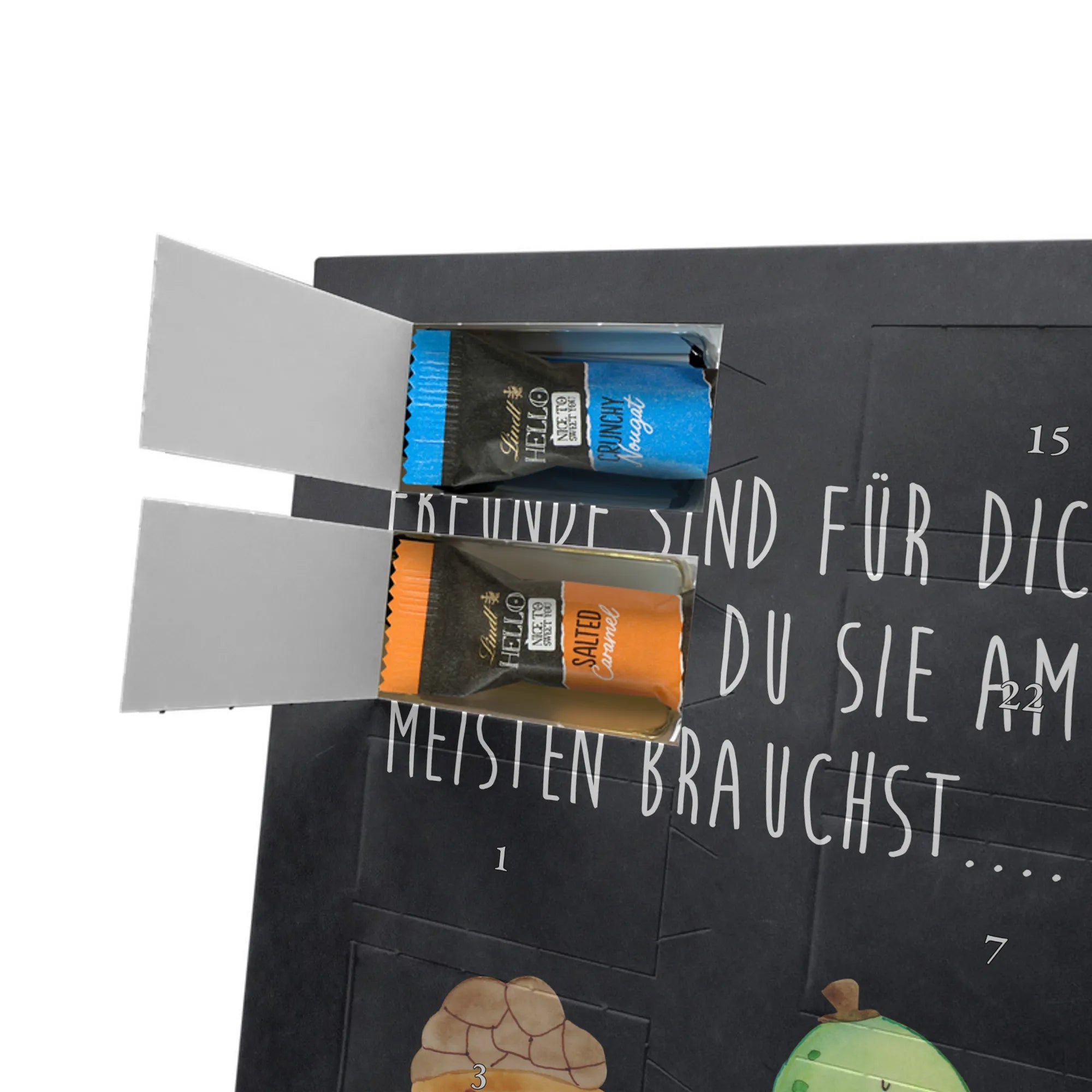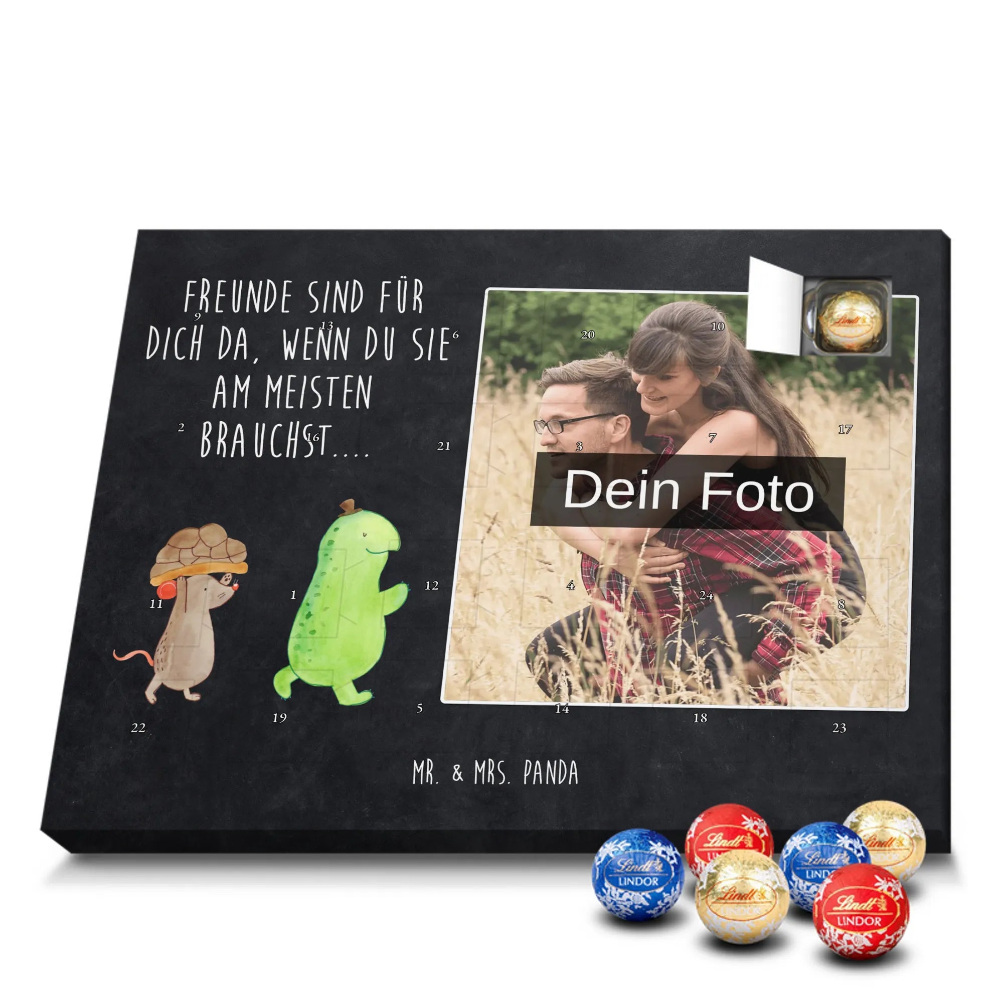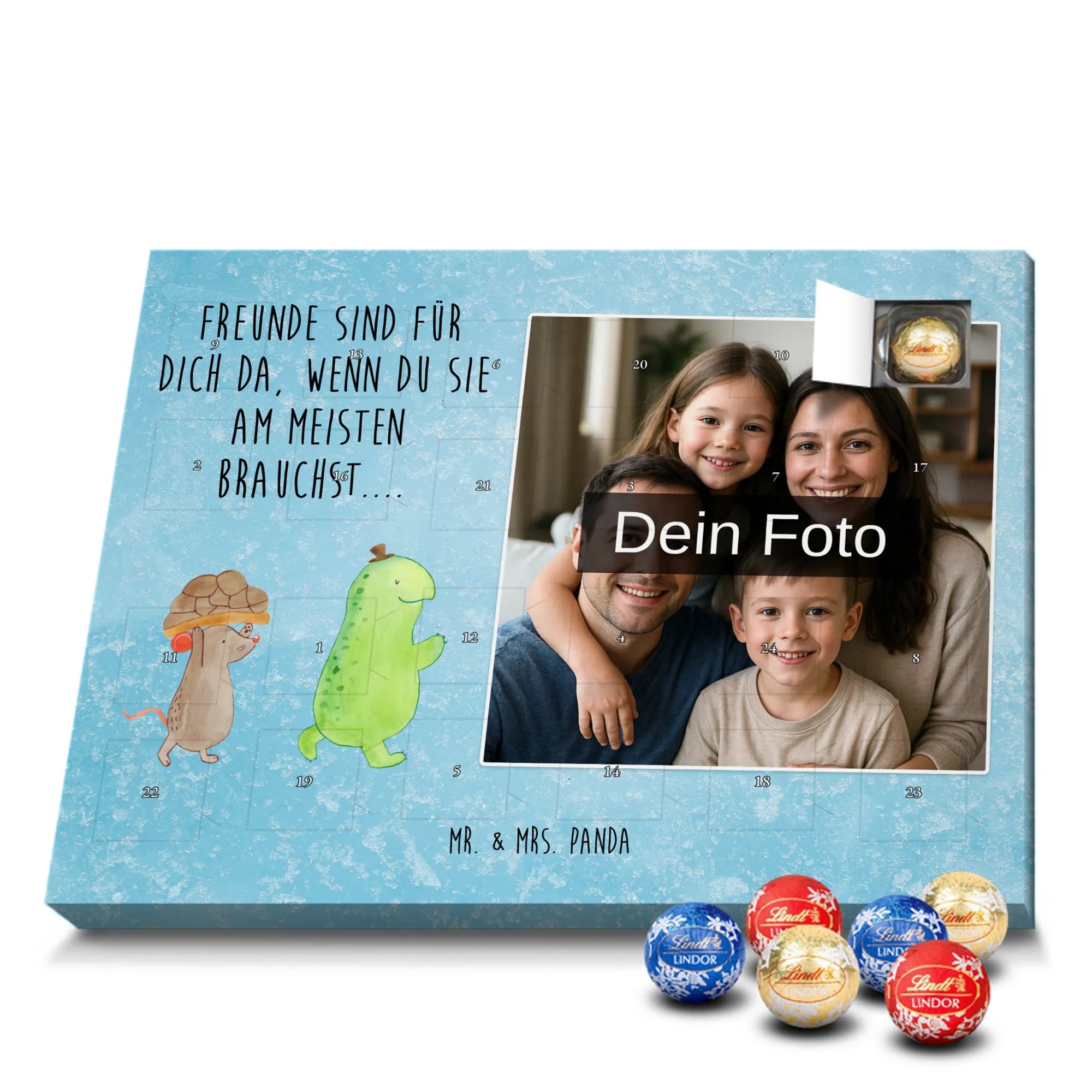 Schoko Foto Adventskalender personalisiert – ein fröhlicher Hingucker von Mr. & Mrs. Panda, der Adventszeit und Erinnerungen verbindet. Der Kalender ist bedruckt mit zauberhaften Motiven & Sprüchen von Mr. & Mrs. Panda und lässt sich ganz leicht mit einem Foto deiner Wahl personalisieren. Achtung Bildqualität: Für ein scharfes Druckbild solltest du ein Foto in hoher Auflösung verwenden. Kontrolliere den Bildausschnitt, damit wichtige Gesichter oder Details nicht verloren gehen. Verwende nur Fotos, für die du die Rechte besitzt oder die frei nutzbar sind. Bitte beachte: Die Fotos werden weder nachbearbeitet noch zugeschnitten und personalisierte Foto Artikel sind vom Umtausch ausgeschlossen. Die Verarbeitung überzeugt mit seidenmatter Oberflächenveredelung und bedruckten Seitenflächen für ein edles Finish. Maße: 325 mm x 225 mm x 27 mm. Besonderheit: Du kannst den Kalender aufhängen oder aufstellen – ganz flexibel. Gefüllt ist der Kalender mit Ritter Sport Schokowürfeln in leckeren Geschmacksrichtungen wie Mousse au Chocolat, Schoko Crisp, Voll-Nuss in Nougatcreme, Karamell Duo, Joghurt und Erdbeer-Joghurt. Ein liebevolles Geschenk, das jeden Tag im Advent versüßt.