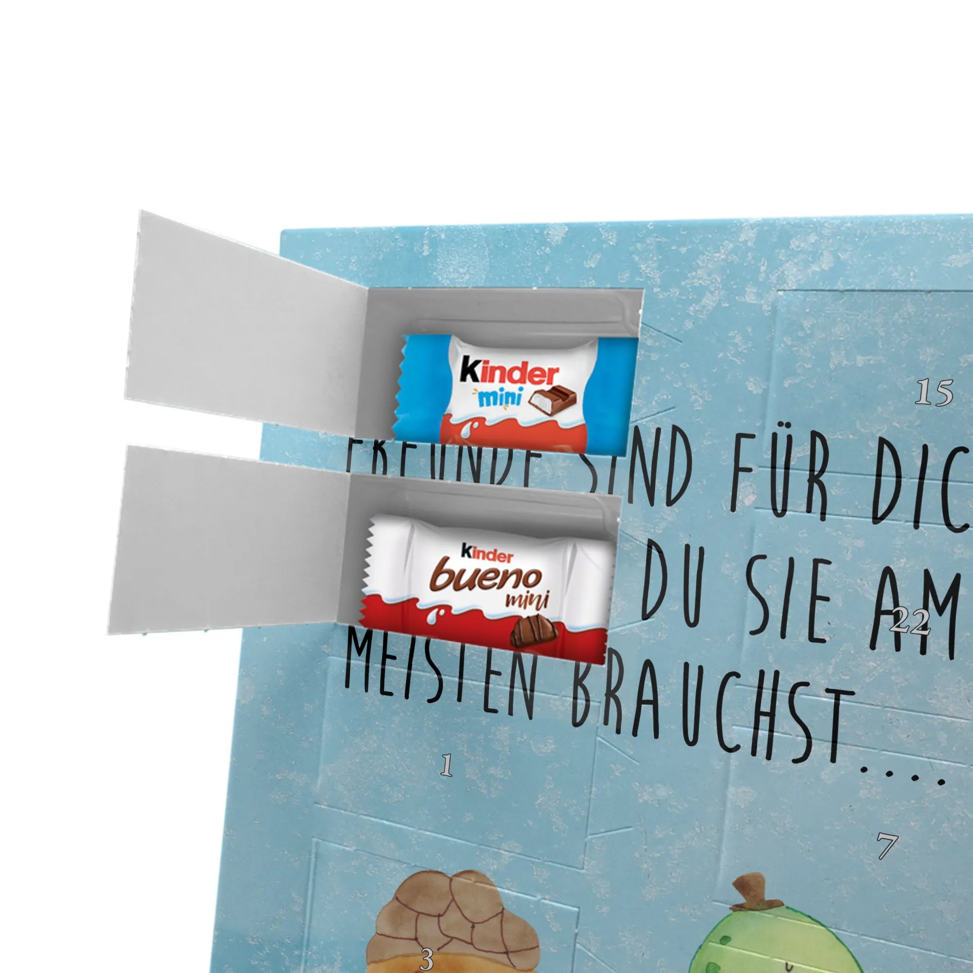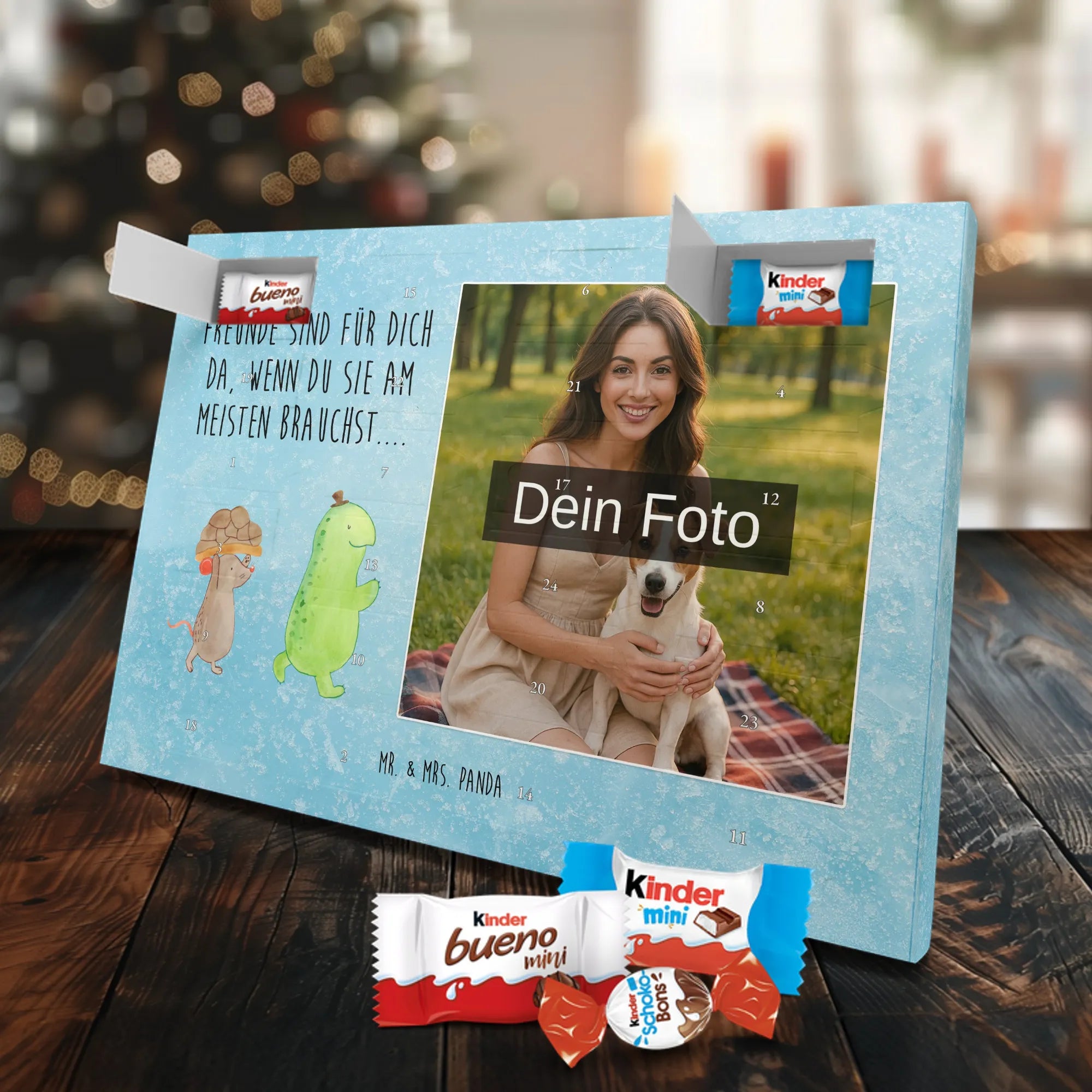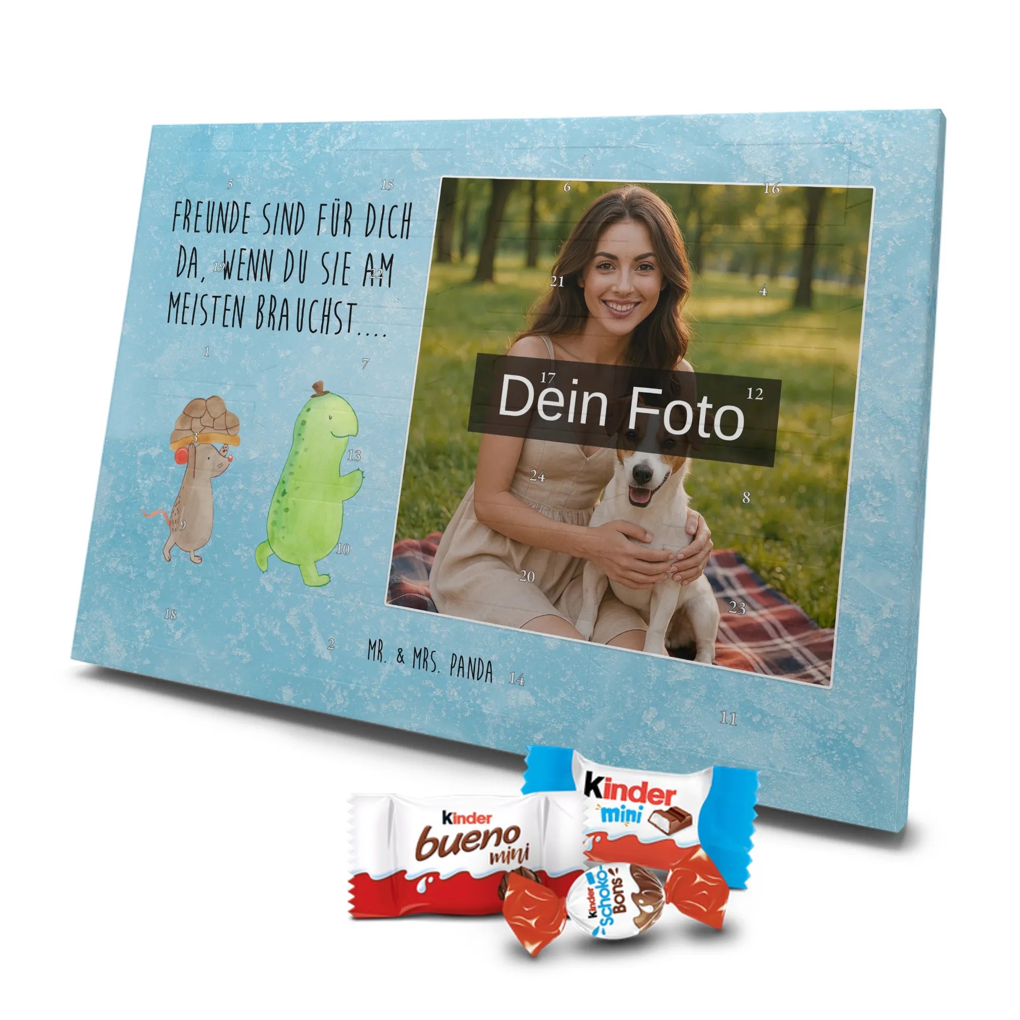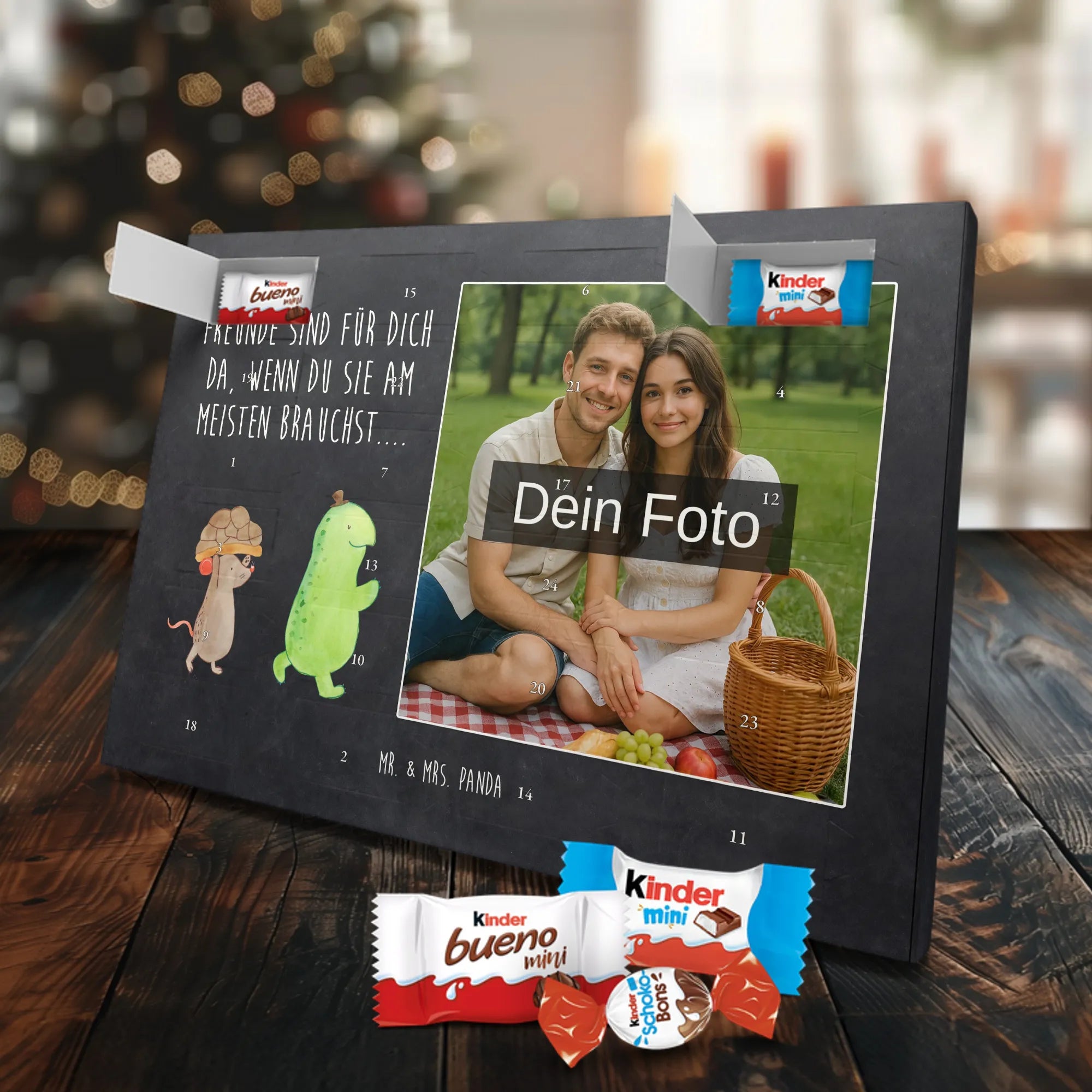 Unser personalisierten Schoko Foto Adventskalender ist ein echtes Highlight in der Adventszeit – handlich, individuell und voller süßer Überraschungen. Du personalisierst die Vorderseite mit deinem liebsten Foto und wir kombinieren es mit liebevollen Motiven und Sprüchen von Mr. & Mrs. Panda. Bitte achte auf eine ausreichende Bildauflösung und einen passenden Bildausschnitt, damit das Druckergebnis gestochen scharf ist. Lade nur Bilder hoch, deren Rechte du besitzt oder bei denen du die Erlaubnis hast, besonders wenn Personen darauf zu sehen sind. Wichtig: Fotos werden nicht retuschiert oder zugeschnitten; personalisierte Foto-Artikel sind vom Widerruf ausgeschlossen. Der Kalender besticht durch brillante Druckqualität und eine seidenmatte Oberflächenveredelung sowie bedruckte Seitenflächen. Maße: 355 mm x 245 mm x 11 mm. Du kannst ihn entweder aufstellen oder an die Wand hängen. Gefüllt ist der Adventskalender mit kinder® Schokolade, inklusive kinder® Schoko-Bons, kinder® Bueno mini und kinder® Schokolade mini. Ein liebevolles, persönliches Geschenk für Kinder, Freunde oder die bessere Hälfte – individuell, süß und mit dem typischen Mr. & Mrs. Panda Charme.