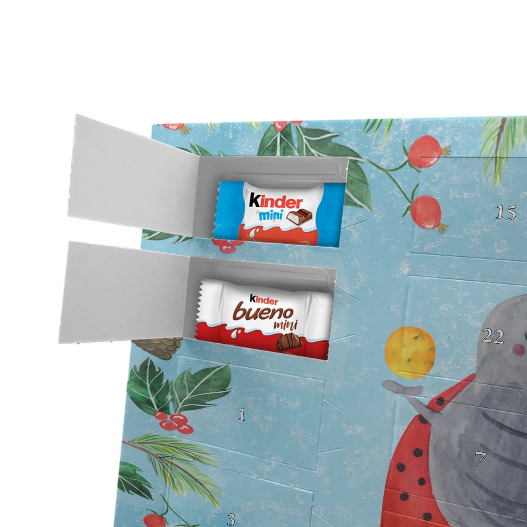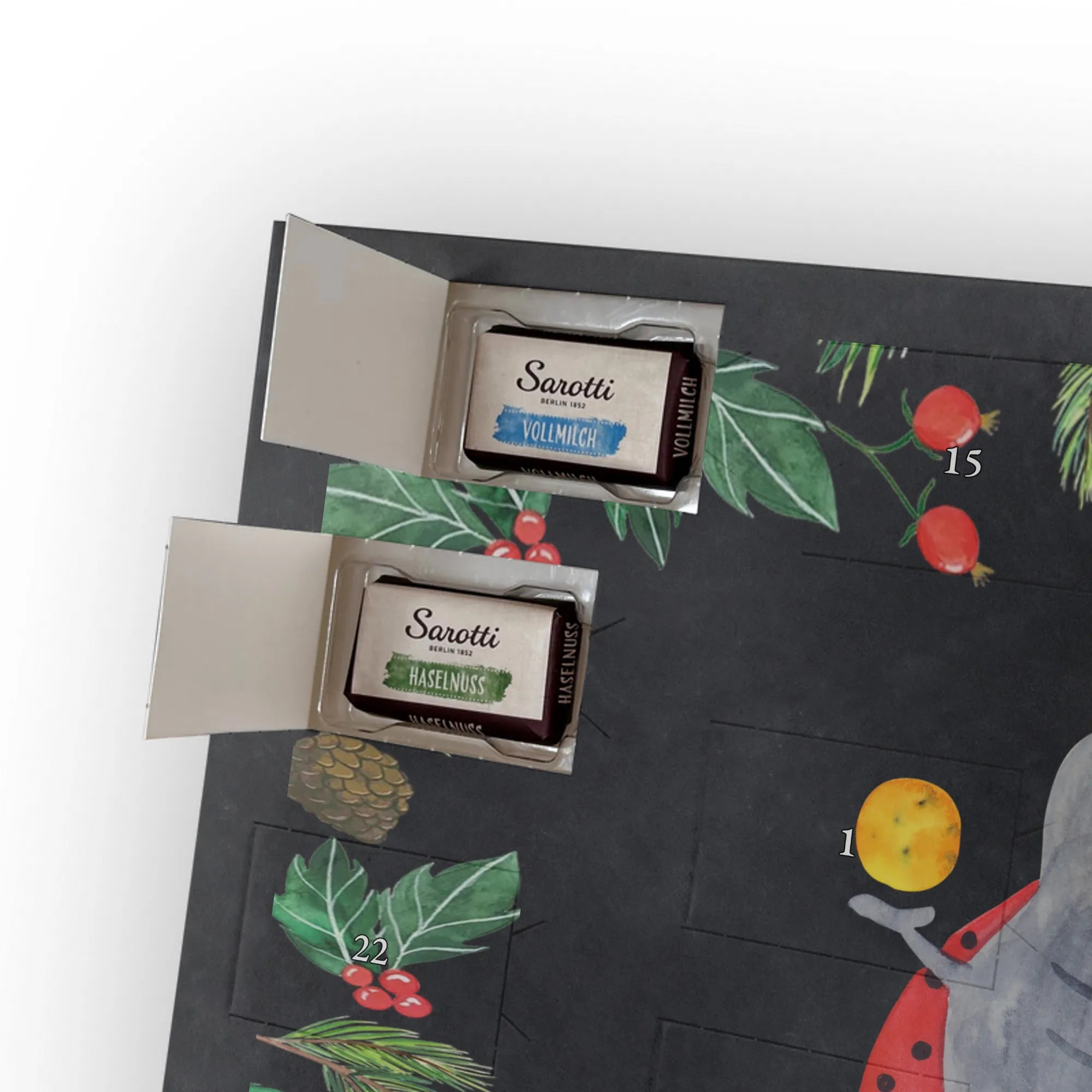 This handy advent calendar 2020 from Mr. & Mrs. Panda is really something very special - it is decorated with wonderful motifs and has the size 24m x 18cm x 2,5cm. It is filled with 24 chocolate balls and costs 14,90€ - the calendar can be hung up or set up using the set-up function on the back. Please note that we also have a larger calendar with delicious chocolate from Hello Lindt.