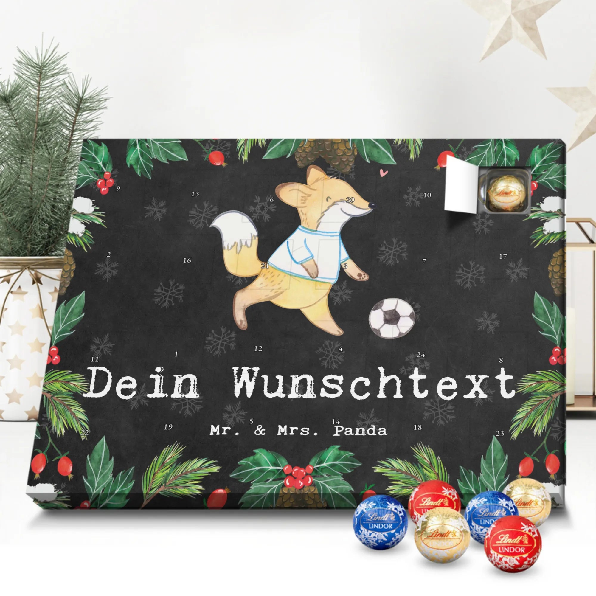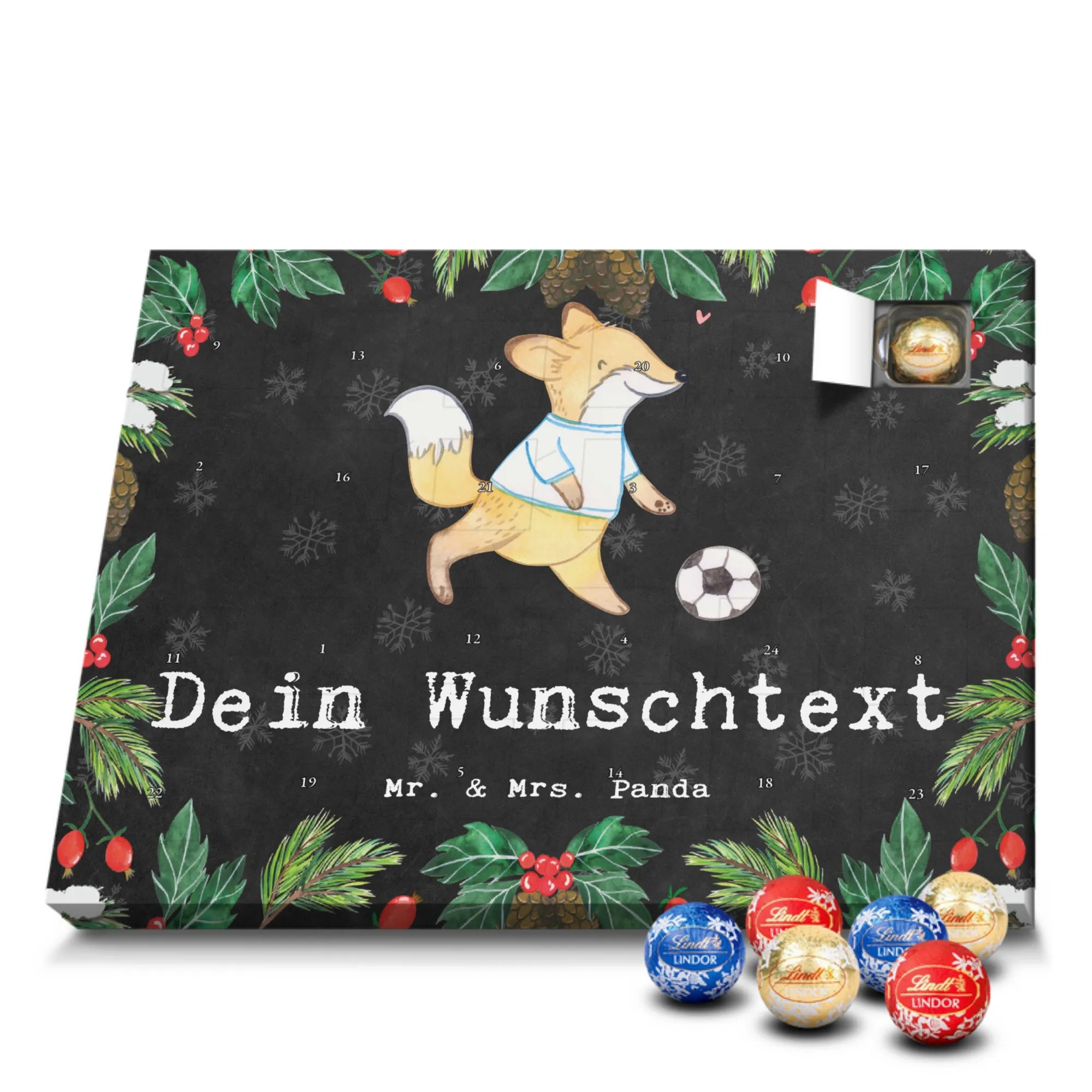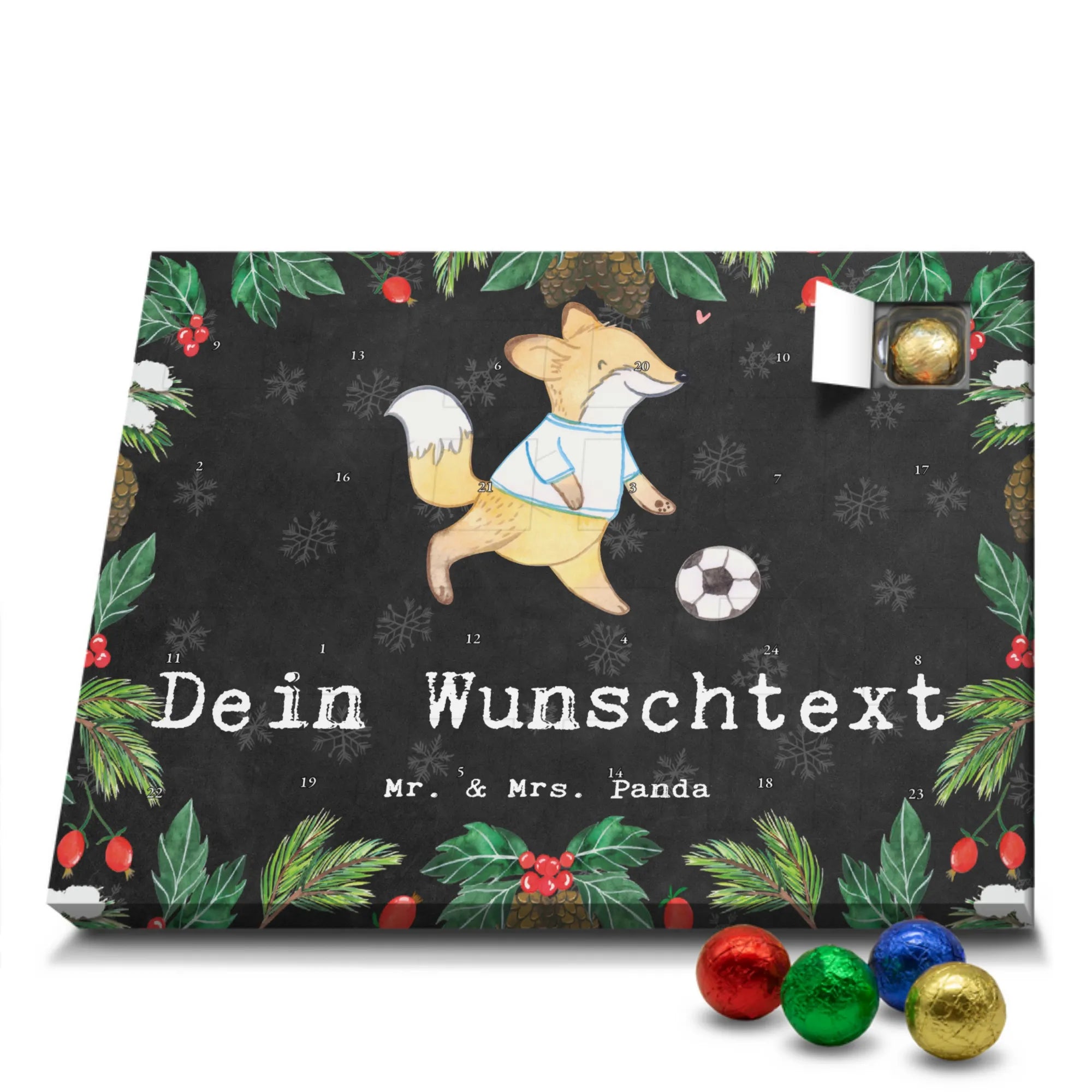 Make the Advent season even more special with the personalized chocolate Advent calendar from Mr. & Mrs. Panda. This unique Advent calendar is printed with your desired name or a custom text and features exclusive designs and sayings from the renowned designer duo. It's not only a visual highlight but also delights taste buds with 24 high-quality chocolate balls in various colors. The brilliant print quality and the silk-matte finish make this calendar a true eye-catcher during the Christmas season.