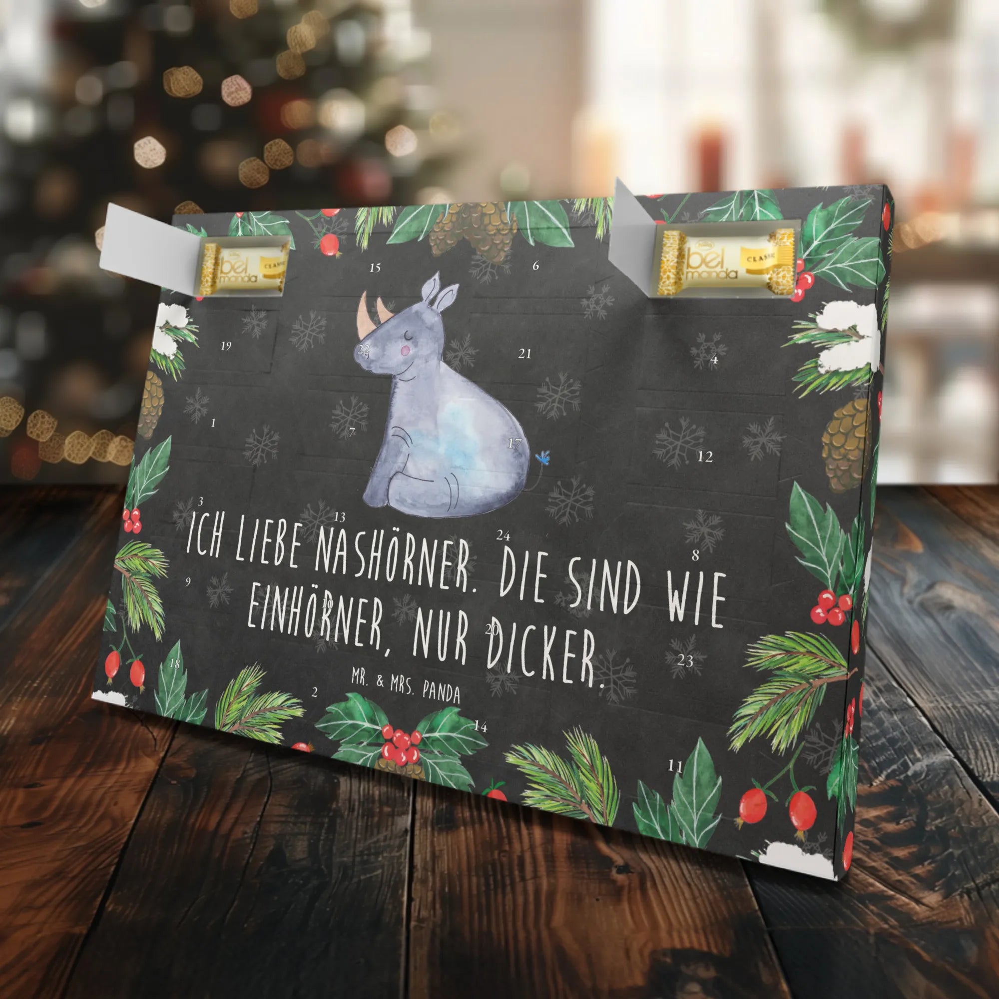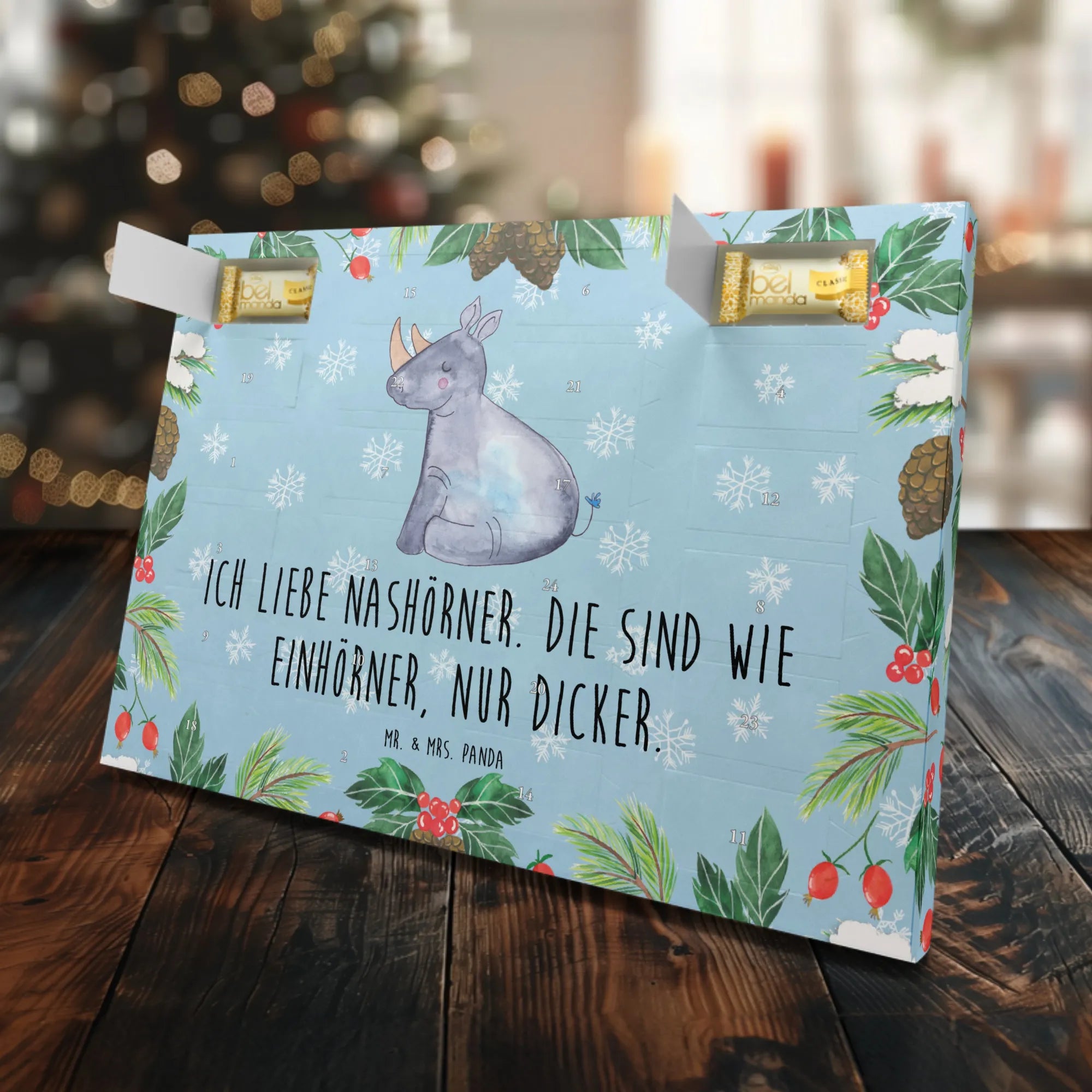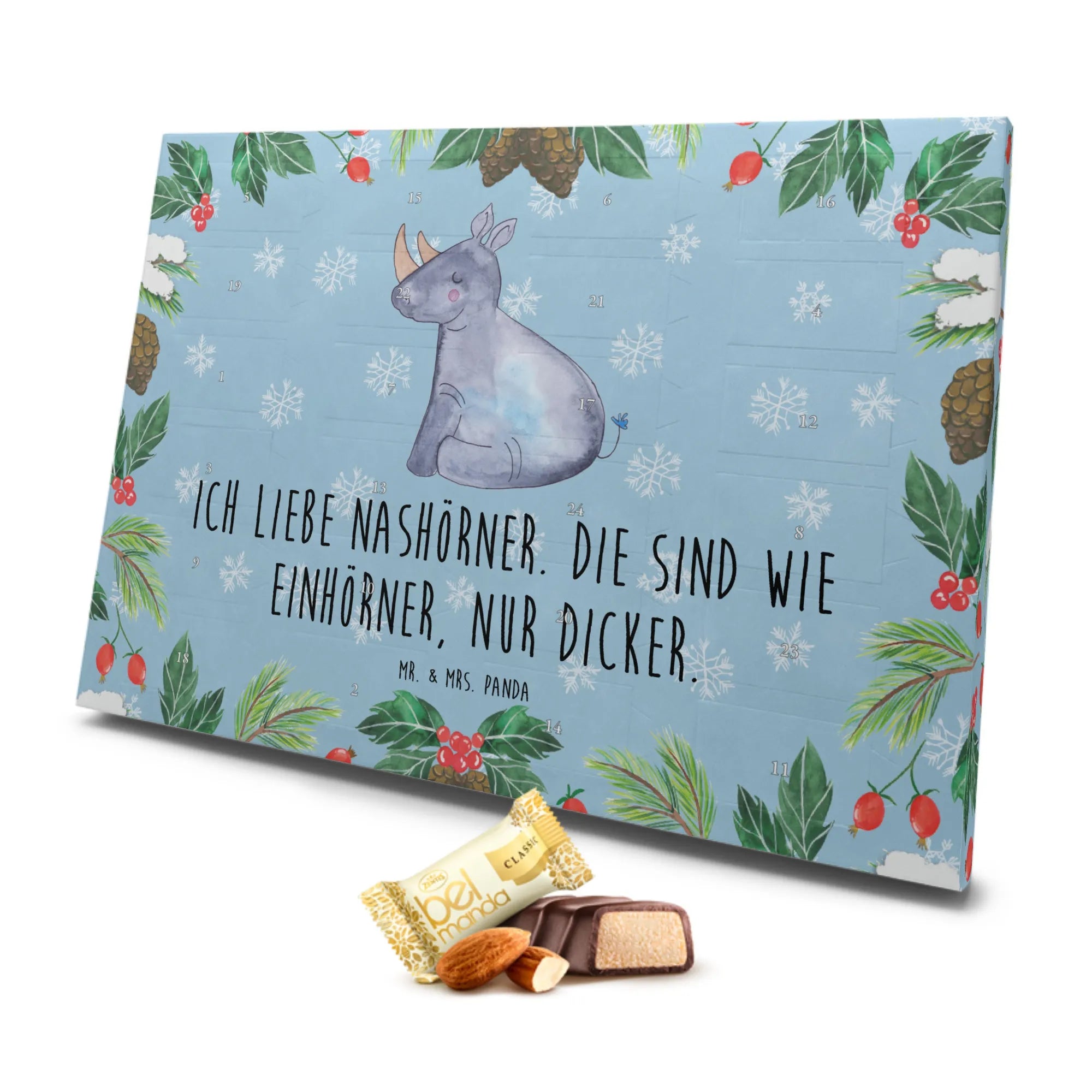 Der Marzipan Adventskalender mit dem liebevollen Einhorn Nashorn-Motiv von Mr. & Mrs. Panda ist das perfekte Geschenk für alle Einhorn-Fans und Freunde des lustigen Designs. Dieser außergewöhnliche Kalender bringt nicht nur Freude während der Vorweihnachtszeit, sondern sorgt auch für so manches Schmunzeln.