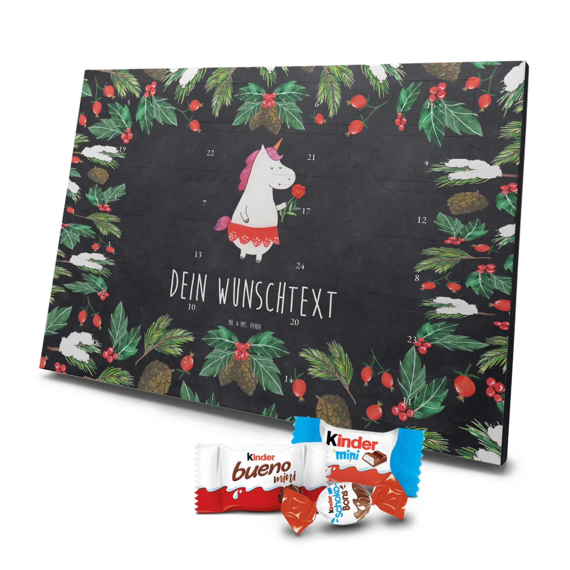 Make the Advent season even more special with the personalized chocolate Advent calendar from Mr. & Mrs. Panda. This unique Advent calendar is printed with your desired name or a custom text and features exclusive designs and sayings from the renowned designer duo. It's not only a visual highlight but also delights taste buds with 24 high-quality chocolate balls in various colors. The brilliant print quality and the silk-matte finish make this calendar a true eye-catcher during the Christmas season.
