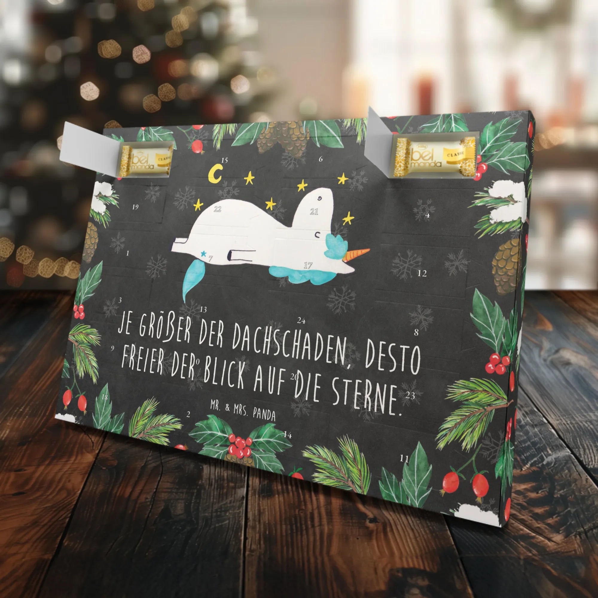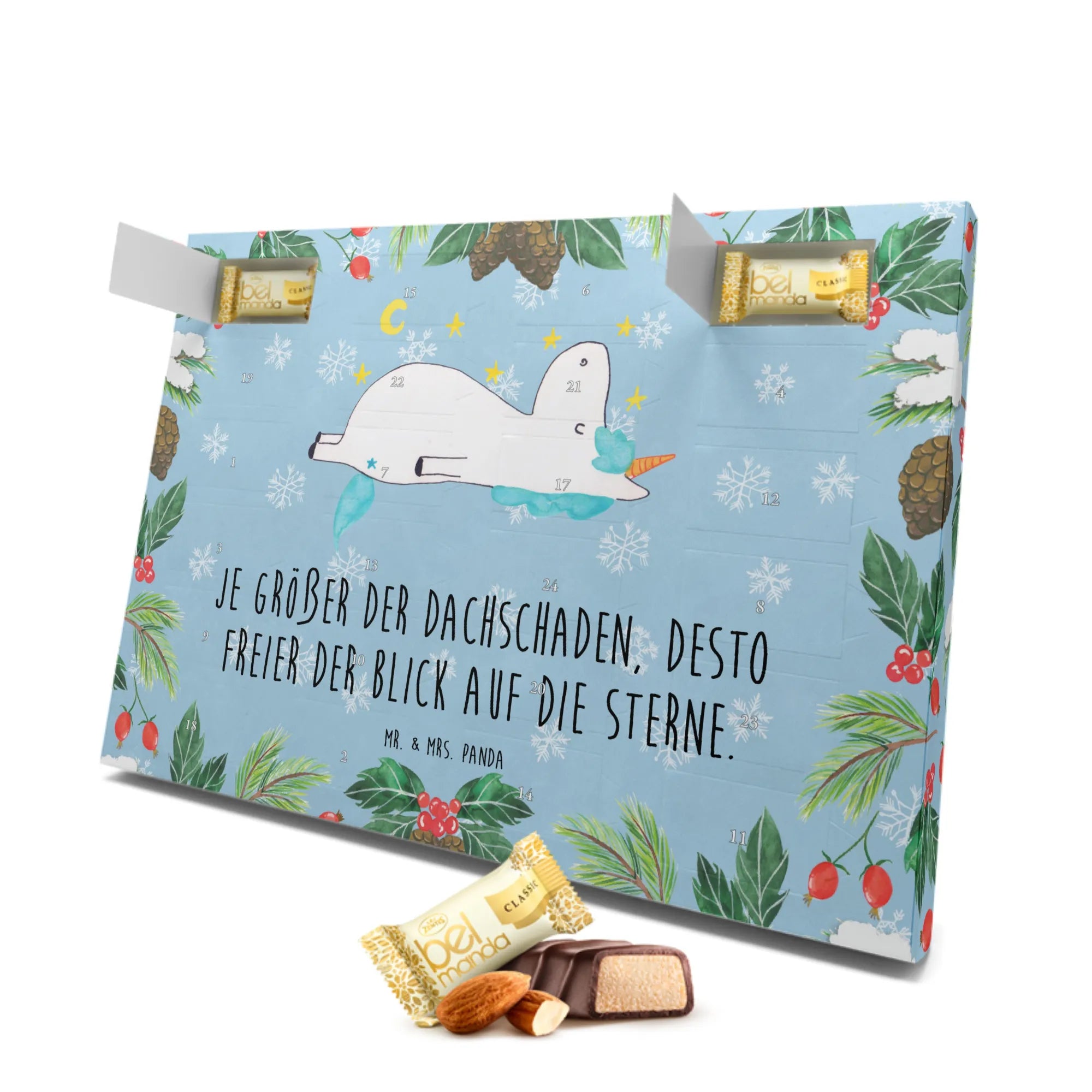 Gefüllt mit 24 einzeln verpackten Edelmarzipan Pralinés sorgt er dafür, dass jeder Tag bis Weihnachten etwas ganz Besonderes wird. Jedes Türchen des Kalenders birgt ein geschmackvolles Marzipan-Praliné, das nicht nur lecker ist, sondern auch deine Vorfreude auf das Fest steigert. Das wunderschöne Design zeigt ein traumhaftes Einhorn, das verträumt den funkelnden Sternenhimmel beobachtet, und erinnert uns daran, dass wir ein wenig verrückt sein dürfen – denn: "Je größer der Dachschaden, desto freier der Blick auf die Sterne!"