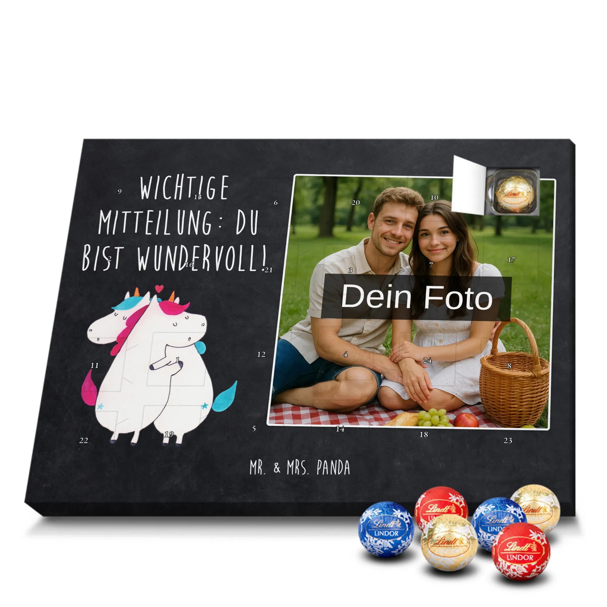 Entdecke unseren charmanten Personalisierter Schoko-Foto Adventskalender von Mr. & Mrs. Panda – ein liebevolles Geschenk für Freunde, Familie oder dich selbst. Aufdrucke mit süßen Motiven und herzlichen Sprüchen begleiten dein persönliches Foto, das du individuell hochlädst. Achte bitte auf eine ausreichende Auflösung des Bildes und einen passenden Bildausschnitt, damit das Druckbild klar bleibt. Wir weisen darauf hin, dass Fotos nicht nachbearbeitet oder zugeschnitten werden; achte daher auf Bildrechte und Zustimmung der abgebildeten Personen. Die Verarbeitung überzeugt durch eine seidenmatte Oberflächenveredelung und bedruckte Seitenflächen; dadurch wirkt der Kalender sehr hochwertig. Der Kalender ist vielseitig: Du kannst ihn sowohl aufstellen als auch aufhängen. Maße: 233 mm x 178 mm x 24 mm. Gefüllt mit Lindt Lindor Markenschokolade – 24 einzeln verpackte Markenschokoladen Kugeln in den Geschmacksrichtungen Vollmilch, Feinherb und Weiße Schokolade. Zutaten und Allergene sind auf der Verpackung angegeben; es kann Spuren von Haselnüssen und Mandeln geben. Hinweis: Personalisierte Foto-Artikel sind vom Umtausch ausgeschlossen.