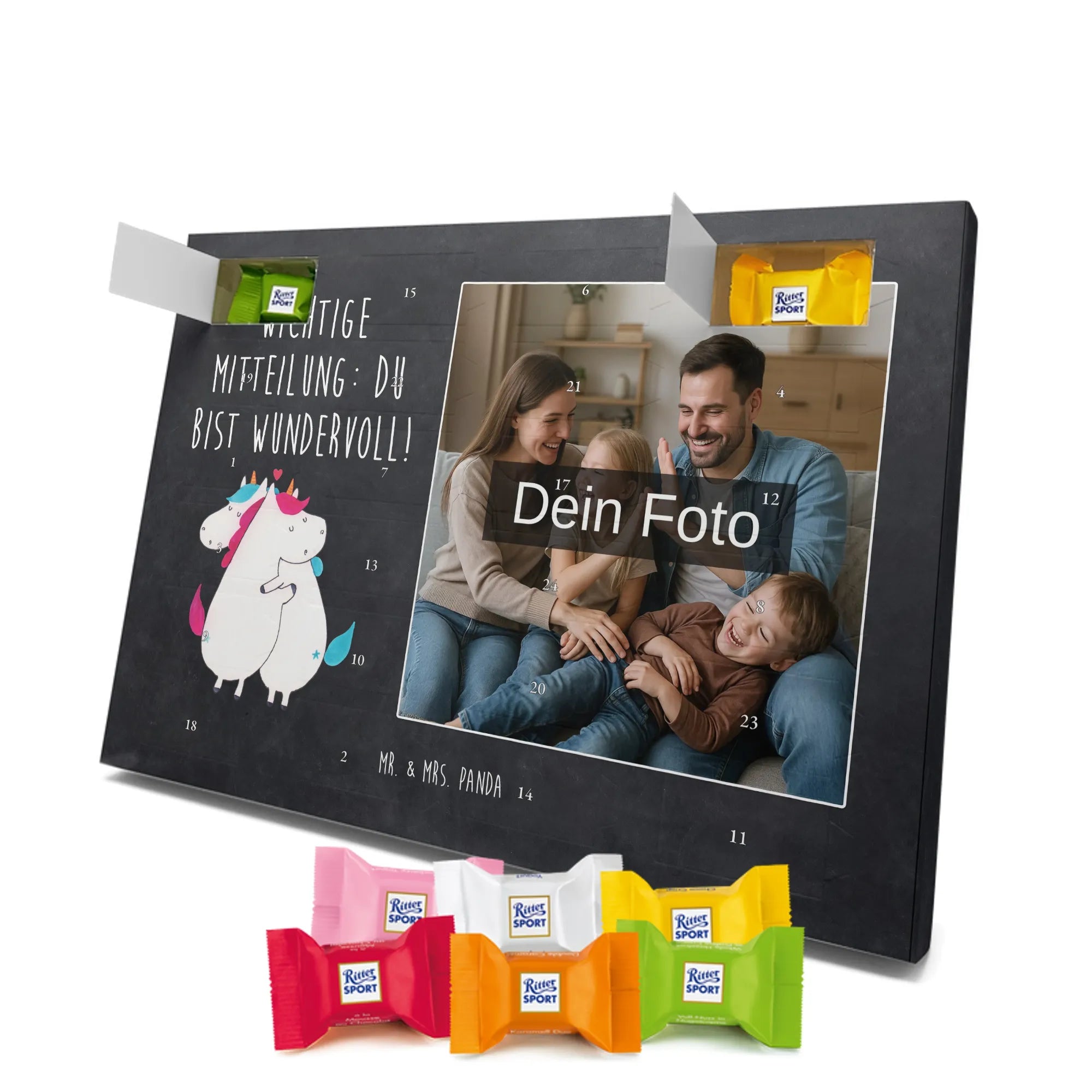 Wunderschöner Personalisierter Schoko Foto Adventskalender von Mr. & Mrs. Panda – das perfekte Geschenk für deine Liebsten! Dieser Adventskalender ist liebevoll gestaltet, bedruckt mit wunderschönen Motiven & Sprüchen von Mr. & Mrs. Panda und personalisierbar mit einem Foto deiner Wahl. Achte bitte auf hohe Auflösung: Lade ein Foto in guter Qualität und ausreichender Auflösung hoch, damit das Druckergebnis klar und brillant wird. Achte auf den richtigen Bildausschnitt, damit keine wichtigen Details abgeschnitten werden. Wir empfehlen, den Kalender-Rahmen vorher anzusehen, um zu wissen, wie dein Foto platziert wird. Lade nur Bilder hoch, bei denen du die Bildrechte besitzt oder die Erlaubnis hast. Die Fotos werden weder aufbereitet noch zugeschnitten. Rücknahme bei personalisierten Foto Artikeln ist ausgeschlossen. Der Kalender besticht durch brillante Druckqualität mit seidenmatter Oberflächenveredelung und bedruckte Seitenflächen. Maße: 325 mm x 225 mm x 27 mm. Besonderheit: Kann aufgehängt oder aufgestellt werden – ganz wie du möchtest. Gefüllt ist der Kalender mit Ritter Sport Schokowürfeln in leckeren Geschmacksrichtungen: Mousse au Chocolat, Schoko Crisp, Voll-Nuss in Nougatcreme, Karamell Duo, Joghurt und Erdbeer-Joghurt. Ein zauberhaftes, persönliches Geschenk, das Vorfreude bereitet und jeden Tag im Advent versüßt!