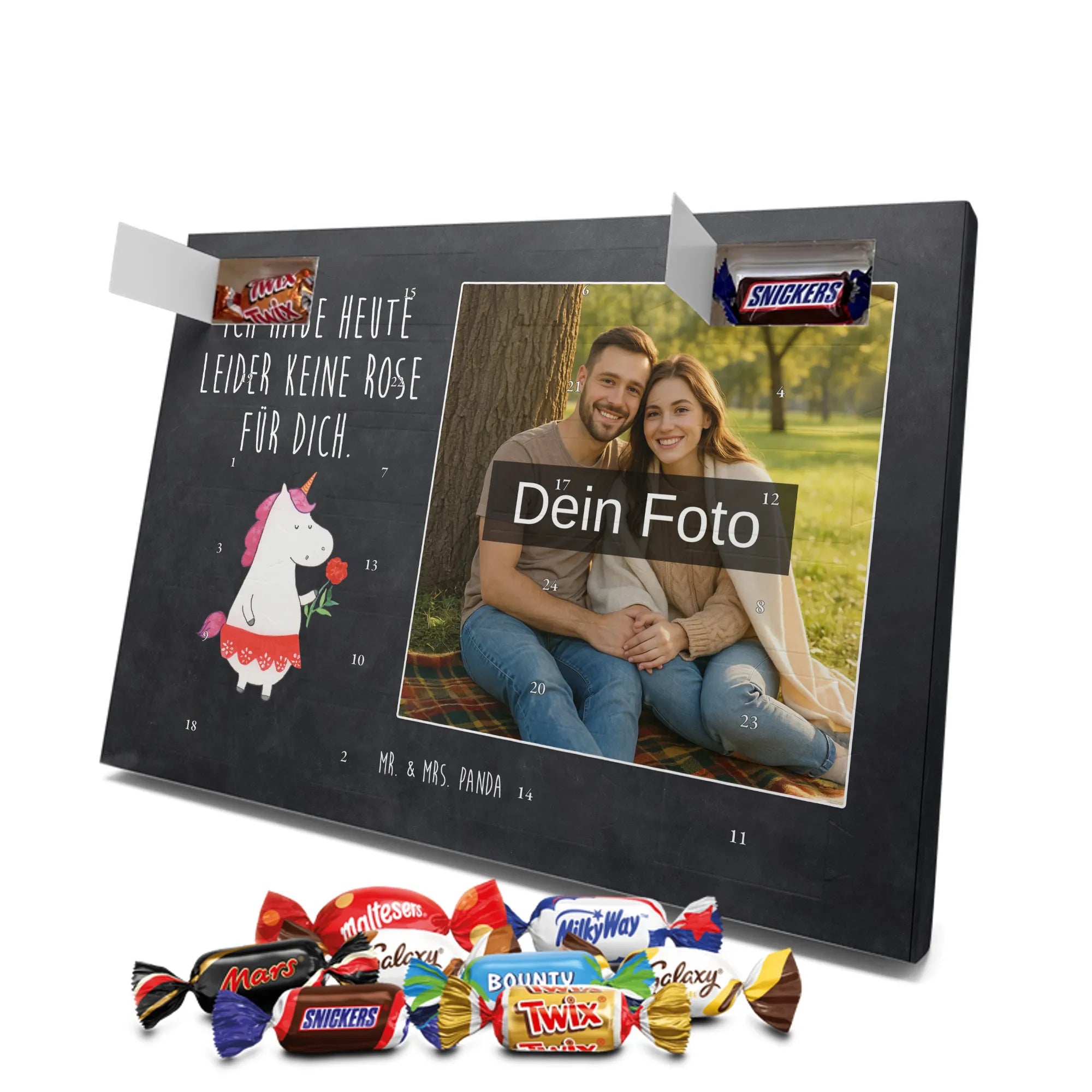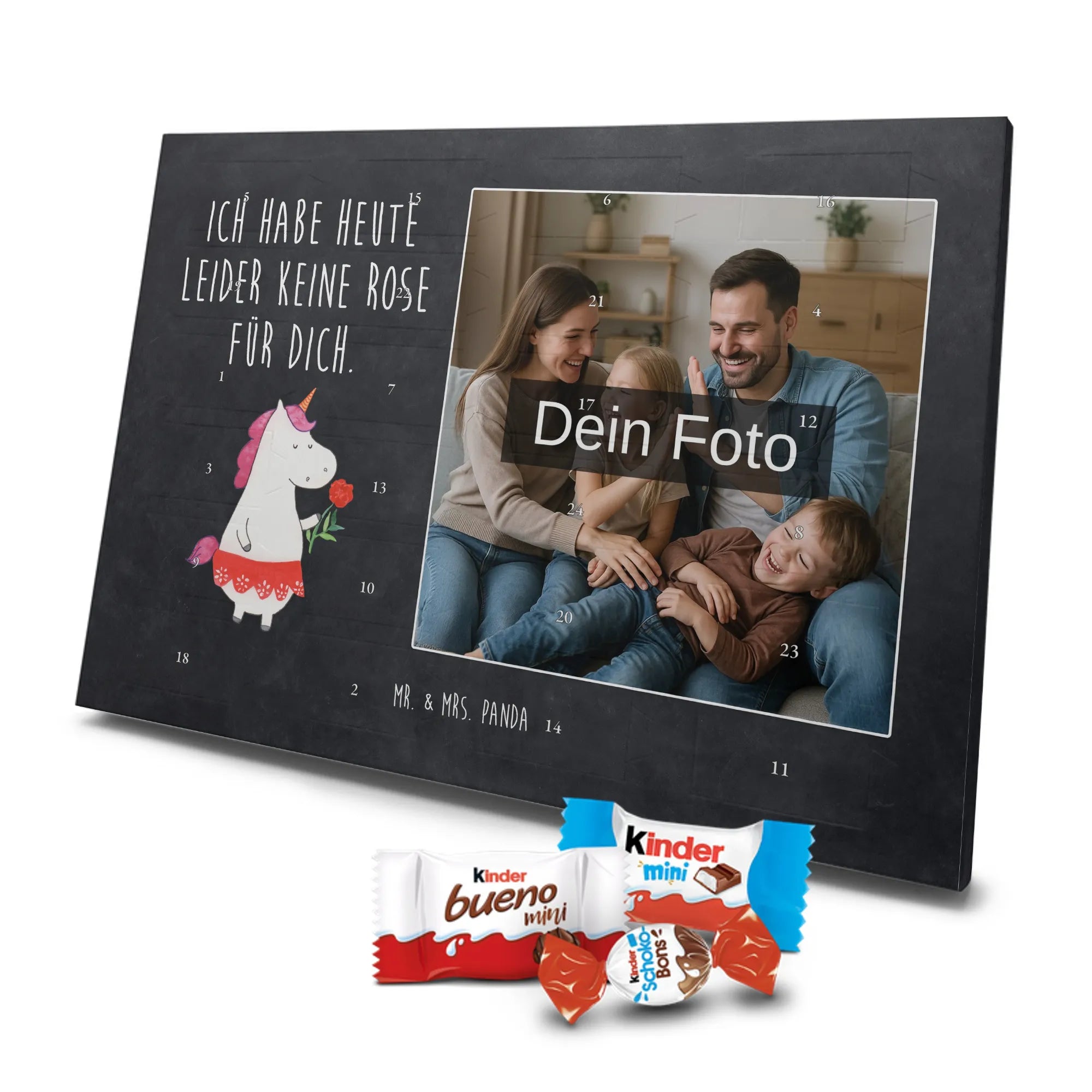 Personalisierter Schoko-Foto-Adventskalender von Mr. & Mrs. Panda – perfekt, wenn du ein einzigartiges, herzhaft-süßes Geschenk suchst. Du lädst ein Foto hoch, das wir auf der Vorderseite platzieren; der Rest des Kalenders ist mit unseren liebevollen Illustrationen und frechen Sprüchen gestaltet. Achte bitte darauf, dass das Bild eine hohe Auflösung hat und der Bildausschnitt passt, damit das Druckbild schön und scharf wird. Lade nur Fotos hoch, an denen du die Rechte besitzt oder für die du die Erlaubnis hast. Wichtig: Wir bearbeiten oder kürzen die Fotos nicht und personalisierte Artikel sind vom Rückgaberecht ausgeschlossen. Die hochwertige, seidenmatte Oberflächenveredelung sorgt für edle Optik, die bedruckten Seitenflächen geben dem Kalender eine liebevolle Note. Maße: 355 mm x 245 mm x 11 mm. Du kannst den Kalender aufstellen oder aufhängen – ganz wie du möchtest. Gefüllt ist er mit kinder® Schokolade: enthalten sind kinder® Schoko-Bons, kinder® Bueno mini und kinder® Schokolade mini. Wir empfehlen, vor dem Hochladen den Bildausschnitt am Bildschirm zu prüfen, damit Gesichter und wichtige Details nicht abgeschnitten werden. Dieser Adventskalender ist ideal für Paare, Familien und als persönliches Mitbringsel – mit ganz viel Mr. & Mrs. Panda Herz.