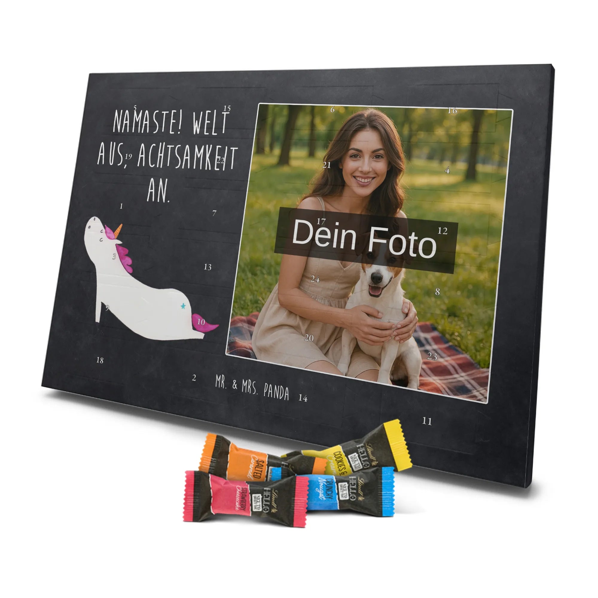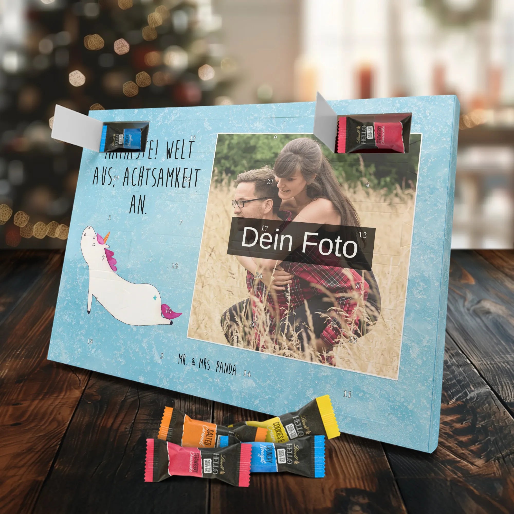🐼 PERSONALISIERTES ADVENTS-SCHOKOKALENDER: Foto, Mr. & Mrs. Panda Motive & Lindt Hello Minis vereint.