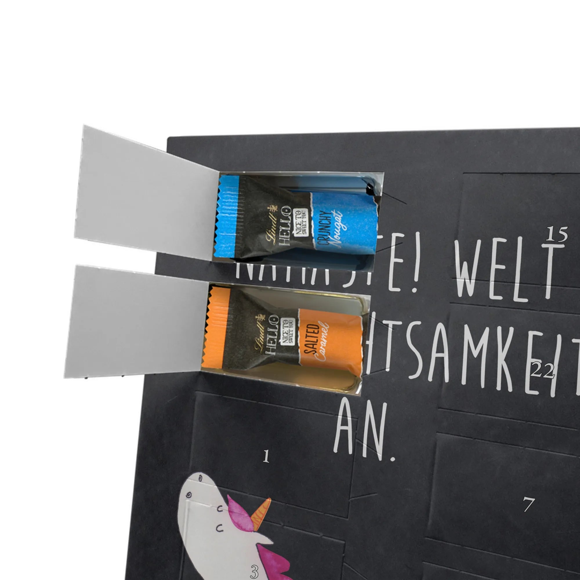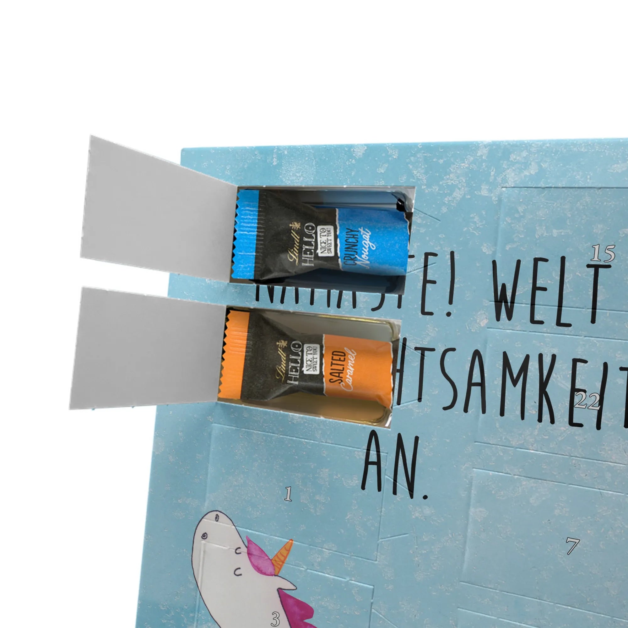 Entdecke unseren personalisierten Schoko-Foto-Adventskalender von Mr. & Mrs. Panda – ein liebevoll gestalteter Adventsbegleiter, der dich jeden Tag im Dezember mit süßen Überraschungen verwöhnt. Der Kalender ist mit charmanten Motiven und kurzen Sprüchen bedruckt und lässt sich mit deinem Lieblingsfoto personalisieren. Achte auf eine gute Bildqualität und den richtigen Bildausschnitt, damit dein Foto sauber gedruckt wird. Bitte nur Fotos hochladen, bei denen du die Rechte besitzt. Die hochwertige, seidenmatte Oberfläche und die bedruckten Seitenflächen verleihen dem Kalender einen besonderen Look. Maße: 325 mm x 225 mm x 27 mm. Innen findest du 24 einzeln verpackte Schokoladen Mini Sticks in vier köstlichen Sorten: Karamell-Schokoladenkuchen, Kekse, Knuspriger Nougat und Erdbeer-Cheesecake. Gefüllt mit Lindt Hello Schokolade. Wichtige Hinweise: Allergene wie Milcheiweiß, Milchzucker, Soja, Weizen und Haselnüsse sind enthalten. Kann Spuren von Mandeln und anderen Schalenfrüchten enthalten. Der Kalender kann aufgehängt oder aufgestellt werden. Hinweis: Fotos werden nicht nachbearbeitet oder zugeschnitten – Rücknahme ausgeschlossen. Verschenke Vorfreude mit deinem individuellen Foto-Adventskalender!
