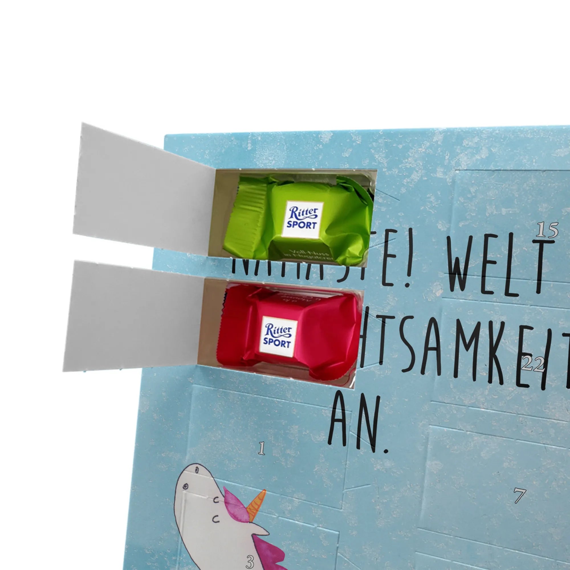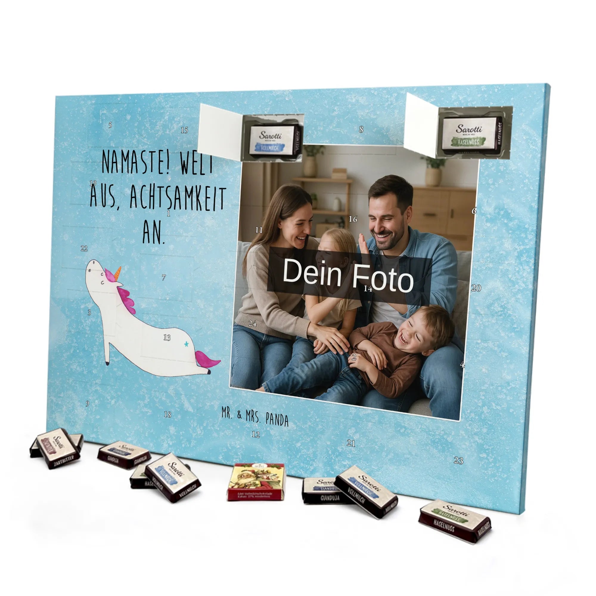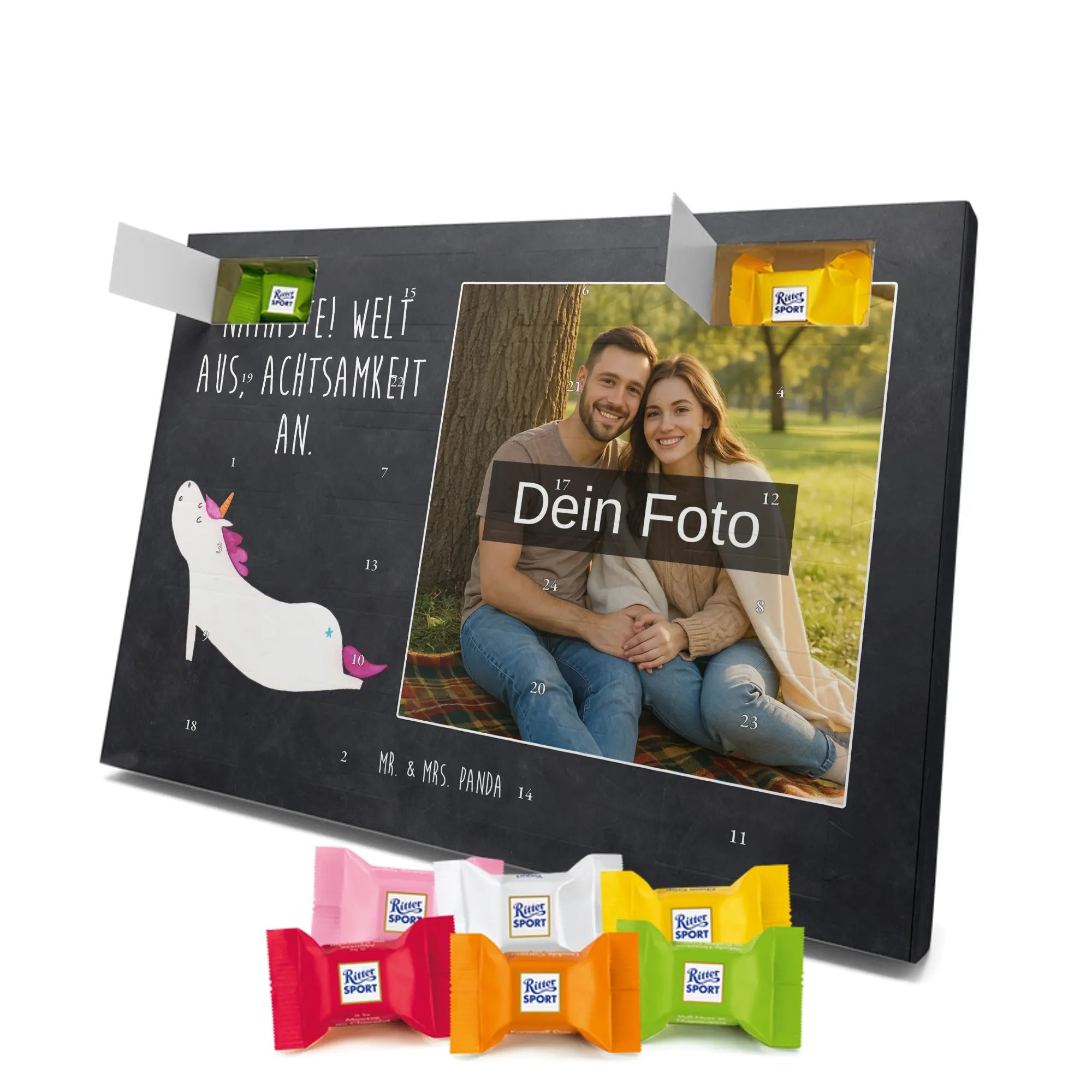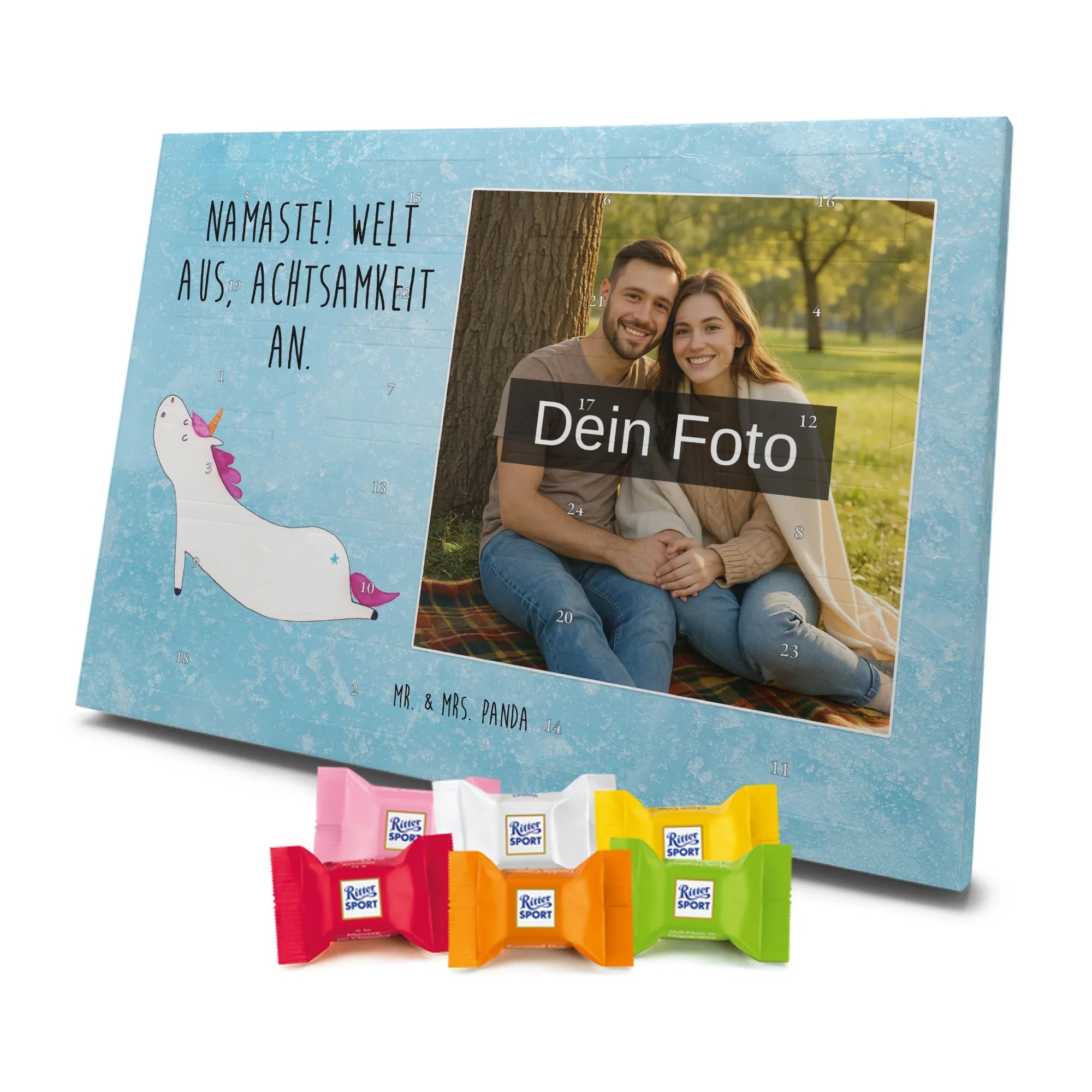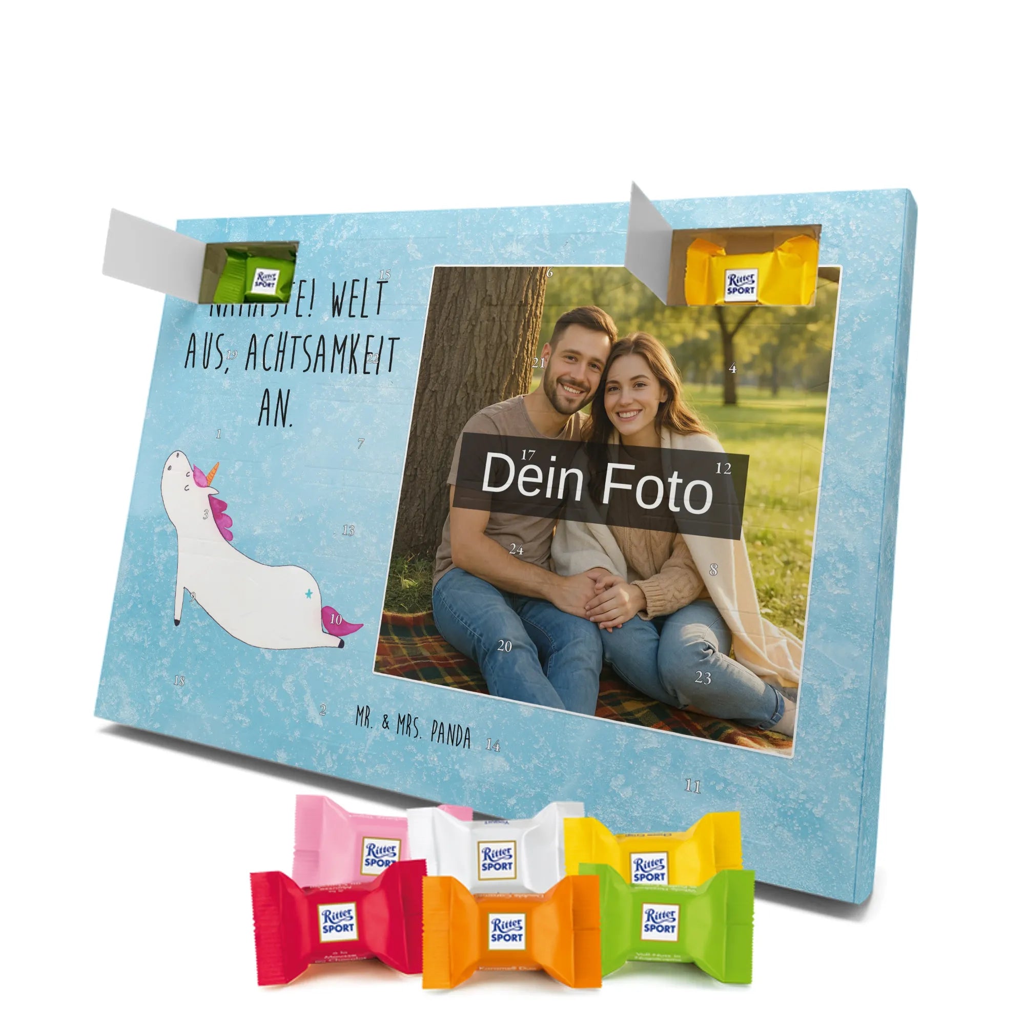 Schoko Foto Adventskalender personalisiert – ein fröhlicher Hingucker von Mr. & Mrs. Panda, der Adventszeit und Erinnerungen verbindet. Der Kalender ist bedruckt mit zauberhaften Motiven & Sprüchen von Mr. & Mrs. Panda und lässt sich ganz leicht mit einem Foto deiner Wahl personalisieren. Achtung Bildqualität: Für ein scharfes Druckbild solltest du ein Foto in hoher Auflösung verwenden. Kontrolliere den Bildausschnitt, damit wichtige Gesichter oder Details nicht verloren gehen. Verwende nur Fotos, für die du die Rechte besitzt oder die frei nutzbar sind. Bitte beachte: Die Fotos werden weder nachbearbeitet noch zugeschnitten und personalisierte Foto Artikel sind vom Umtausch ausgeschlossen. Die Verarbeitung überzeugt mit seidenmatter Oberflächenveredelung und bedruckten Seitenflächen für ein edles Finish. Maße: 325 mm x 225 mm x 27 mm. Besonderheit: Du kannst den Kalender aufhängen oder aufstellen – ganz flexibel. Gefüllt ist der Kalender mit Ritter Sport Schokowürfeln in leckeren Geschmacksrichtungen wie Mousse au Chocolat, Schoko Crisp, Voll-Nuss in Nougatcreme, Karamell Duo, Joghurt und Erdbeer-Joghurt. Ein liebevolles Geschenk, das jeden Tag im Advent versüßt.