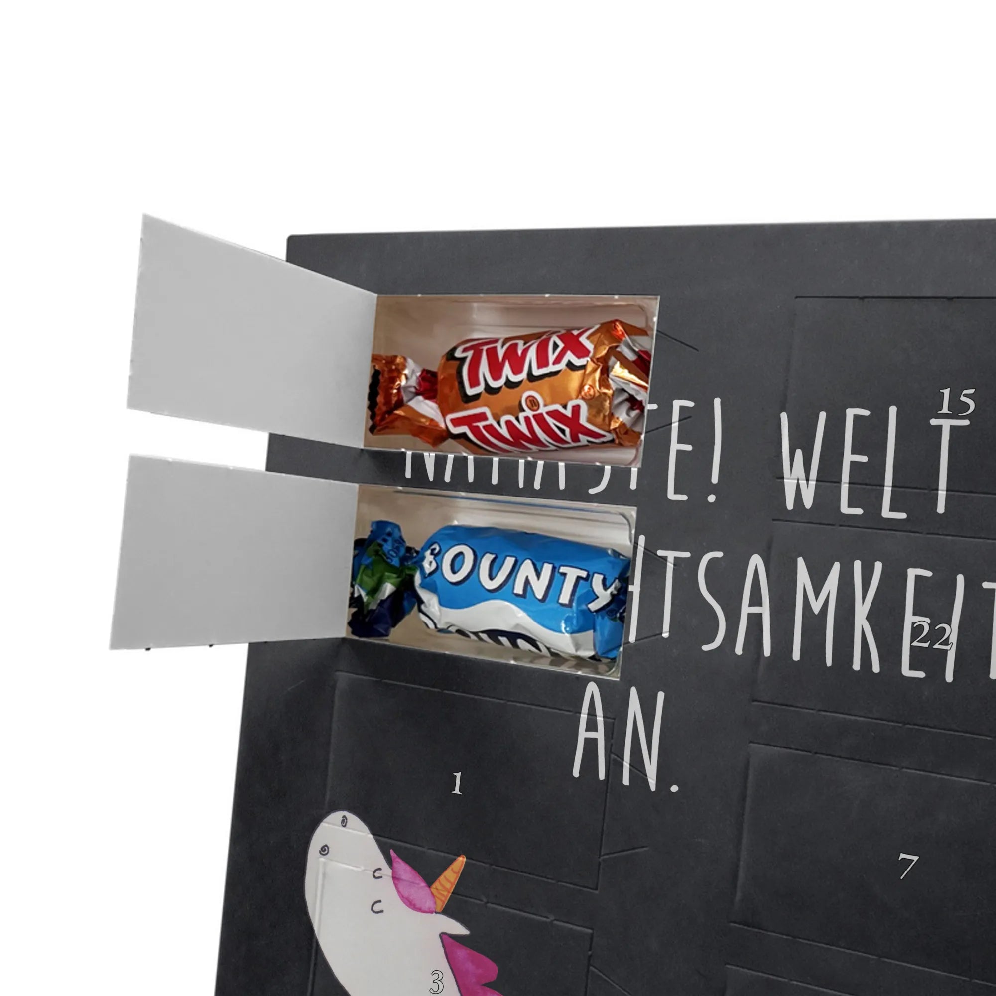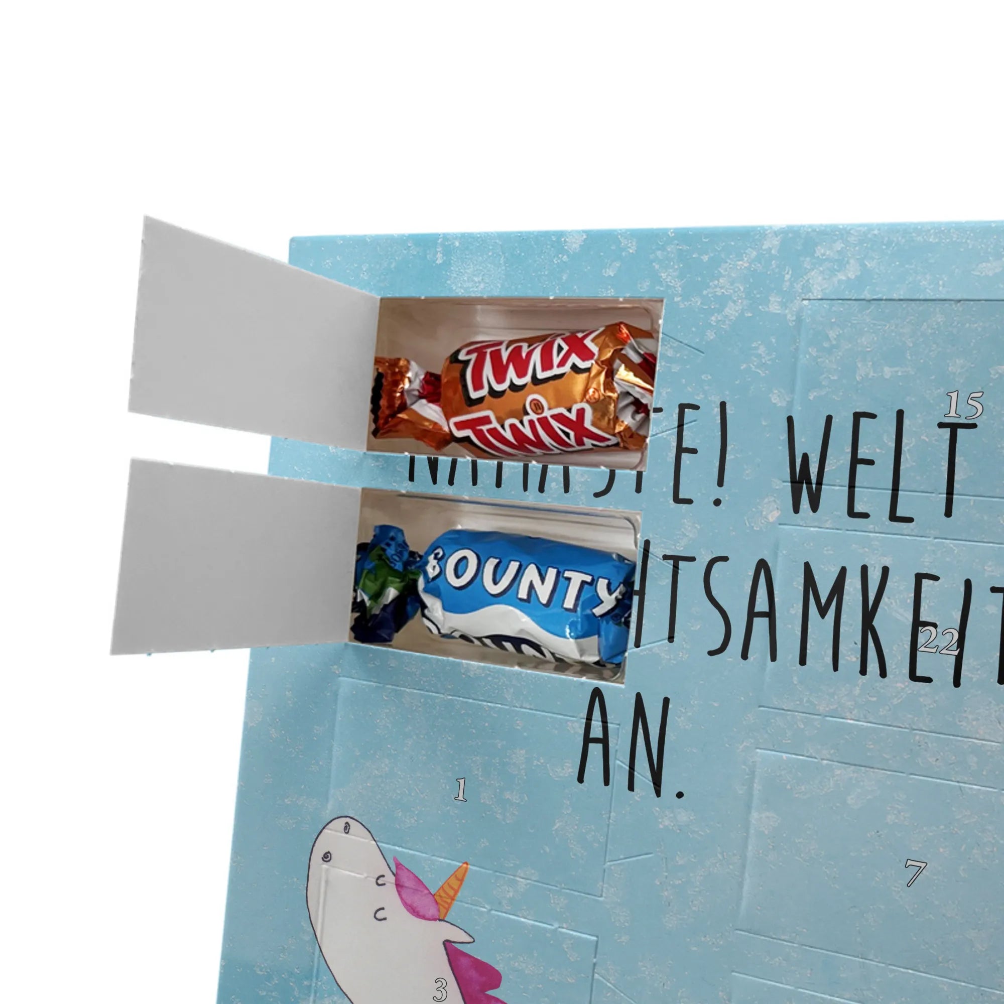 Charmanter Personalisierter Adventskalender mit Schoko-Foto von Mr. & Mrs. Panda – eine liebevolle Art, die Adventszeit zu personalisieren. Der Kalender ist mit den typischen Mr. & Mrs. Panda Motiven und herzlichen Sprüchen bedruckt; du kannst die Vorderseite mit deinem Lieblingsfoto gestalten. Achte auf eine hohe Auflösung deines Fotos, damit das Druckbild schön scharf wird, und kontrolliere den Bildausschnitt, damit keine wichtigen Details verloren gehen. Bitte lade nur Bilder hoch, für die du die Bildrechte besitzt oder eine Erlaubnis zur Nutzung vorliegt. Die Verarbeitung ist hochwertig: brillante Druckqualität, seidenmatte Oberflächenveredelung und bedruckte Seitenflächen für ein rundes Design. Maße: 325 mm x 225 mm x 27 mm. Der Kalender kann aufgehängt oder aufgestellt werden – ganz nach Belieben. Wichtig: Die Fotos werden nicht nachbearbeitet oder zugeschnitten; personalisierte Foto-Artikel sind vom Widerruf ausgenommen. Gefüllt ist der Adventskalender mit Celebrations Schokolade – 24 feine Füllungen in 8 verschiedenen Sorten (Maltesers, Mars, Snickers, Twix, Milky Way, Bounty, Galaxy, Galaxy Caramel). Ein persönliches Geschenk, das Erinnerungen und Genuss wunderbar verbindet.