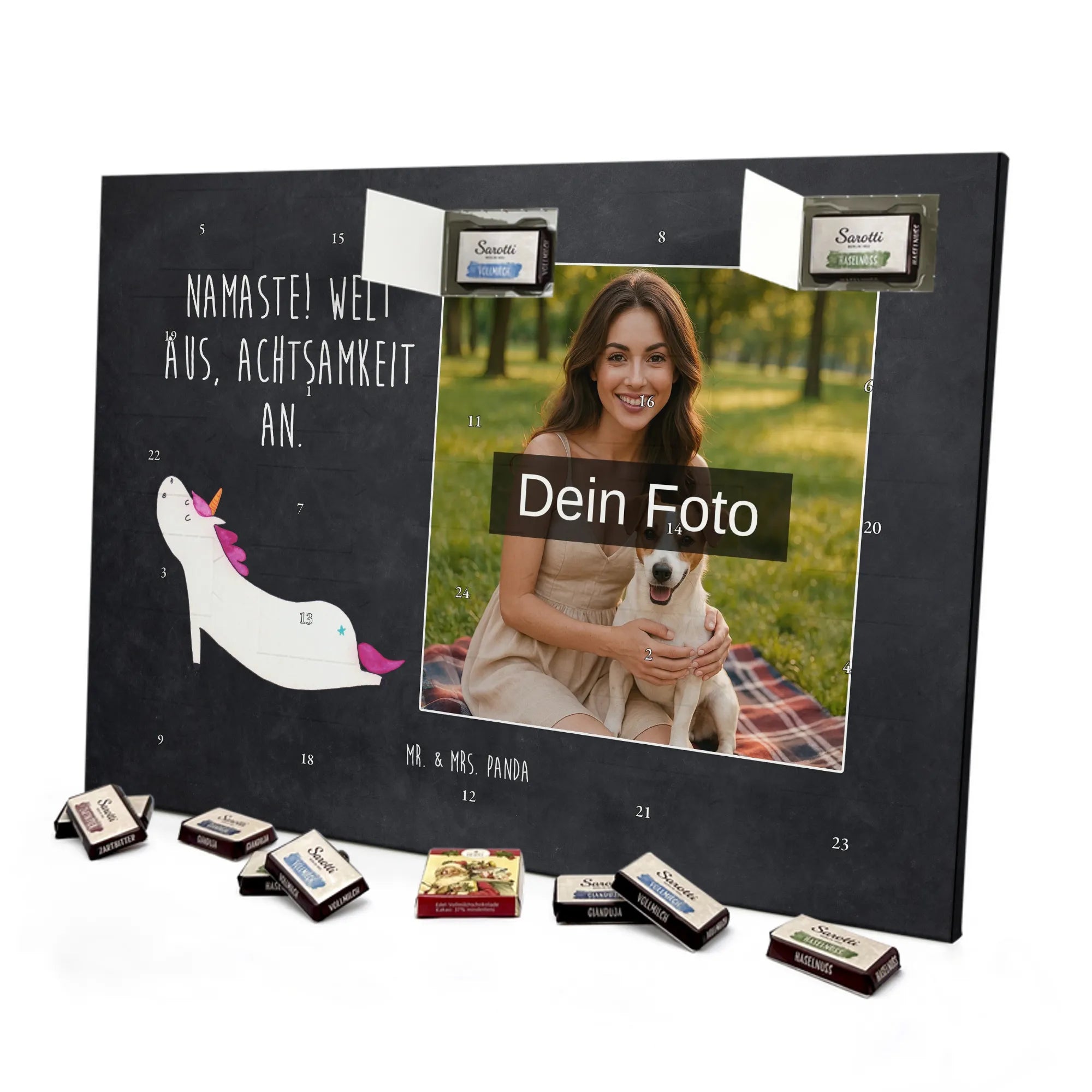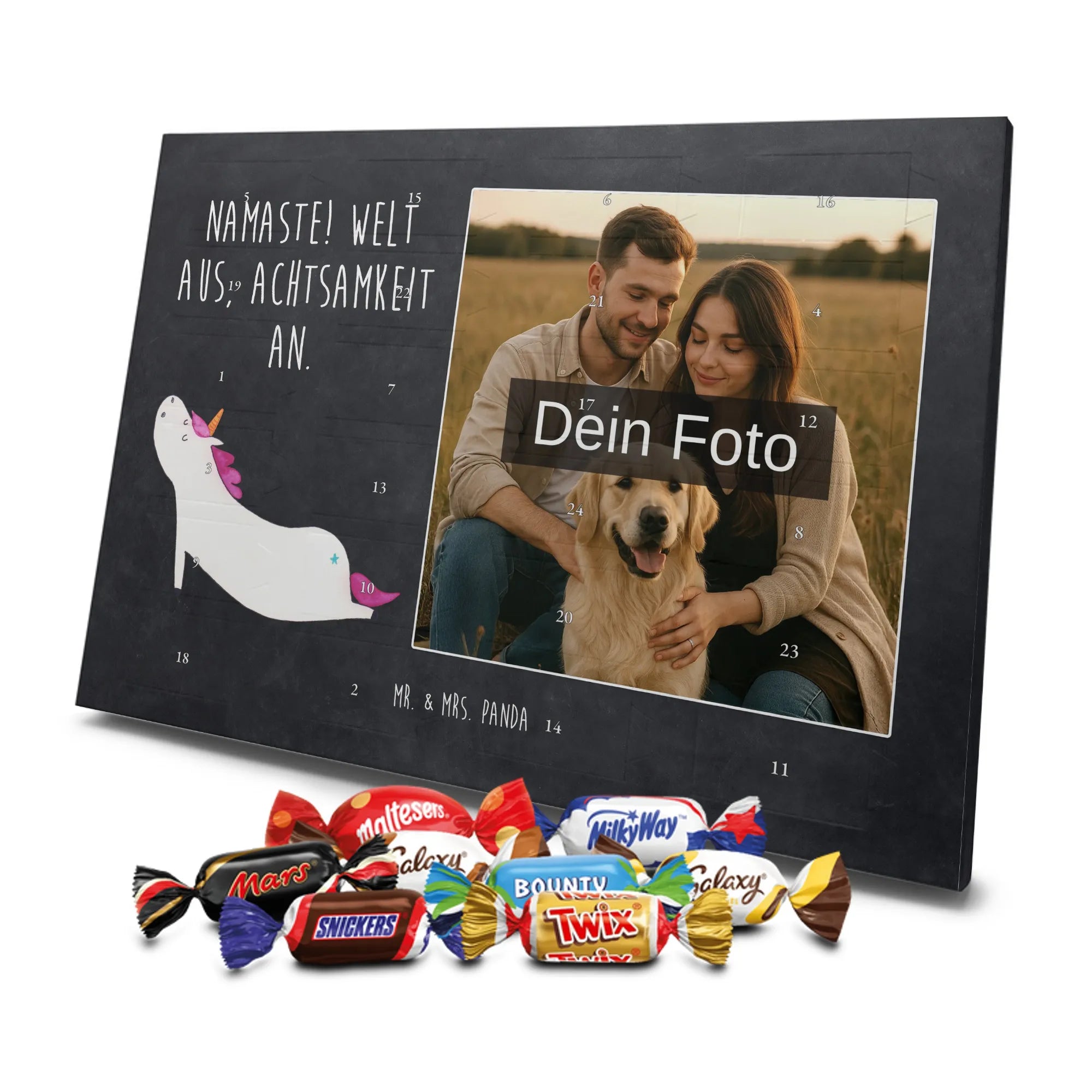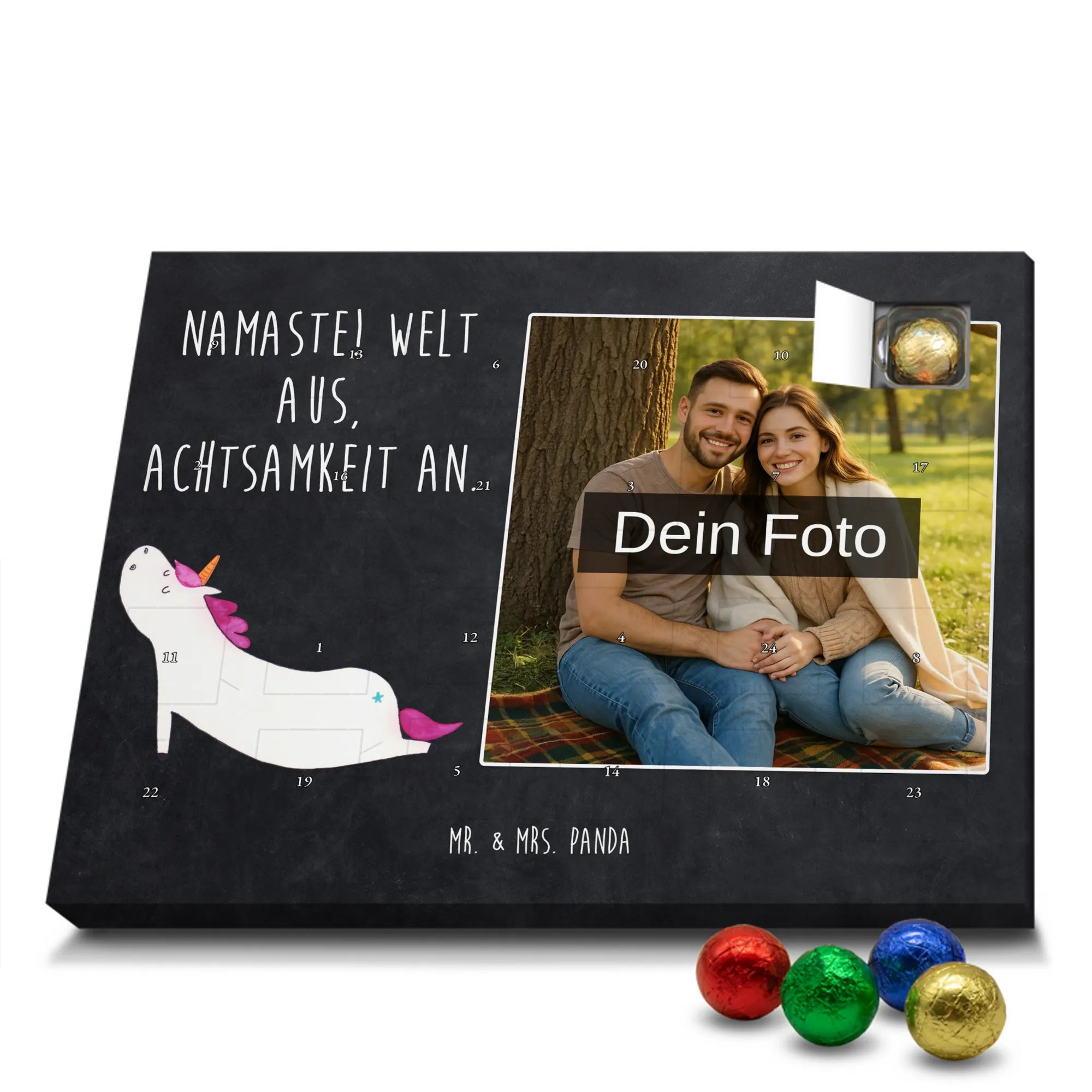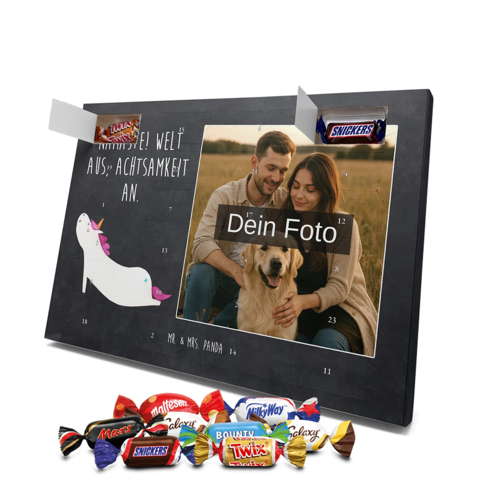 Liebevoller Foto Adventskalender personalisiert von Mr. & Mrs. Panda – der perfekte Begleiter durch die Adventszeit. Bedruckt mit unseren beliebten Motiven & Sprüchen, kannst du den Kalender mit einem persönlichen Foto versehen. Achte auf hohe Auflösung und einen passenden Bildausschnitt, damit das Motiv optimal zur Geltung kommt. Verwende nur Bilder, für die du die Rechte besitzt, um rechtliche Probleme zu vermeiden. Der Kalender bietet brillante Druckqualität, eine seidenmatte Oberflächenveredelung und bedruckte Seitenflächen. Maße: 233 mm x 178 mm x 24 mm. Besonderheit: Er lässt sich sowohl aufstellen als auch aufhängen. Bitte beachte: Die Fotos werden weder aufbereitet noch zugeschnitten, daher ist eine Rücknahme bei personalisierten Foto-Artikeln ausgeschlossen. Gefüllt mit MARKENNAMEN Schokolade und leckeren Schokoladenkugeln. Hinweis: Kann Spuren von Haselnüssen, Mandeln, Gluten und Soja enthalten. Kühl und trocken lagern. Schenke persönliche Vorfreude – jeden Tag ein kleines Highlight mit Schokolade und Erinnerungen.