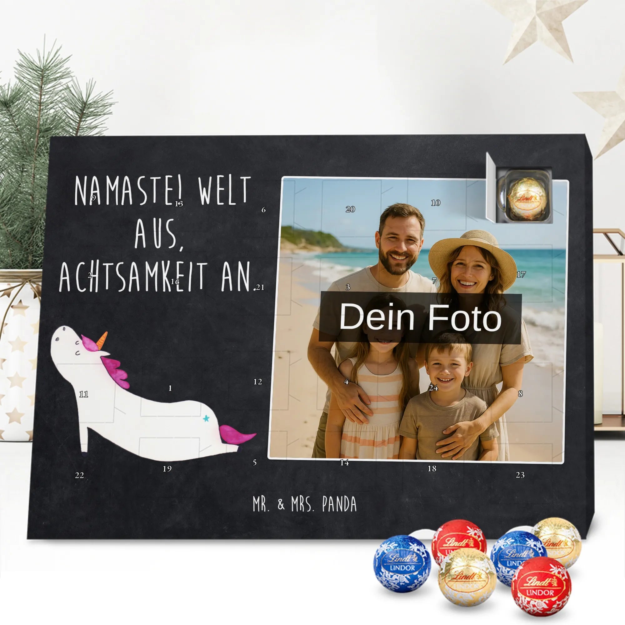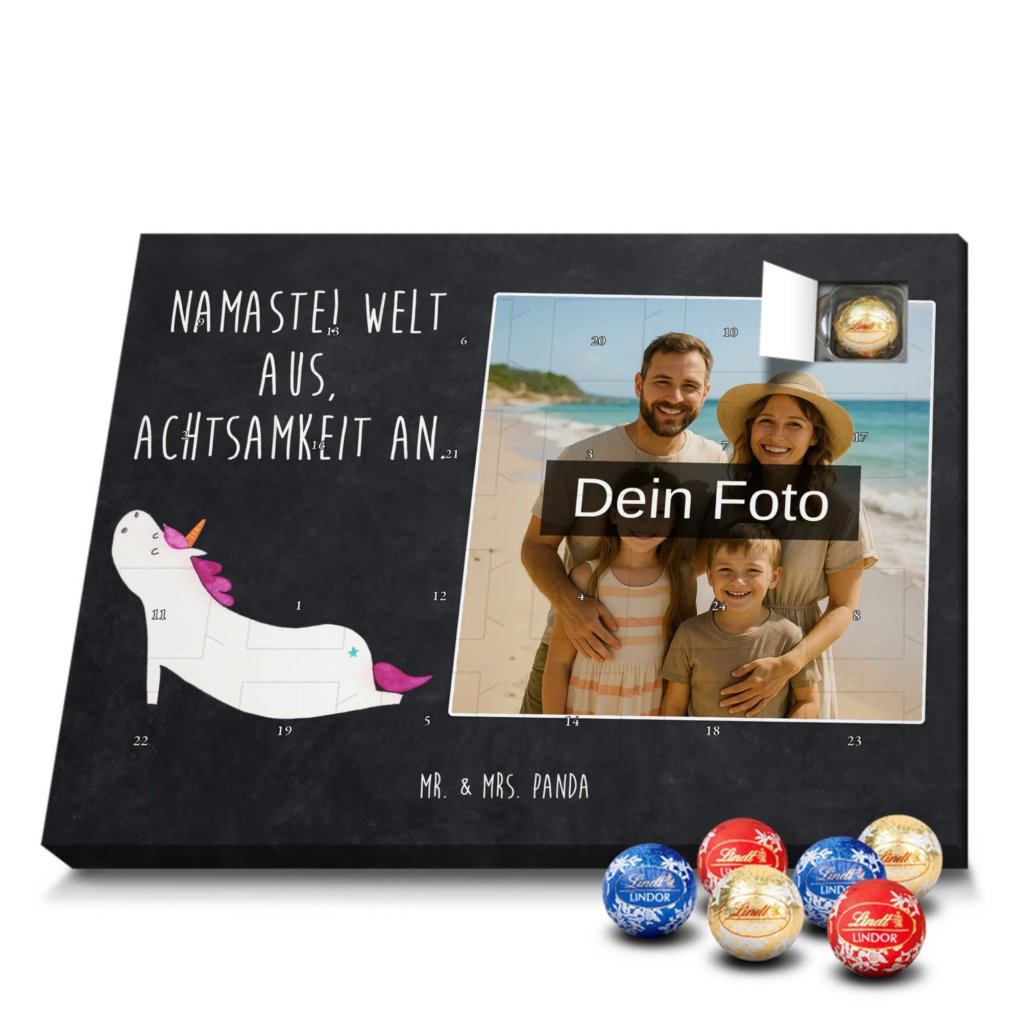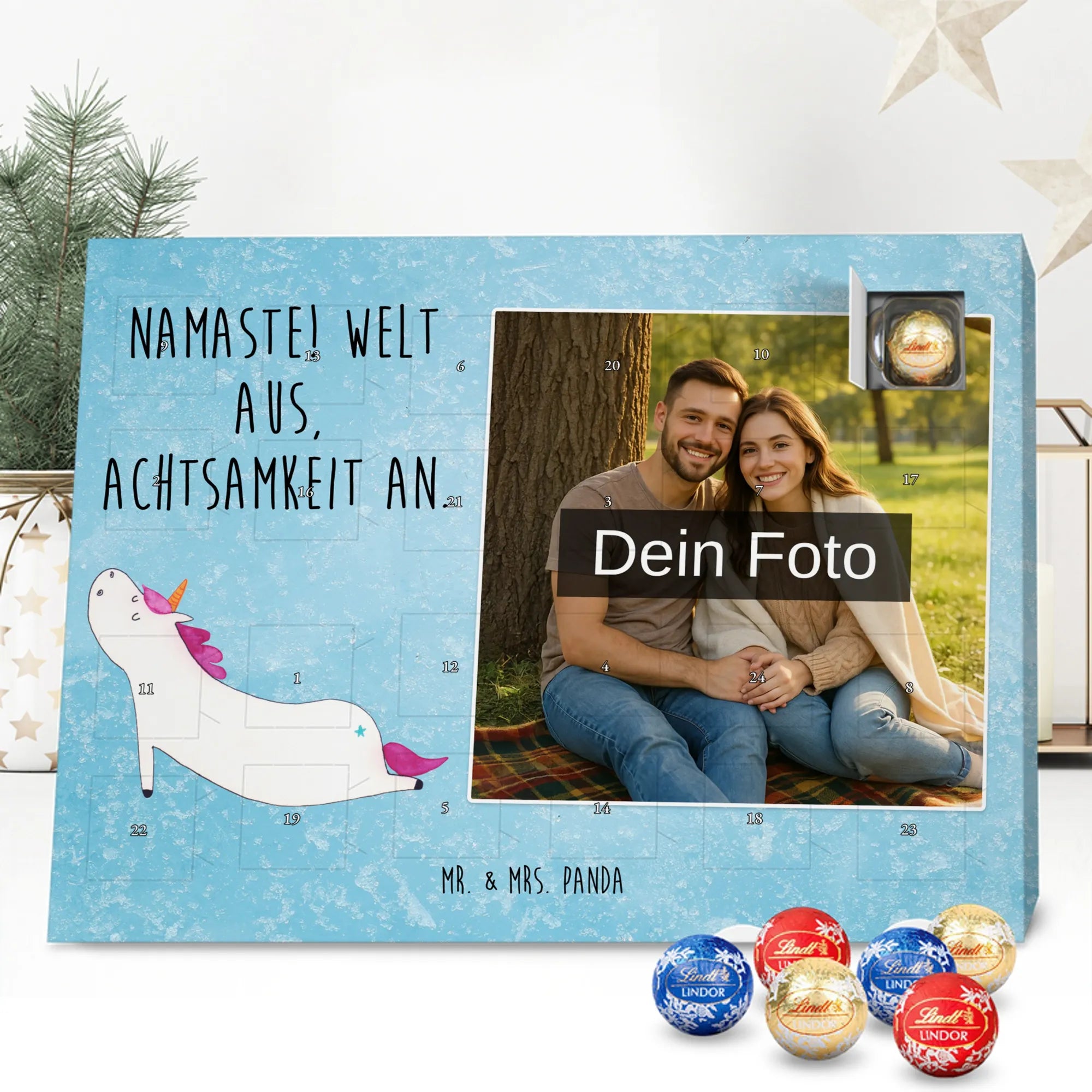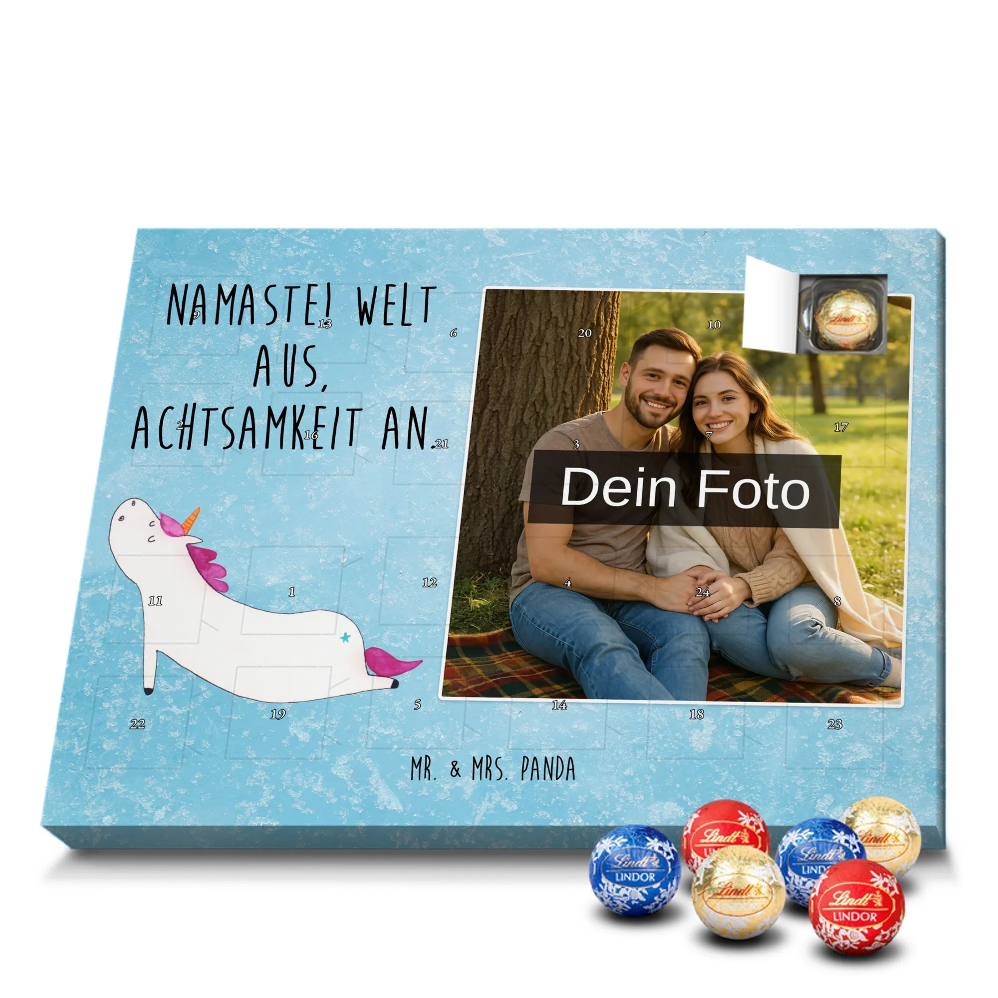 Wunderschöner Personalisierter Schoko Foto Adventskalender von Mr. & Mrs. Panda – perfekt zum Verschenken oder zum Verwöhnen. Dieser Adventskalender verbindet liebevolle Mr. & Mrs. Panda-Motive und Sprüche mit deinem persönlichen Foto auf der Vorderseite. Die hochwertige Verarbeitung mit seidenmatter Oberflächenveredelung sorgt für brillante Farben und eine edle Haptik, die man gerne anfasst. Bedruckte Seitenflächen und die stabile Ausführung machen den Kalender zum echten Hingucker in der Adventszeit. Bitte achte auf eine hohe Auflösung deines Fotos, damit das Druckergebnis klar und scharf wird, und wähle einen passenden Bildausschnitt, damit keine wichtigen Details abgeschnitten werden. Lade nur Bilder hoch, bei denen du die Rechte besitzt oder die Erlaubnis hast, besonders bei Fotos mit Personen. Wichtig: Die Fotos werden weder aufbereitet noch zugeschnitten – eine Rücknahme bei personalisierten Foto-Artikeln ist ausgeschlossen. Der Kalender kann aufgehängt oder aufgestellt werden, so wie es dir gefällt. Maße: 233 mm x 178 mm x 24 mm. Gefüllt mit Lindt Lindor Markenschokolade: 24 einzeln verpackte Markenschokoladen Kugeln in drei Sorten (Vollmilch, Feinherb, Weiße Schokolade). Zutatenhinweis: Kann Haselnüsse und Mandeln enthalten. Ein liebevoller, personalisierter Adventsmoment von Mr. & Mrs. Panda.