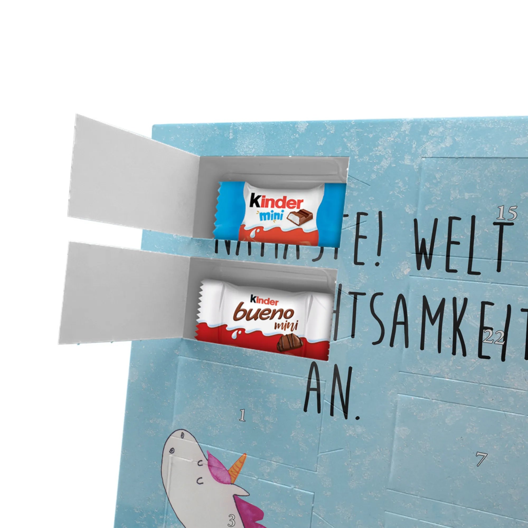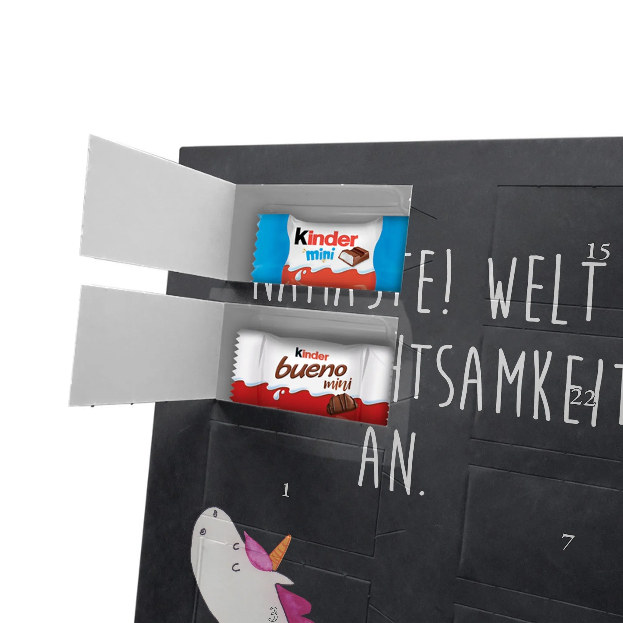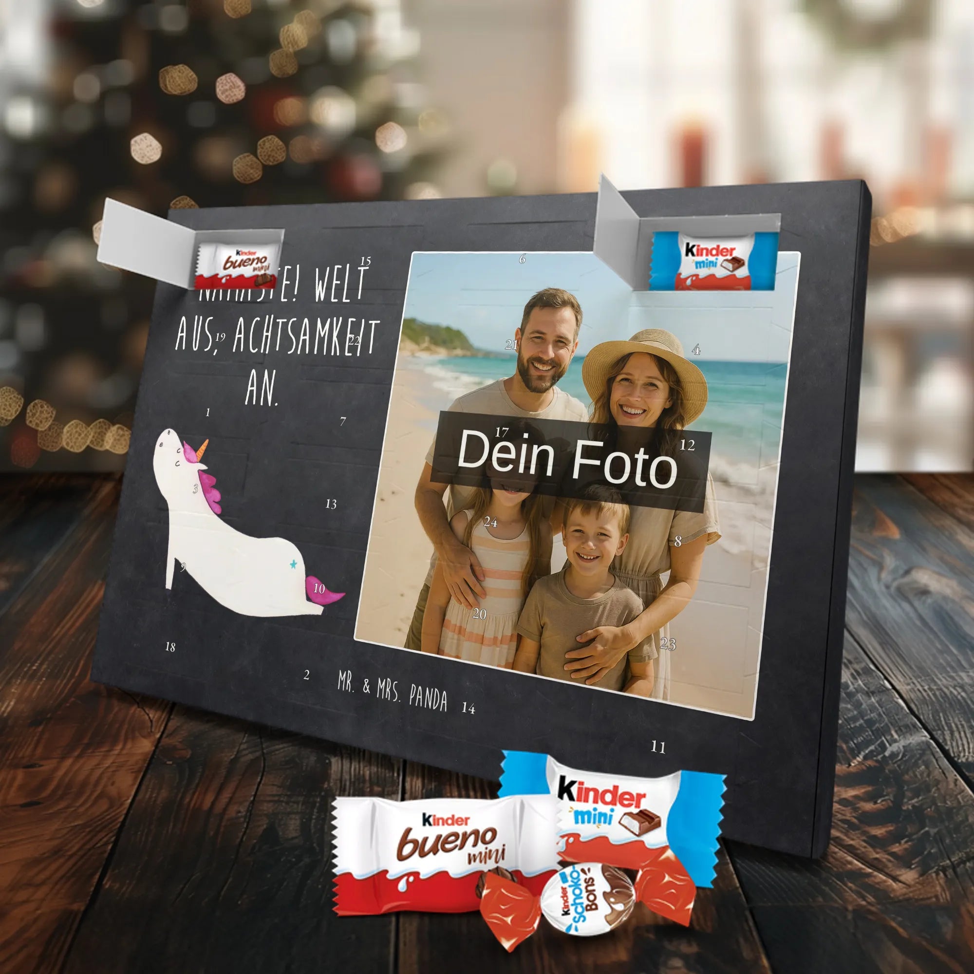 Schoko Foto Adventskalender personalisiert – ein zauberhaftes Produkt von Mr. & Mrs. Panda, das Erinnerungen und Süßigkeiten kombiniert. Gestalte die Vorderseite mit einem persönlichen Foto und überrasche deine Liebsten jeden Tag im Advent. Unsere Designs mit niedlichen Illustrationen und liebevollen Sprüchen runden das Foto perfekt ab. Bitte lade ein hochauflösendes Foto hoch und prüfe den Bildausschnitt, damit das Druckbild optimal wird. Verwende nur Bilder, für die du die Rechte besitzt oder die Freigabe der abgebildeten Personen vorliegt. Beachte: Wir schneiden oder bearbeiten die Fotos nicht; personalisierte Foto-Artikel sind von der Rückgabe ausgeschlossen. Der Kalender besticht durch brillante Druckqualität, seidenmatte Oberflächenveredelung und bedruckte Seitenflächen für ein hochwertiges Finish. Maße: 355 mm x 245 mm x 11 mm. Du kannst den Kalender aufstellen oder ihn an der Wand aufhängen. Gefüllt mit kinder® Schokolade – inklusive kinder® Schoko-Bons, kinder® Bueno mini und kinder® Schokolade mini. Ein warmherziges, persönliches Geschenk mit dem typischen Mr. & Mrs. Panda Flair, das Vorfreude und Geschmack vereint.