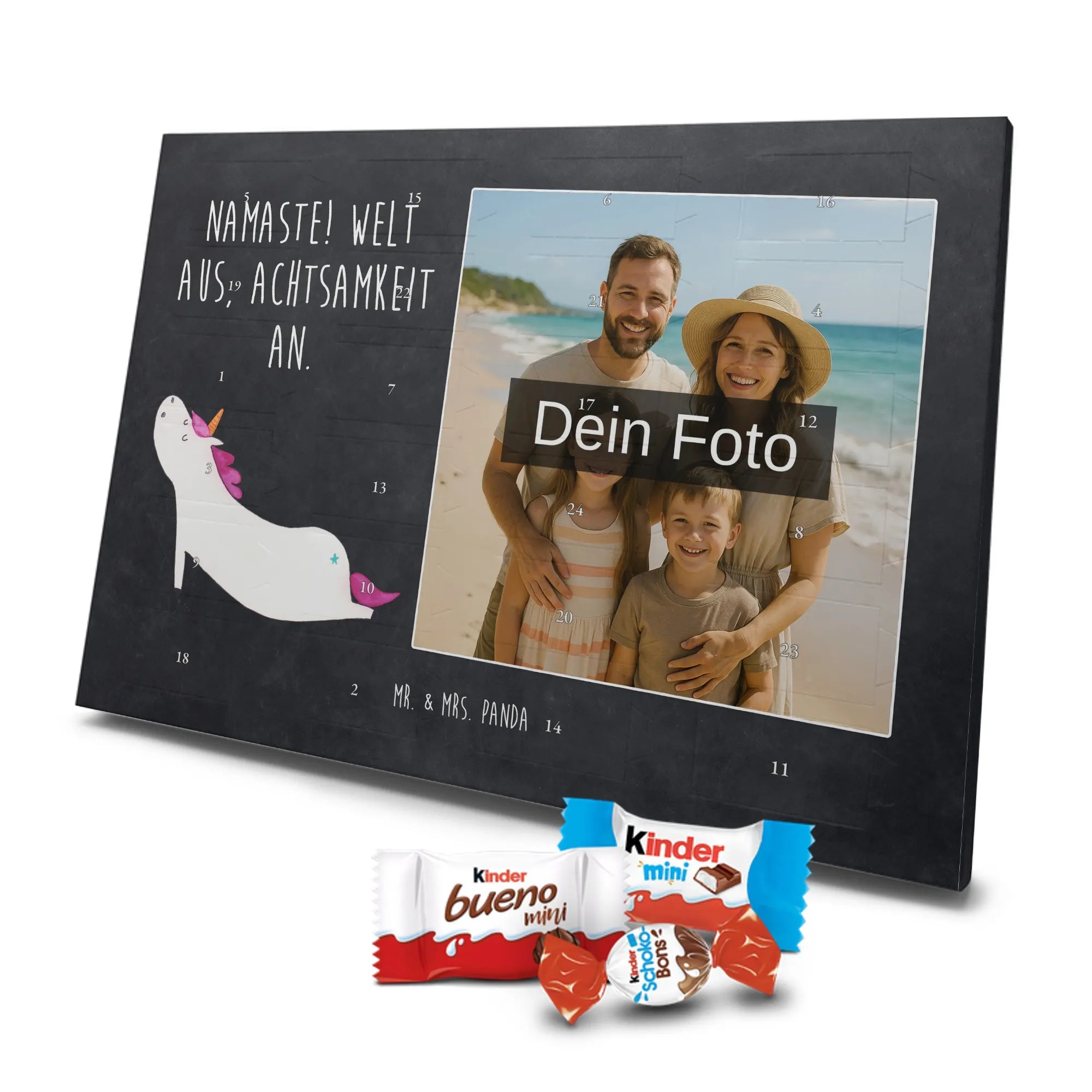 🐼 Personalisierter Schoko-Foto-Adventskalender mit deinem Bild, Mr. & Mrs. Panda Motiven und gefüllt mit kinder® Schokolade.