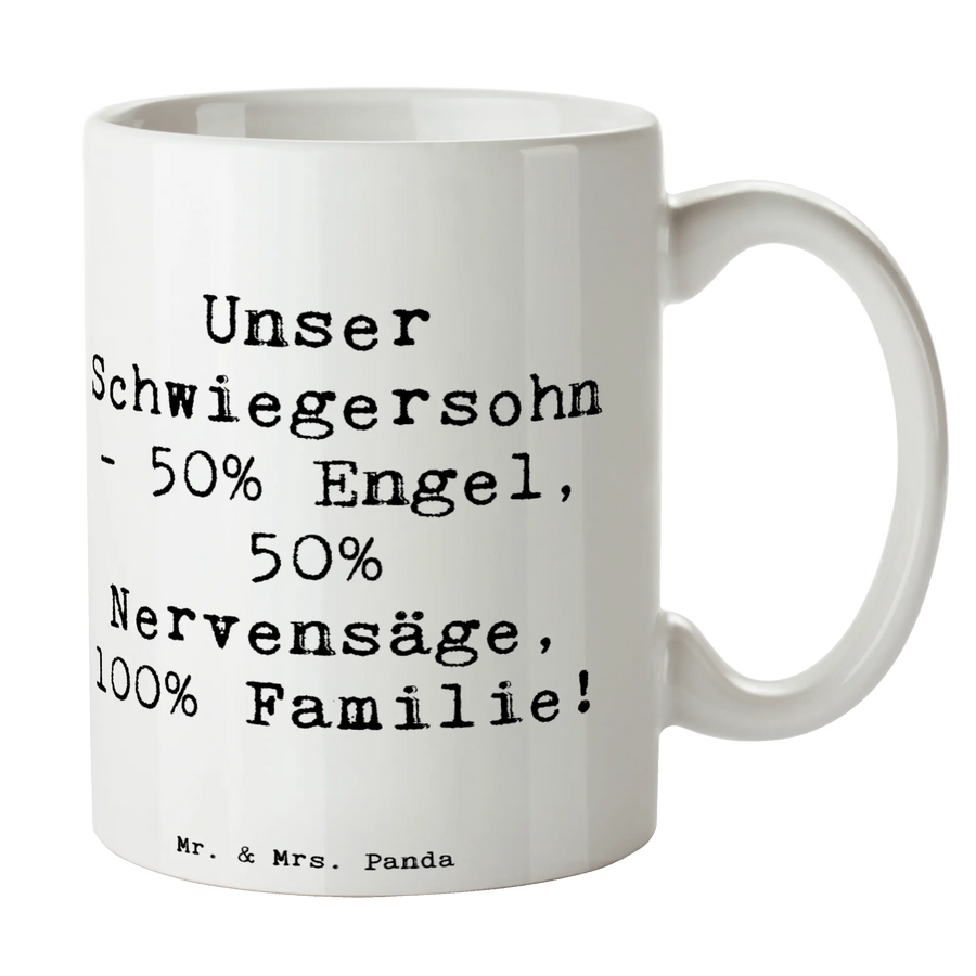 Mug Saying Unser Schwiegersohn. 50% Engel, 50% Nervensäge, 100% Familie! - White