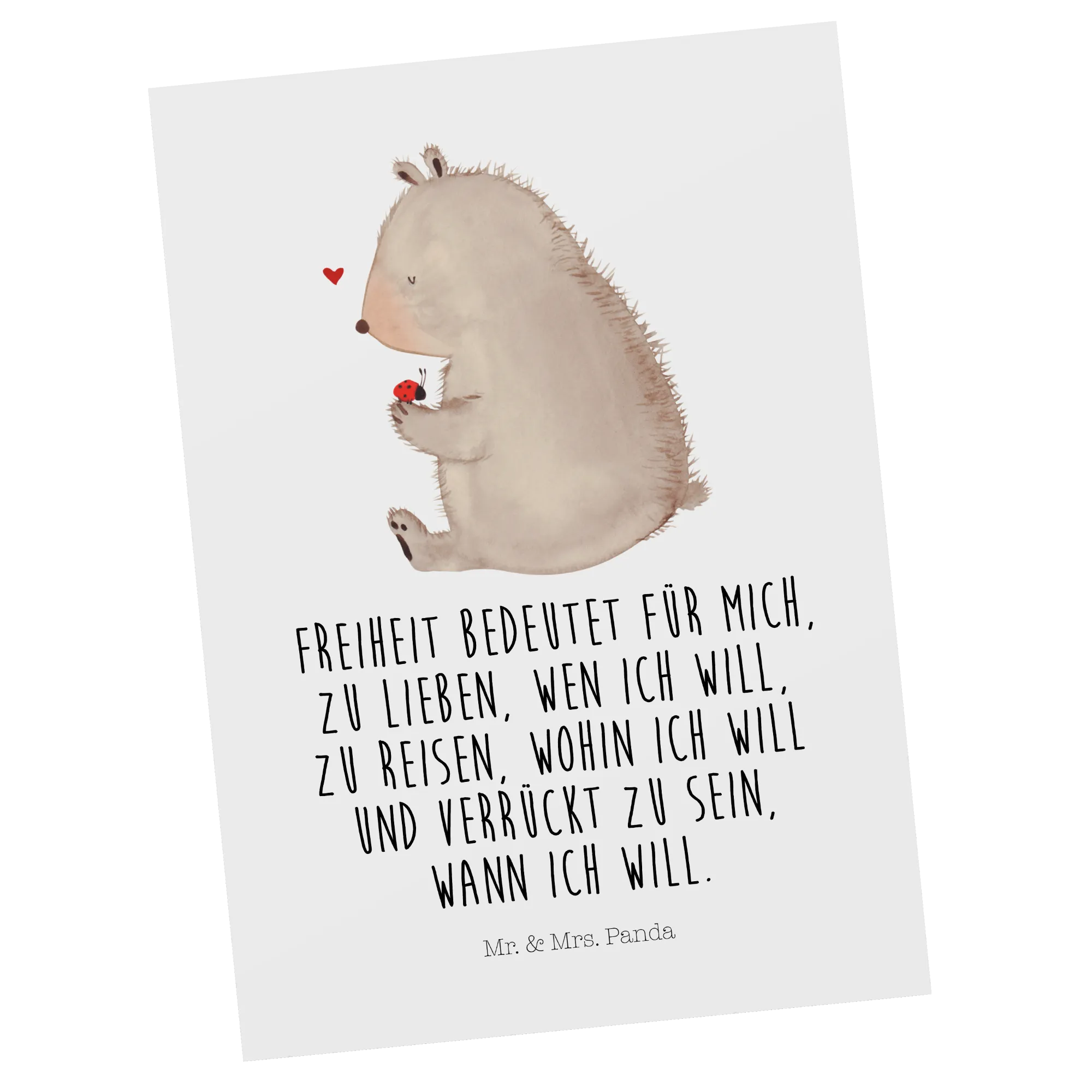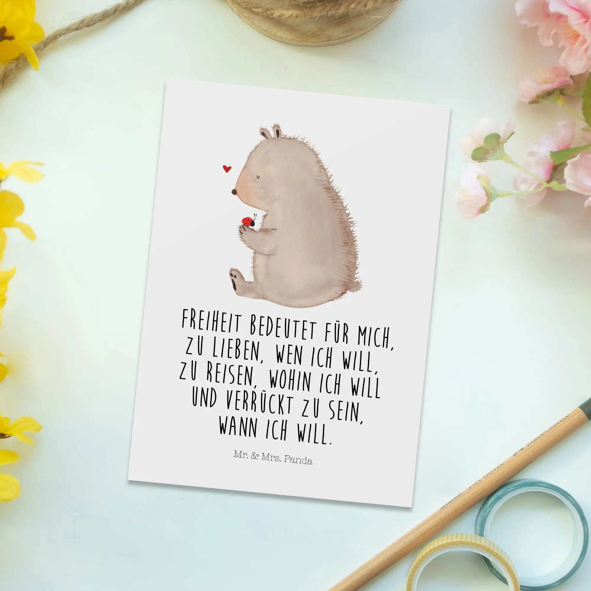 Give this postcard to someone who needs a little motivation in their life; it serves as a reminder that 'life is beautiful.' Suitable for individuals who love bears, teddy bears, and unique gift cards, this postcard is a wonderful keepsake as well. Thanks to its blank back, you can easily express your own words of affection or motivation. Plus, the matte finish gives you a smooth canvas for all your thoughts and doodles! It can be beautifully adorned with messages that highlight what freedom means to you, as the slogan suggests: "Freiheit bedeutet für mich, zu lieben, wen ich will, zu reisen, wohin ich will, und verrückt zu sein, wann ich will."