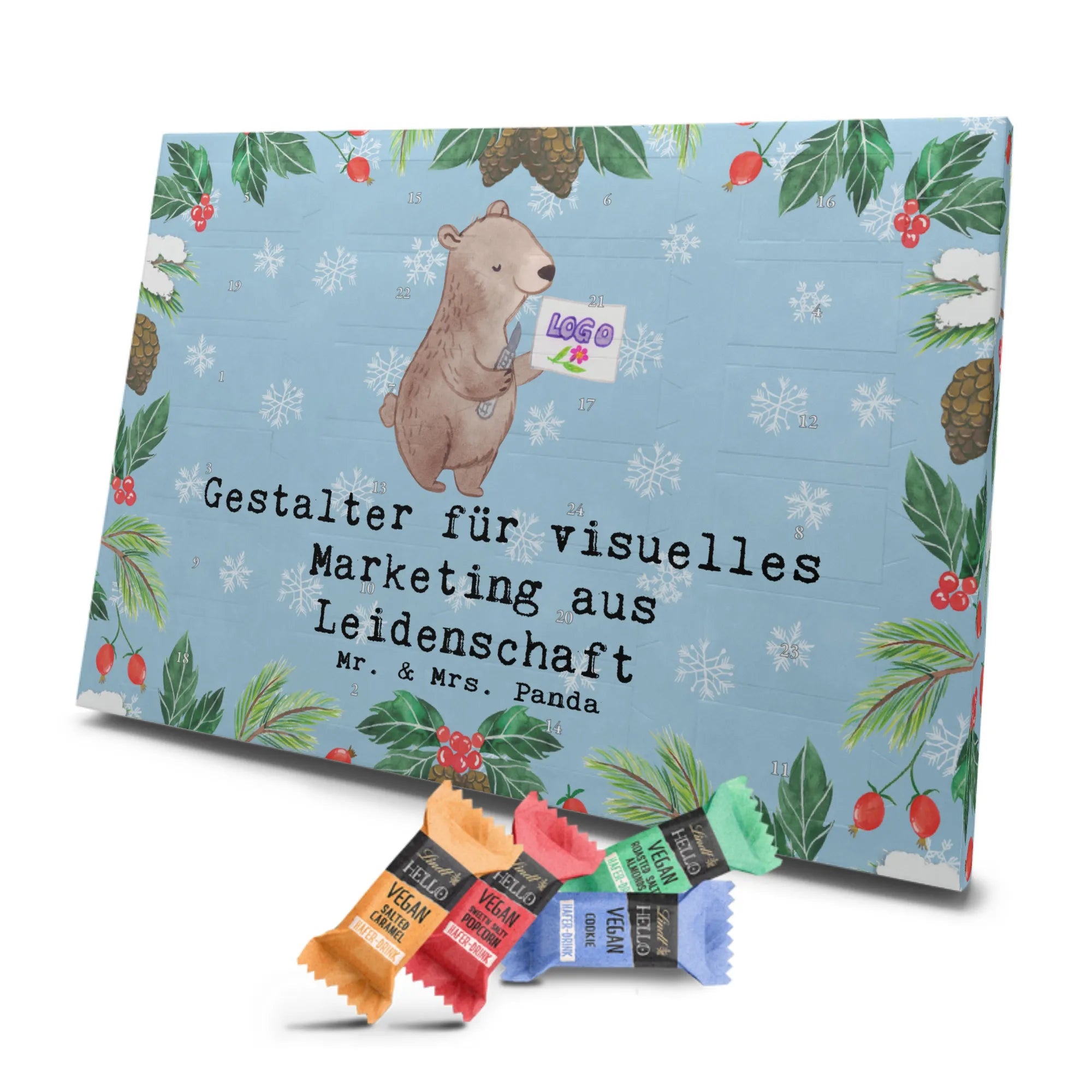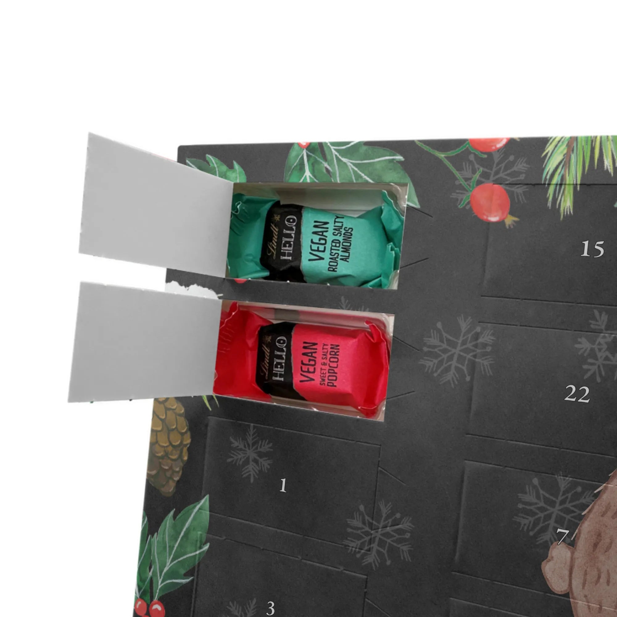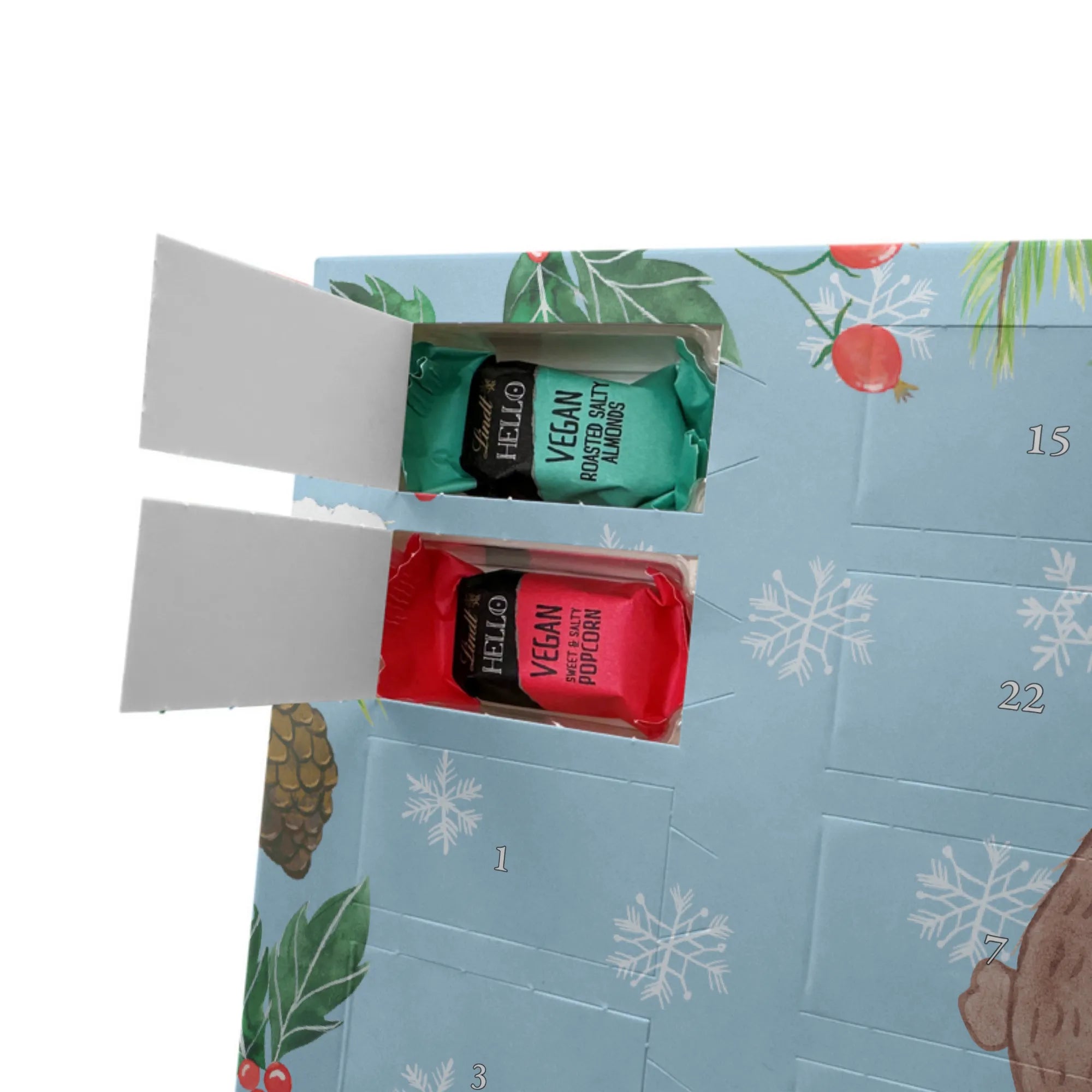 Immerse yourself in the enchanting world of the Vegan Advent Calendar by Mr. & Mrs. Panda, lovingly and carefully crafted. This unique chocolate advent calendar captivates with beautiful designs and inspiring quotes, adding a special touch to each day in Advent. High-quality vegan branded chocolate in four irresistible flavors - Salted Caramel, Cookies, Roasted Salted Almonds, Sweet and Salty Popcorn - awaits discovery. Each of the 24 mini sticks is individually wrapped, promising a delightful treat to sweeten the days leading up to Christmas.
