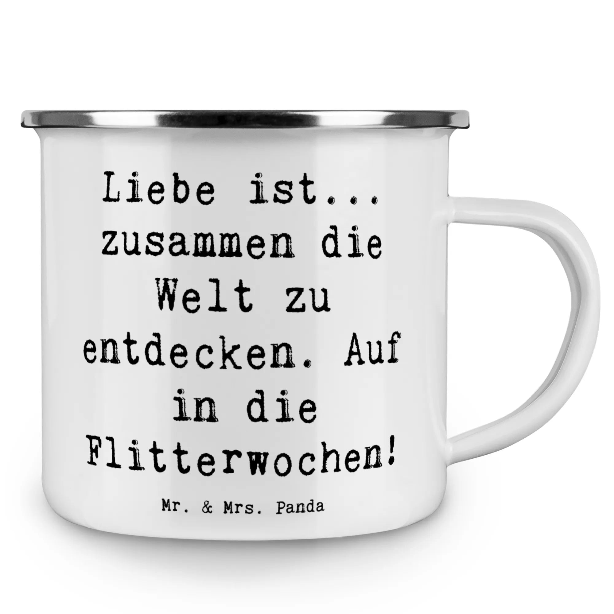 Enamel camping mug Saying Liebe ist... zusammen die Welt zu entdecken. Auf in die Flitterwochen!