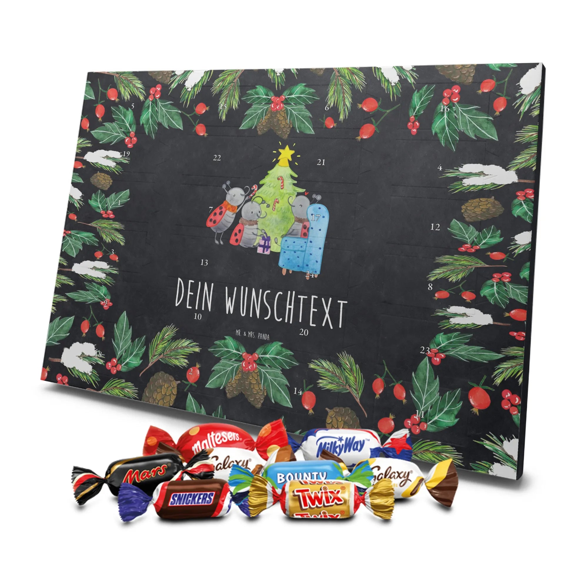 This vibrant motif captures the essence of Christmas through the eyes of three charming ladybugs. Surrounded by glimmering gifts, they find joy in decorating a magnificent Christmas tree, their little hearts full of cheer. The cozy atmosphere is perfumed with pine needles and the sweet scent of peppermint, inviting everyone into the warmth of this festive celebration. With every unwrapped gift, they remind us of the joy that comes from being together and sharing moments with loved ones. The slogan, 'Wir wünschen dir und deiner Familie wundervolle Weihnachtstage und einen guten Rutsch in ein magisches neues Jahr!', radiates happiness and wishes every family a joyful holiday season.