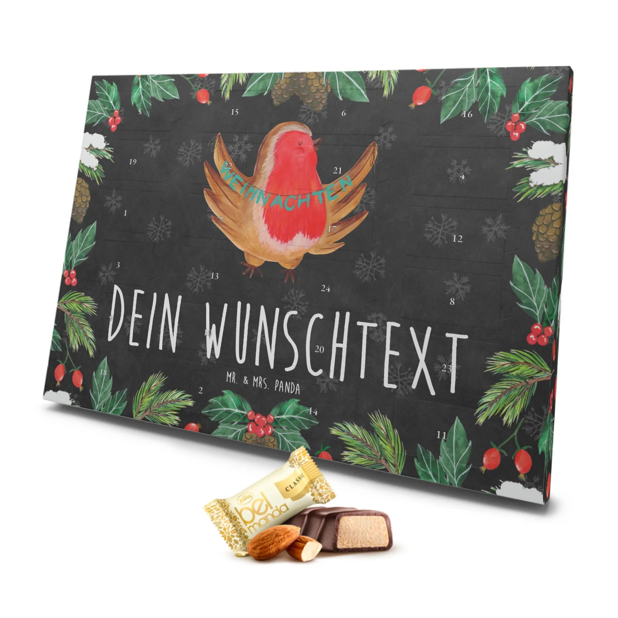 Der personalisierte Marzipan Adventskalender Rotkehlchen Weihnachten von Mr. & Mrs. Panda ist der perfekte Begleiter für die besinnliche Adventszeit.