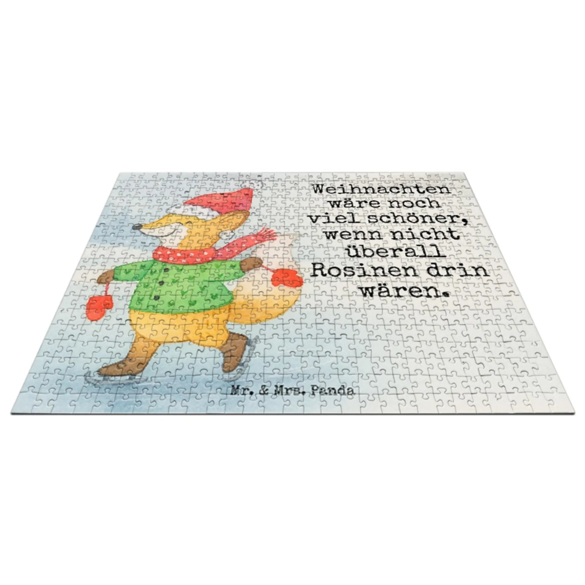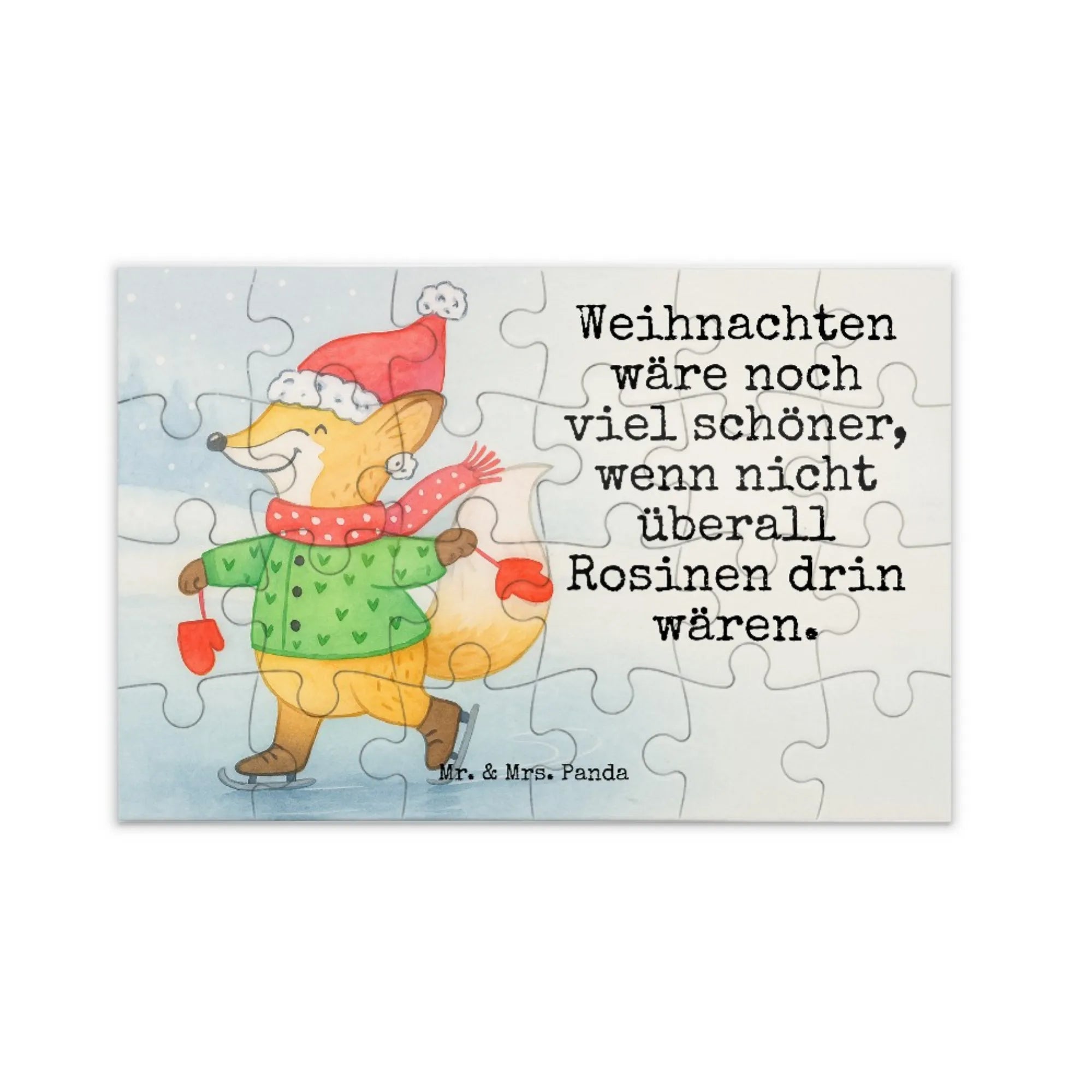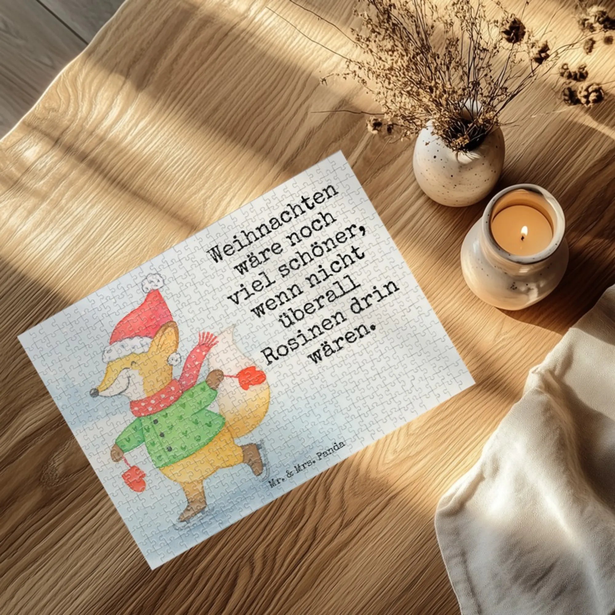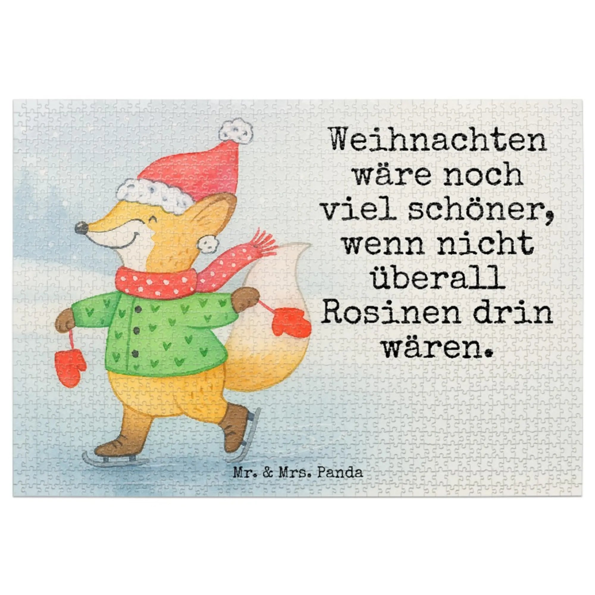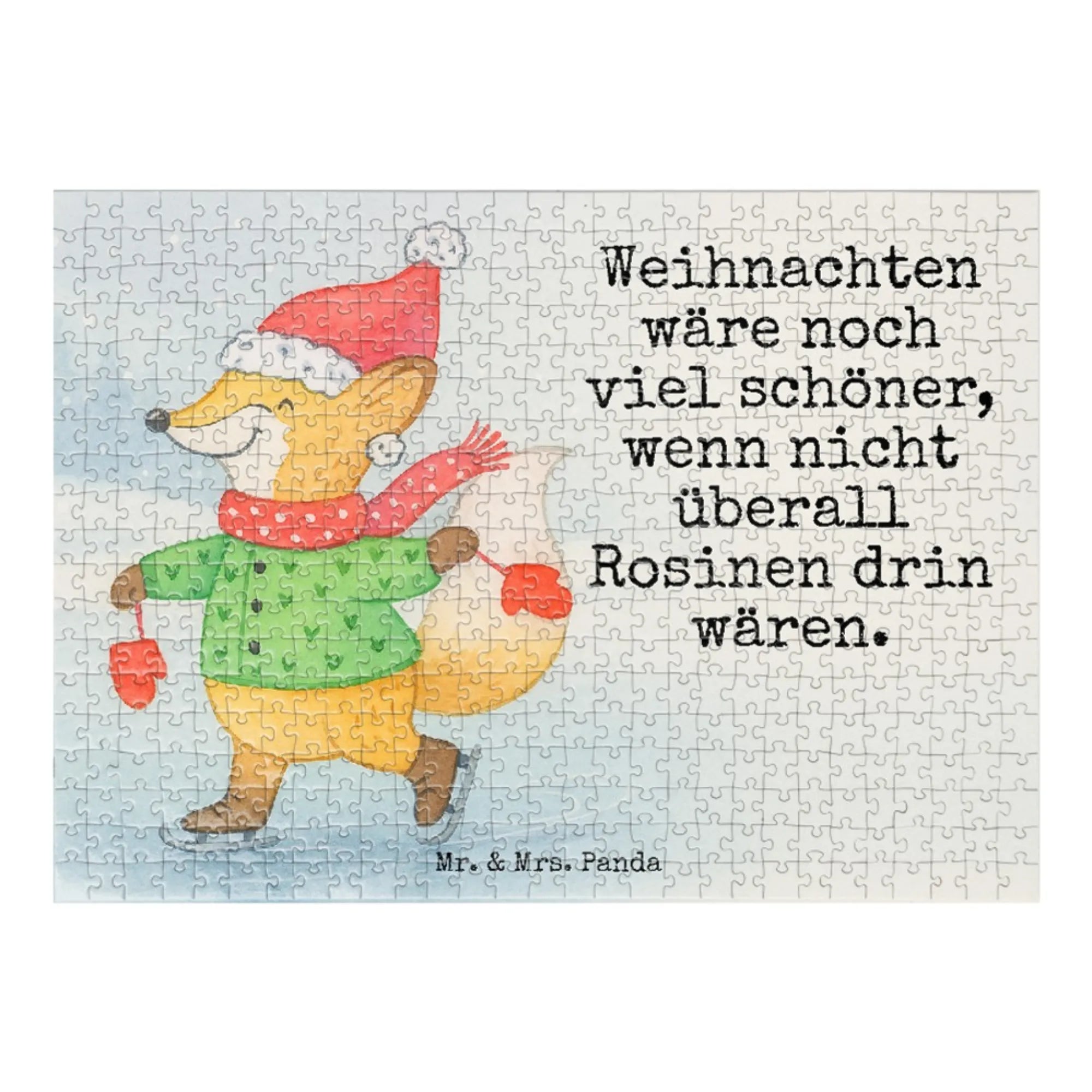 Unser Puzzle „Fuchs Schlittschuhe" aus der Winter Kollektion ist genau das Richtige für gemütliche Advents- und Weihnachtsabende. Das Motiv zeigt einen fröhlichen Fuchs in grünem Mantel mit herzförmigen Mustern, rotem Schal mit Punkten und einer passenden Weihnachtsmütze. Rote Fäustlinge baumeln an seiner Pfote, sein Blick strahlt Leichtigkeit und Freude aus. Der liebevoll platzierte Spruch „Weihnachten wäre noch viel schöner, wenn nicht überall Rosinen drin wären." sorgt für ein Schmunzeln und macht das Puzzle zum perfekten Geschenk mit Charme.